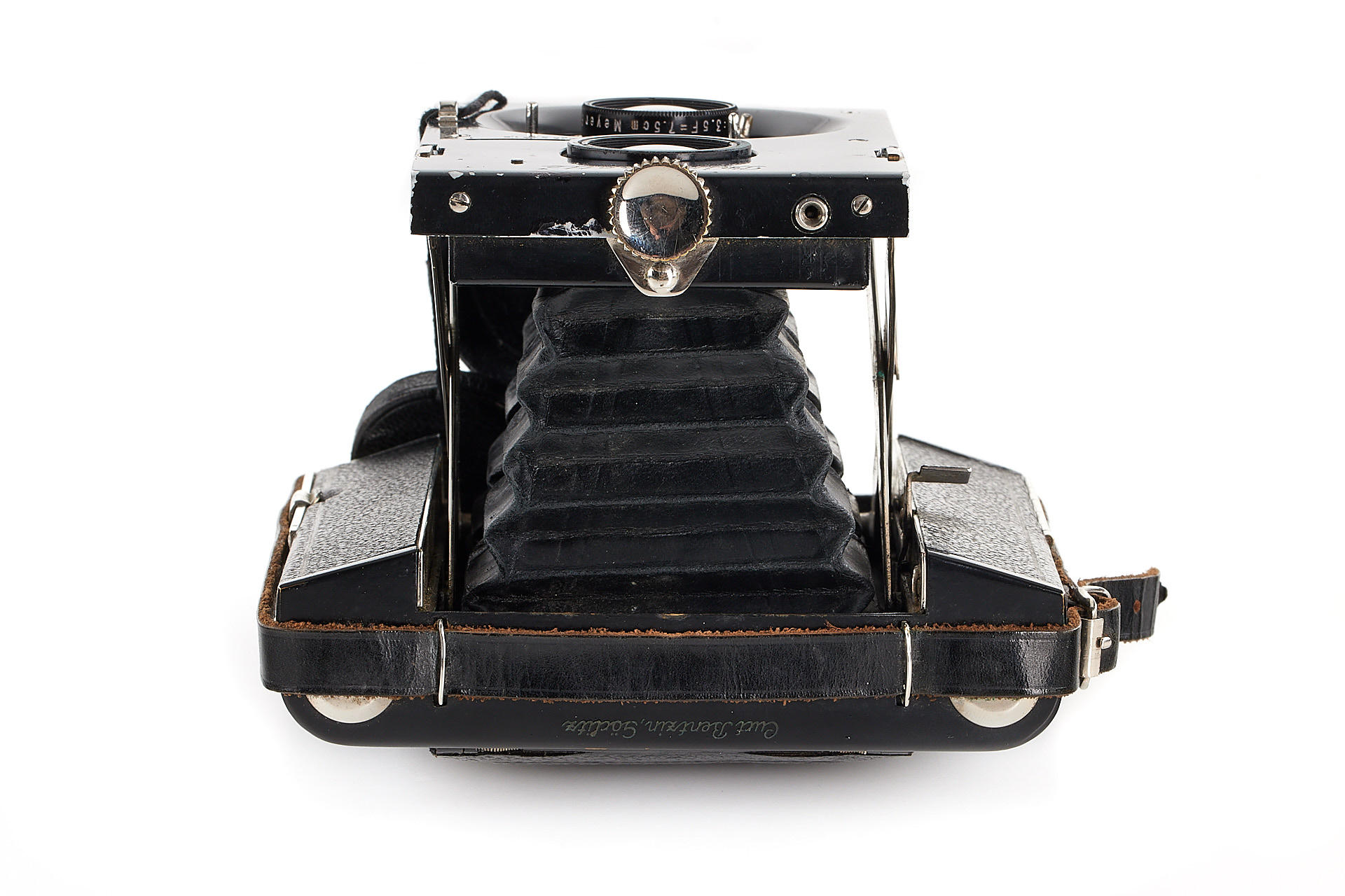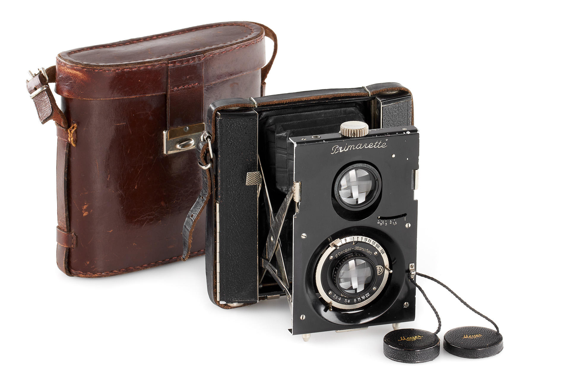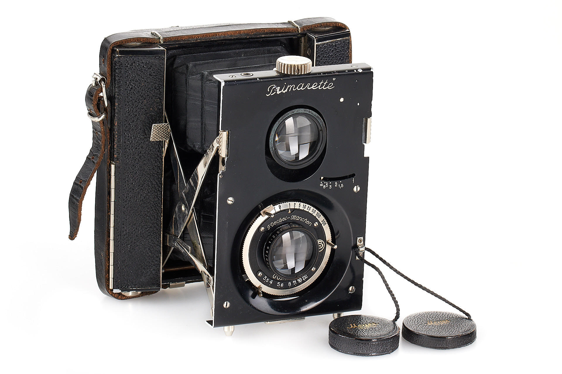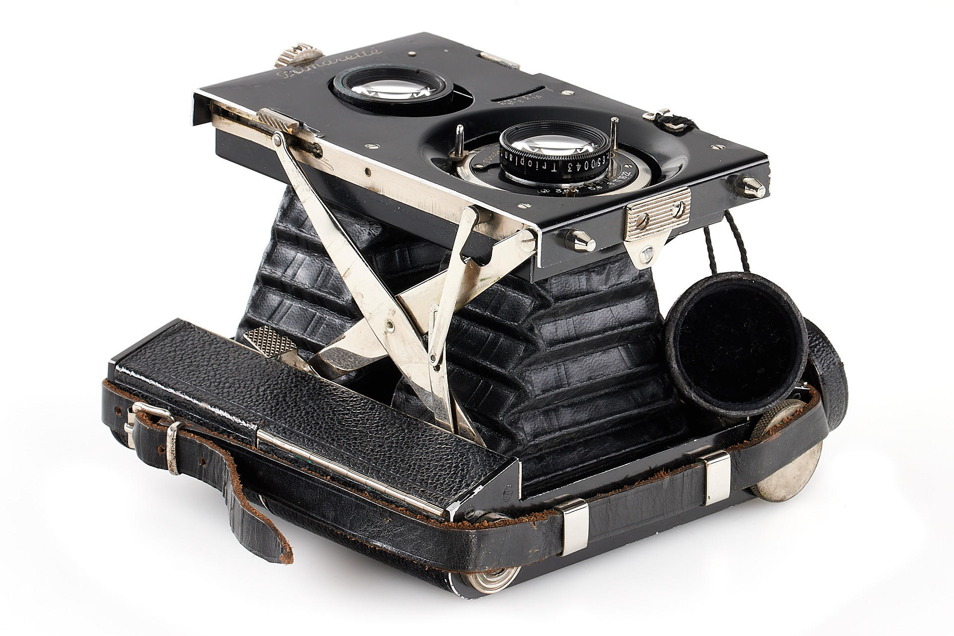 interesting and rare twin-lens folding camera in very good condition and working order, for 8 exposures 4x6.5cm on 127 film, separate bellows for taking and viewing lens, second version with body shutter release and ground glass magnifier, with Trioplan 3.5/7.5cm no.650043 mounted in compur shutter, with leather strap, leather case and both lens caps