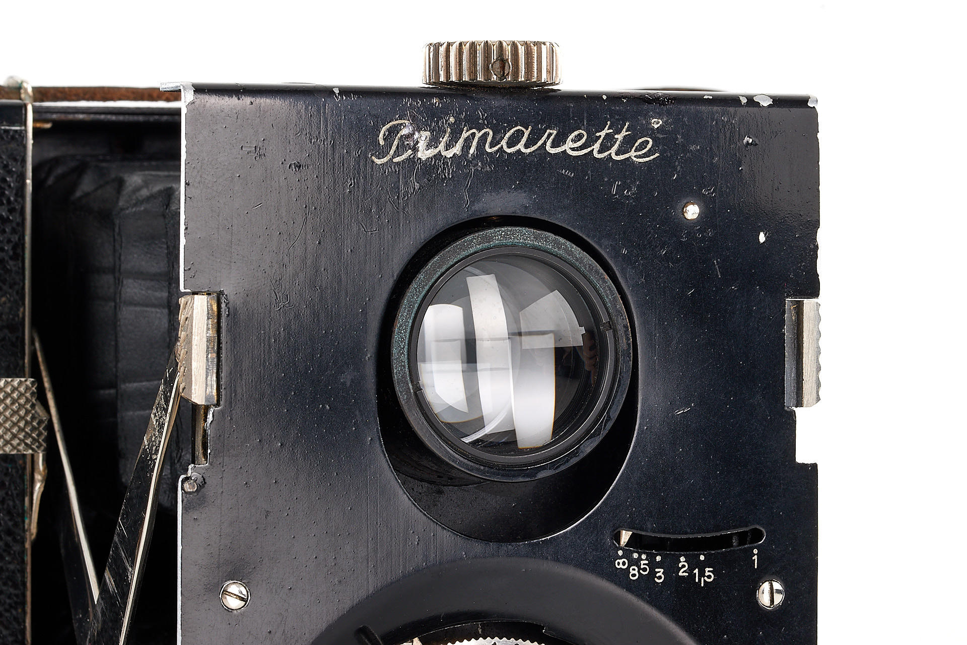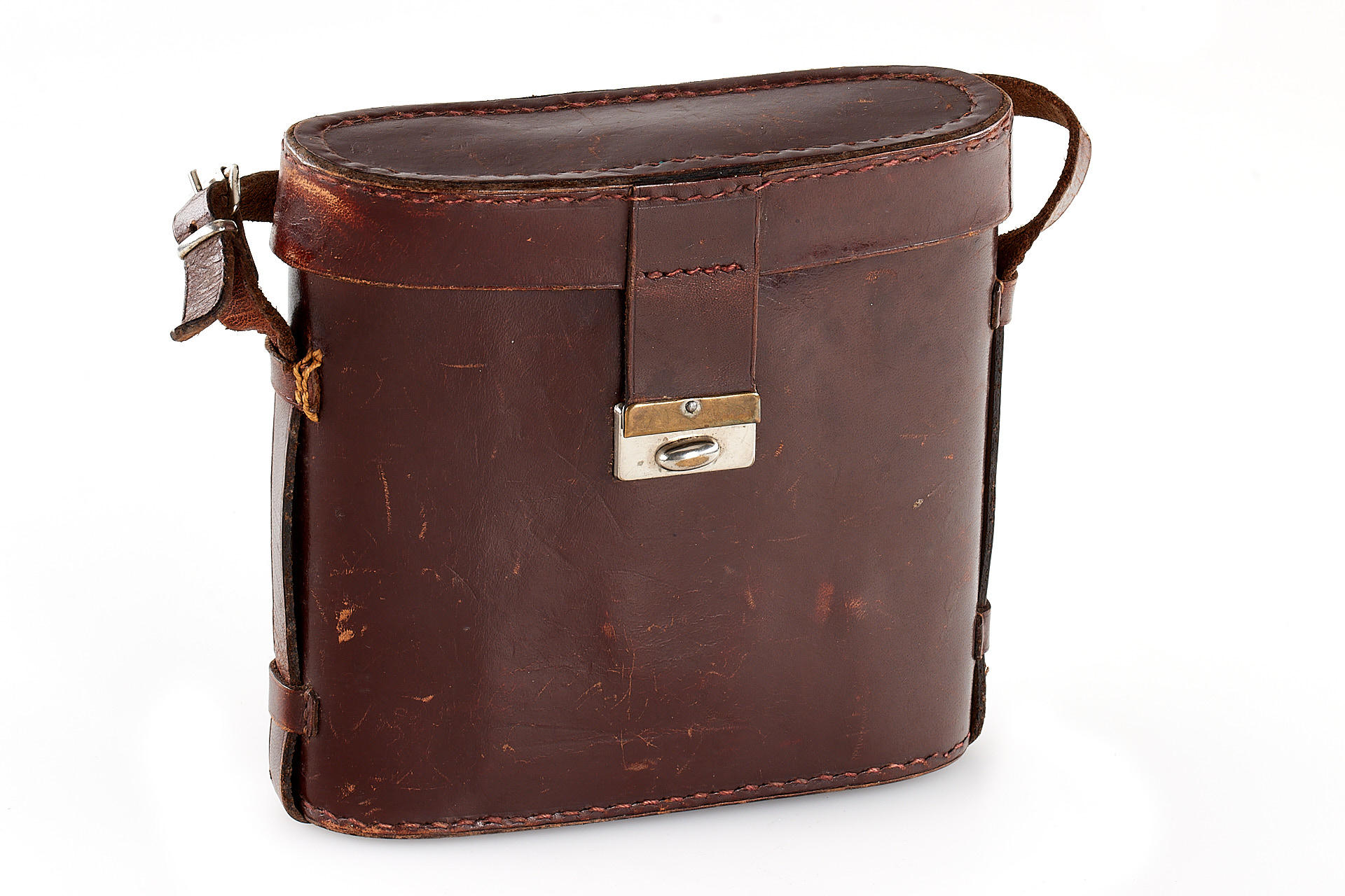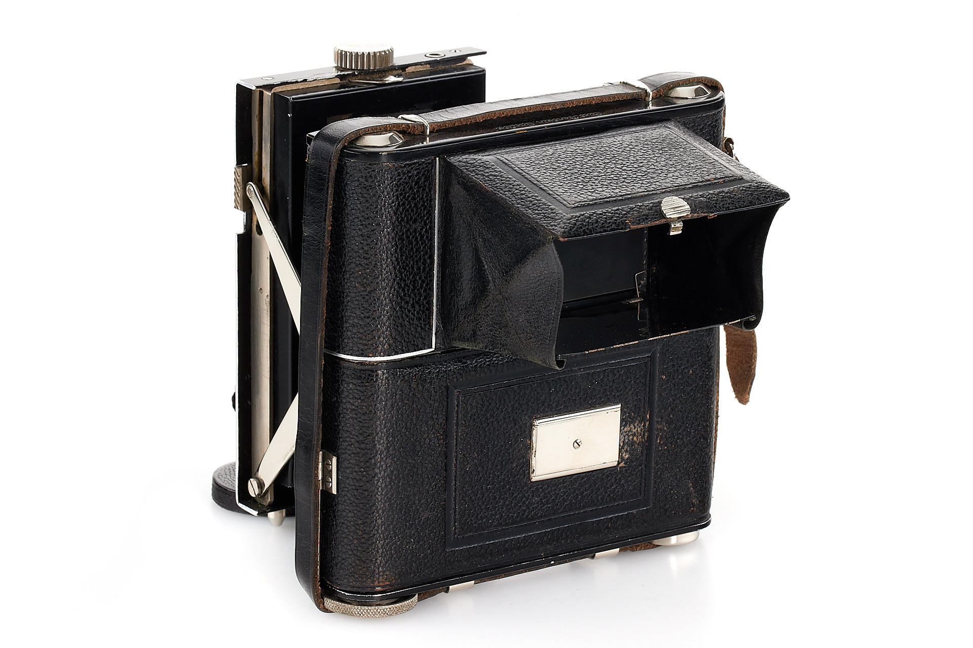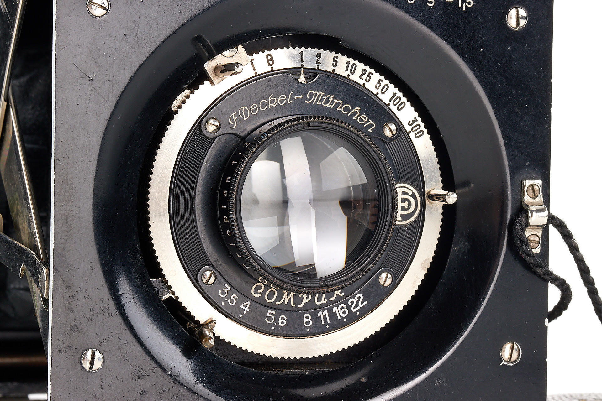 interesting and rare twin-lens folding camera in very good condition and working order, for 8 exposures 4x6.5cm on 127 film, separate bellows for taking and viewing lens, second version with body shutter release and ground glass magnifier, with Trioplan 3.5/7.5cm no.650043 mounted in compur shutter, with leather strap, leather case and both lens caps