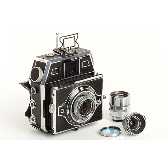 Bertram press-type camera outfit in beautiful condition, for exposures 6x6/6x9 on roll film or plates, with Xenar 3.5/105 no.33581768, Tele-Xenar 5.5/180 no.3571483, Angulon 6.8/65mm no.3662632