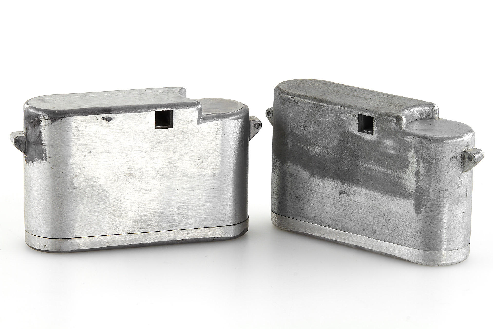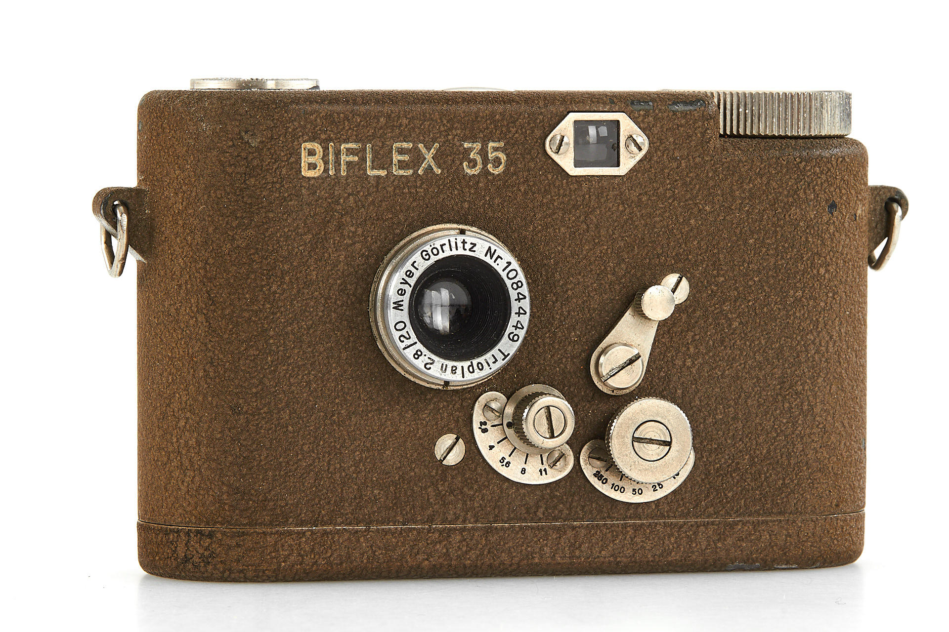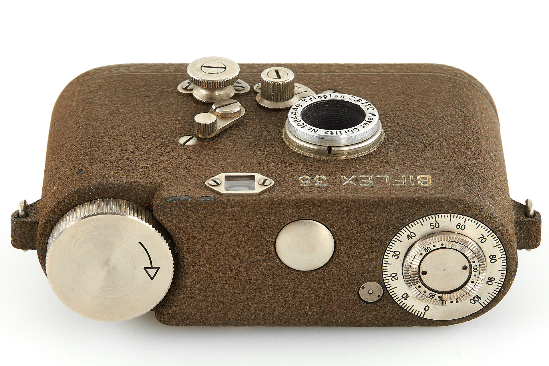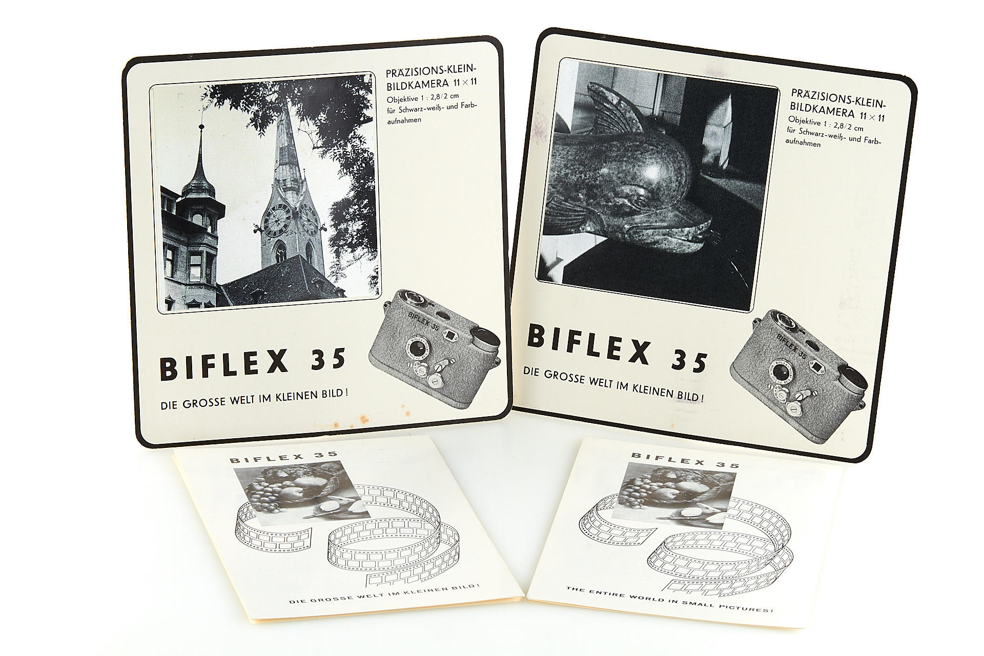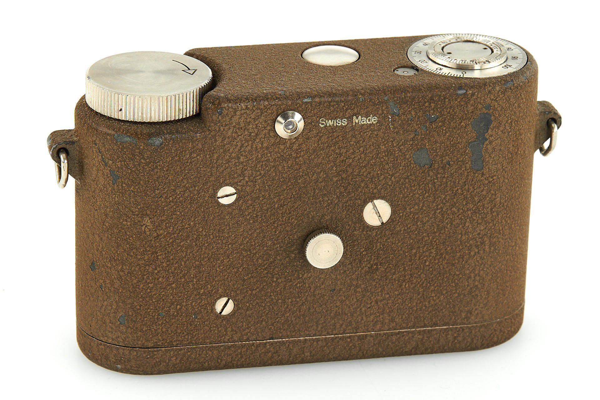 rare Swiss made subminiature camera for 11x11mm exposures on 35mm film, with Trioplan 2.8/20mm no.1084449, the set also includes two unfinished prototype camera housings, very rare original display stand and brochures, some spare parts for the camera