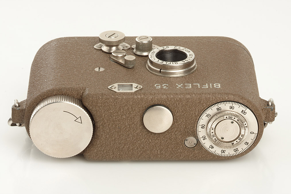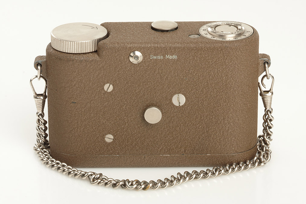 very rare and unusual Swiss made subminiature camera for 11x11mm exposures, Biflex-Trivar 2.8/2cm no.1196, in near mint condition with chain