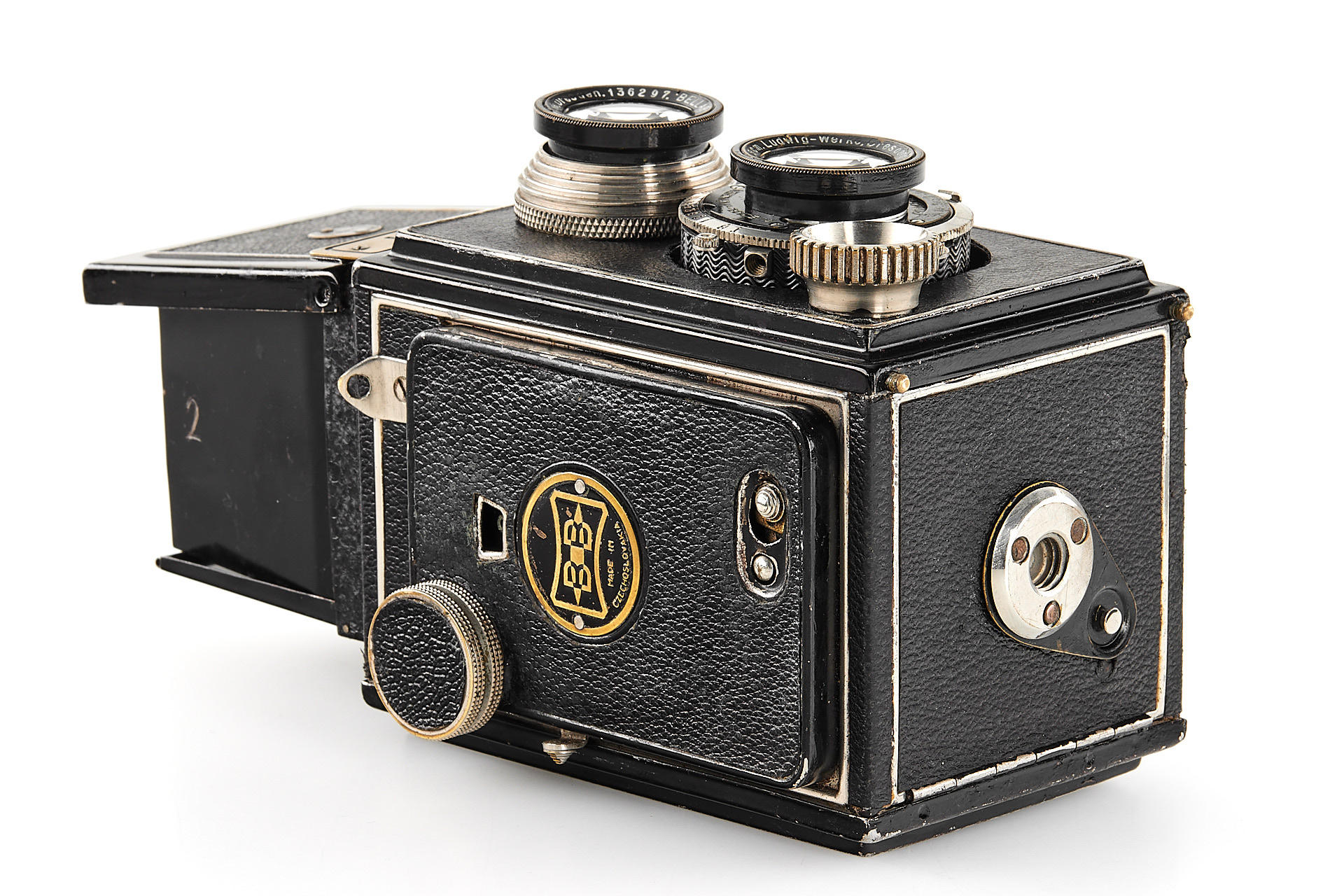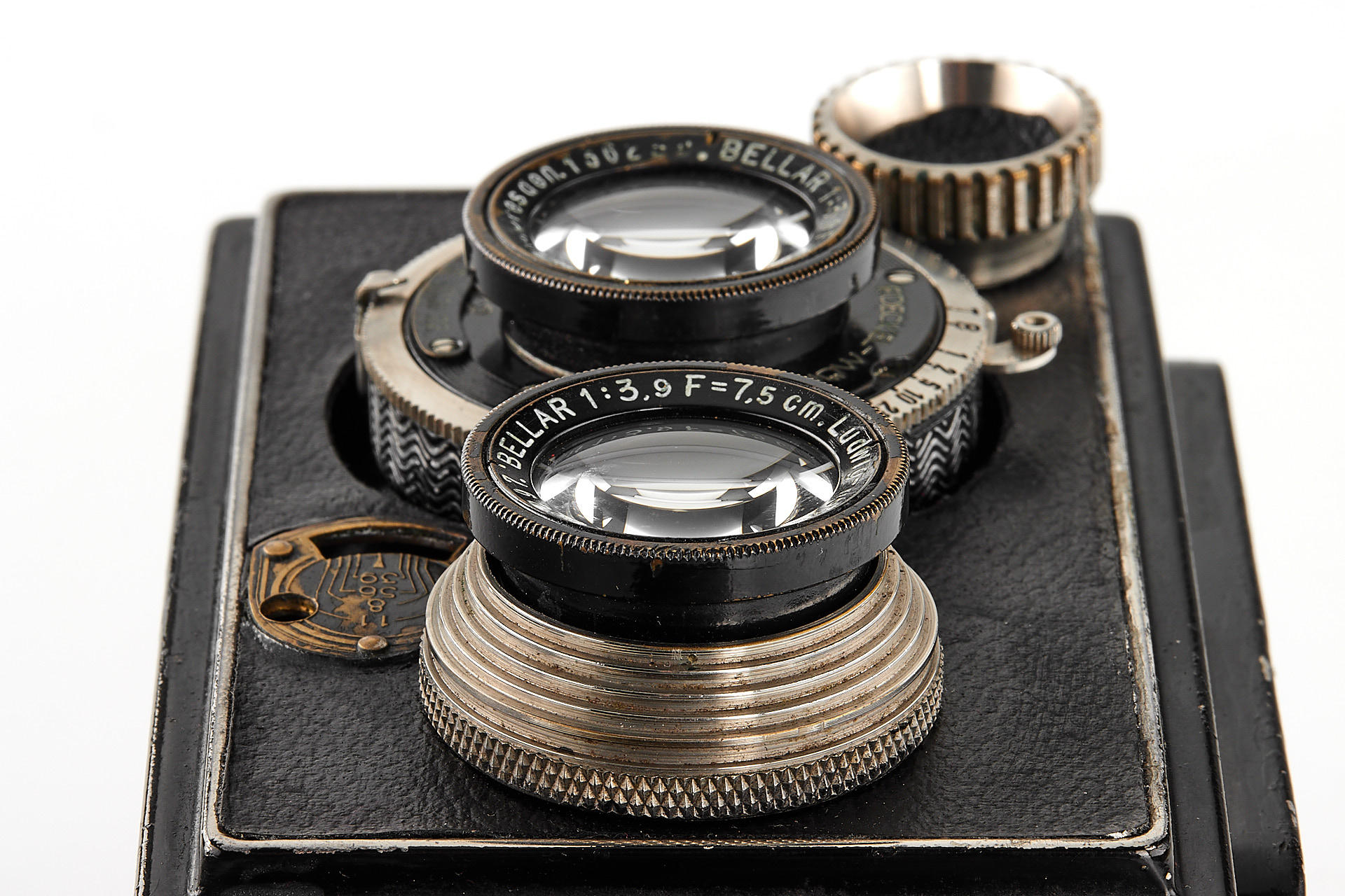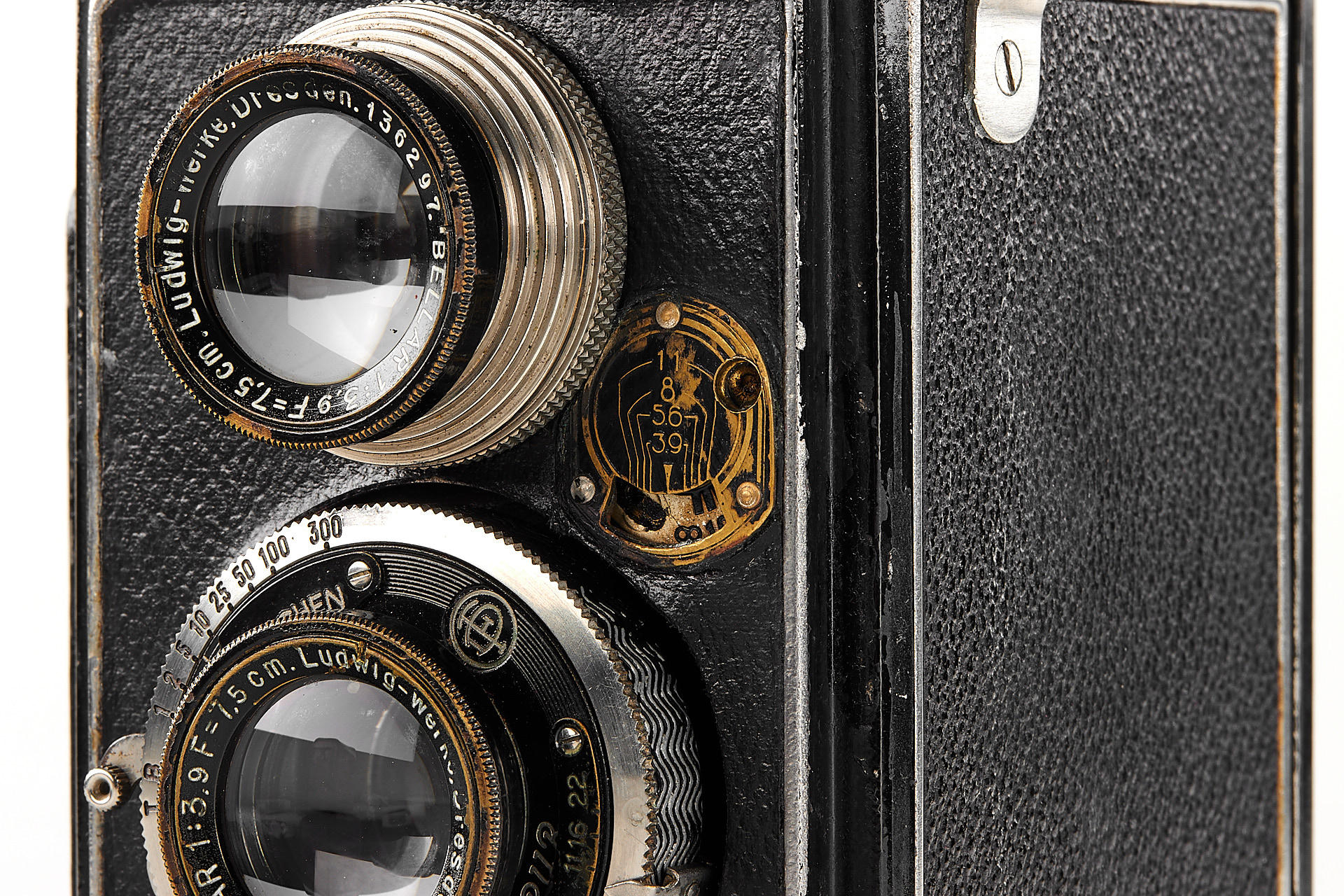 very rare, medium format TLR camera for 6x6cm exposures on 120 film, an interesting design with some unique features like focusing with a large knob on the front plate, built-in depth of field scale on the front or removable film transport mechanism, the camera is equipped with Ludwig Bellar 3.9/7.5cm no.136259 (taking lens) and no.136297 (viewing lens), included is a matching leather case, only a few examples are known to exist