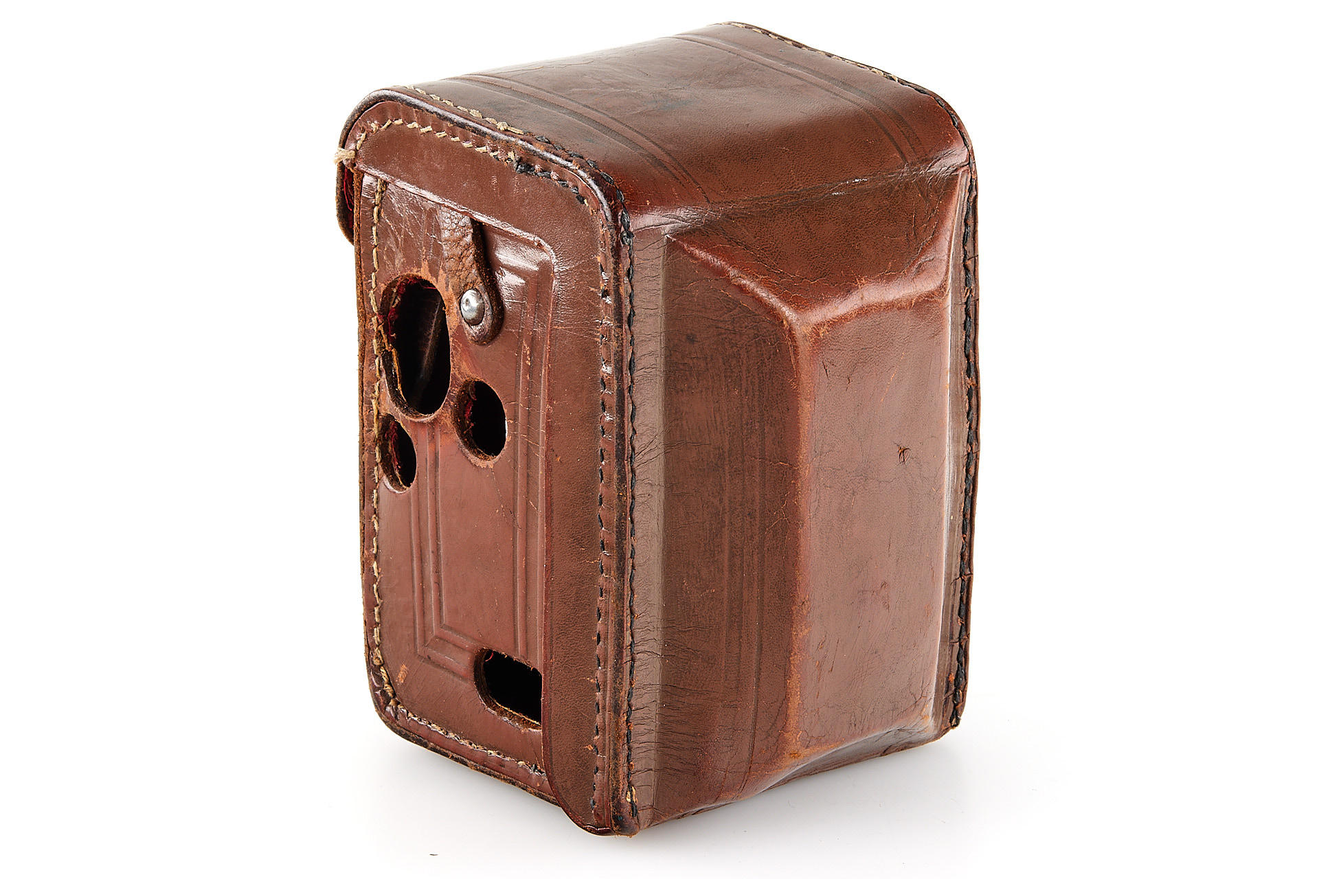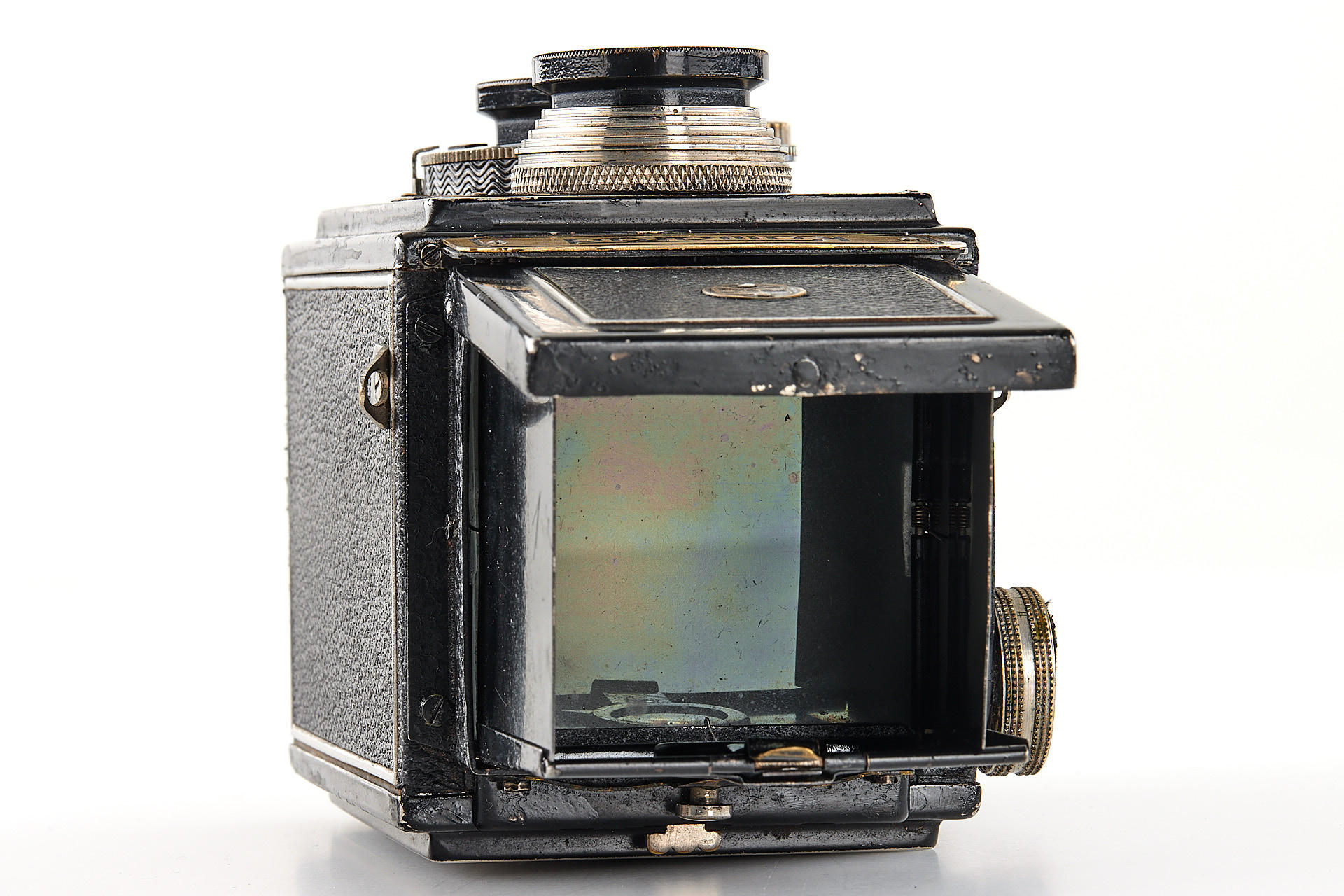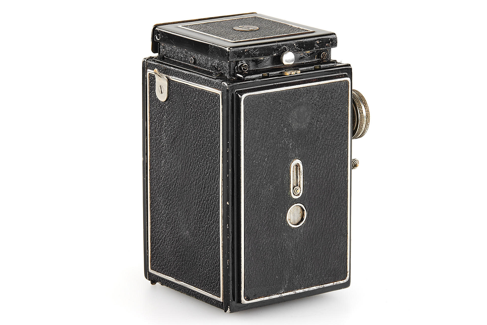 very rare, medium format TLR camera for 6x6cm exposures on 120 film, an interesting design with some unique features like focusing with a large knob on the front plate, built-in depth of field scale on the front or removable film transport mechanism, the camera is equipped with Ludwig Bellar 3.9/7.5cm no.136259 (taking lens) and no.136297 (viewing lens), included is a matching leather case, only a few examples are known to exist
