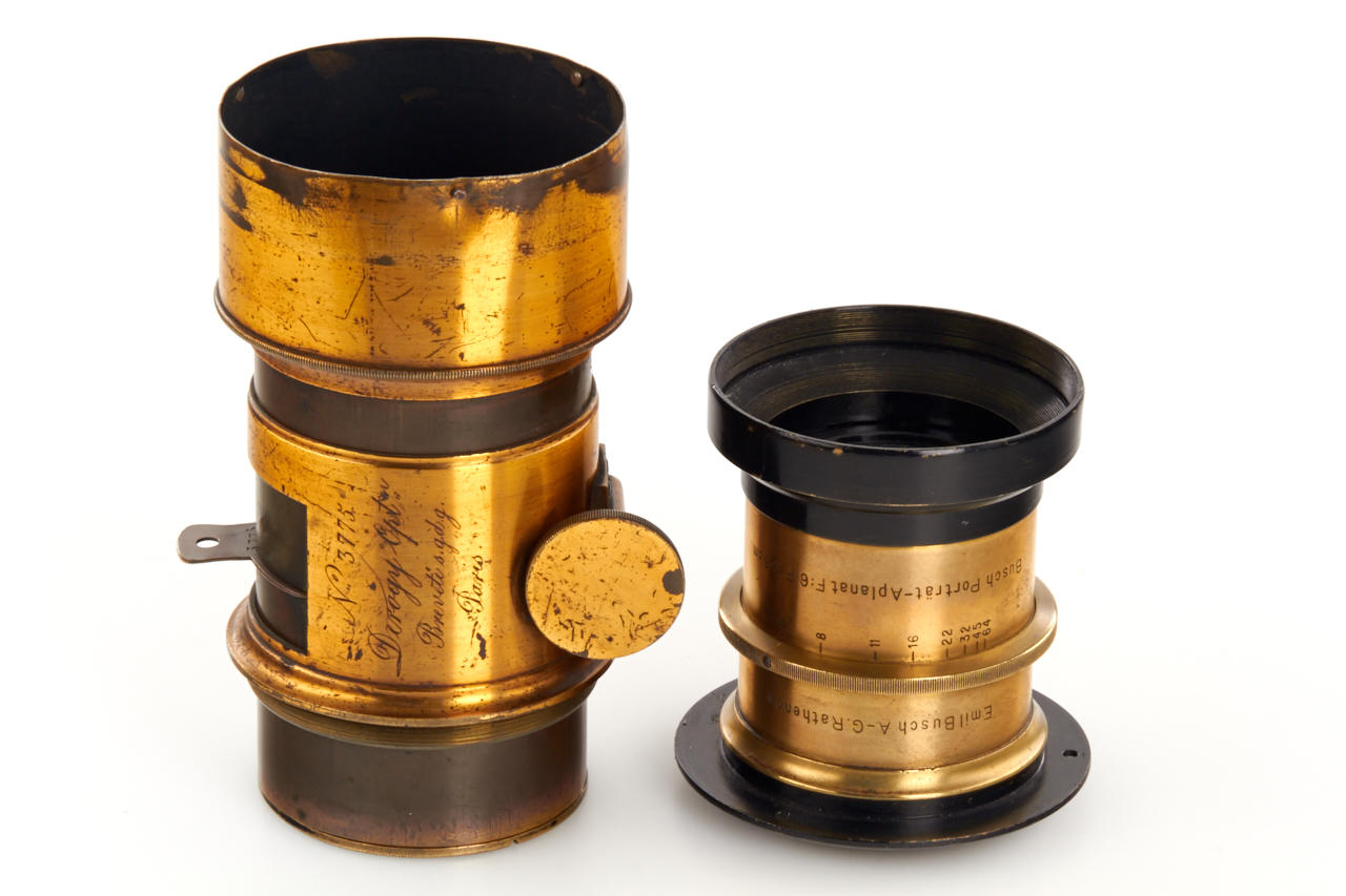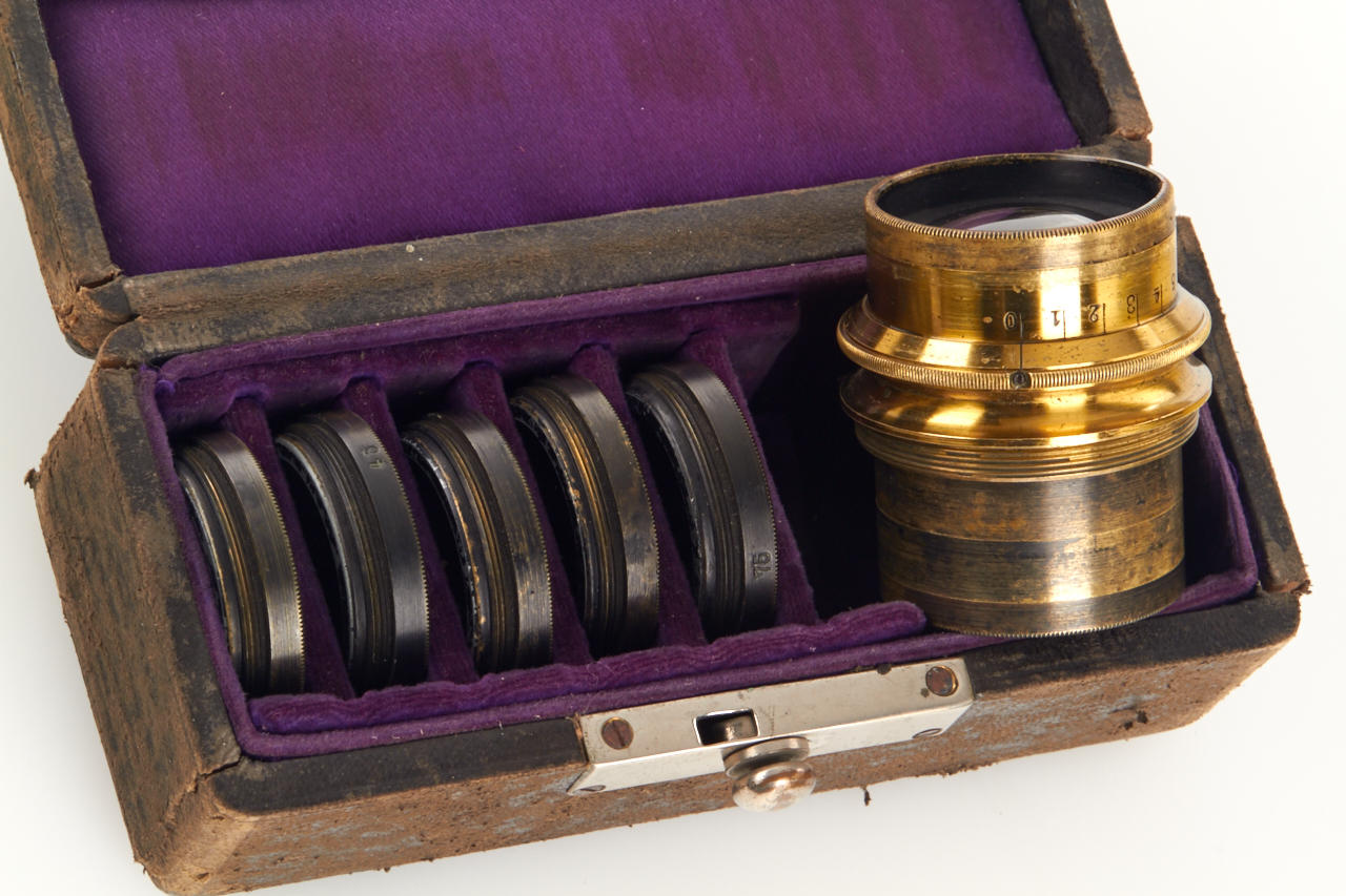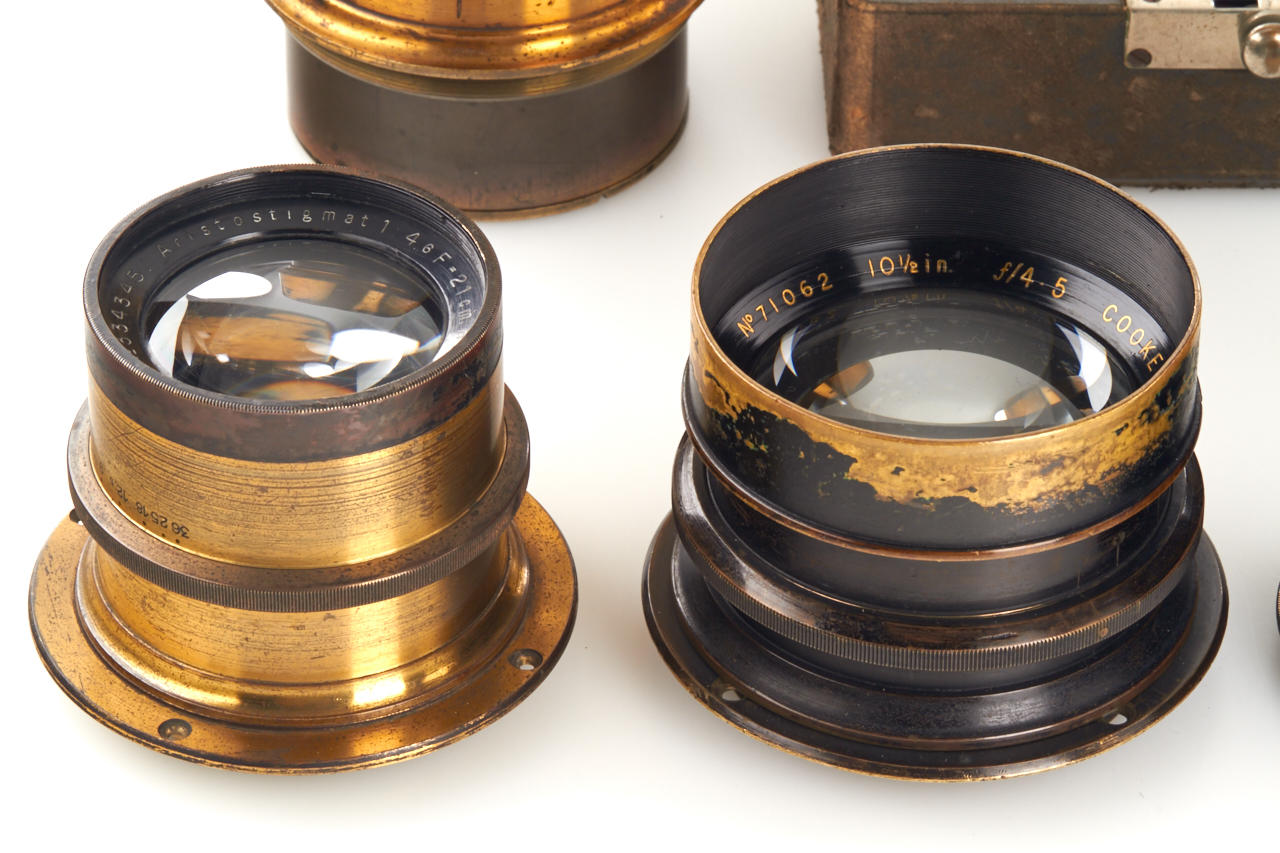8 brass lenses in fine condition: (1) Derogy Petzval lens no.3775, (2) Doppel Anastigmat Rival 6.8/24mm no.179840, (3) Meyer Görlitz Aristostigmat 4.6/21cm no.334345, (4) Busch Porträt Aplanat 6/28cm no.269346), (5) Meyer Görlitz Weitwinkel Aristostigmat 9/12cm no.434279 - mint with box, (6) Busch Bis Telar Ser II 7/400mm no.234123, (7) Taylor Hobson Cooke Aviar 4.5/10 1/2" no.71062, (8) complete unmarked casket lens set with 7 lens elements, in case