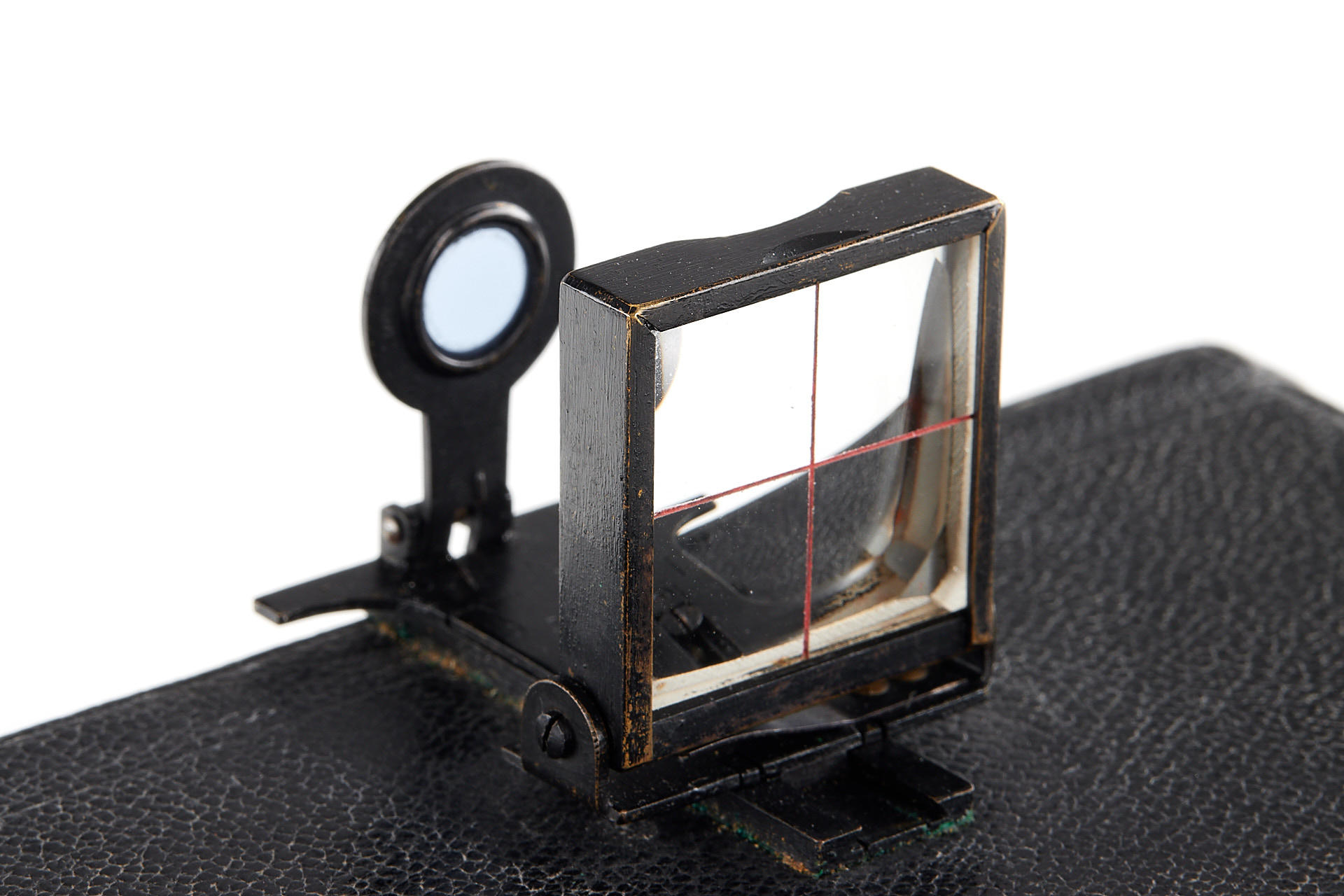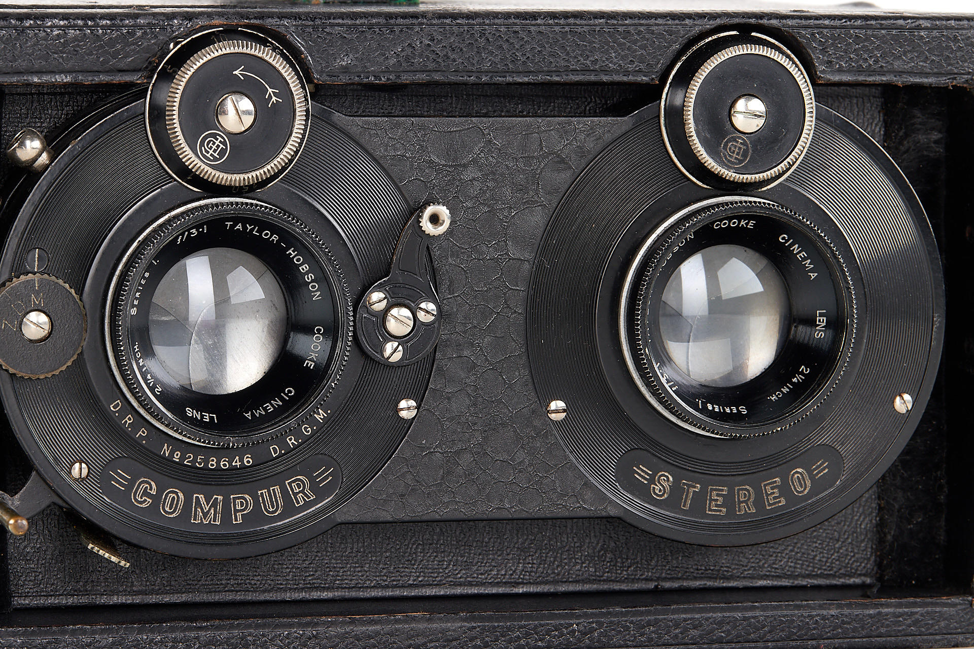 Interesting British sliding box stereo camera for 12x5cm film plates, in very good condition, with a pair of rare Taylor-Hobson Cooke Cinema Lens Series I. 3.1/2¼" no.114290 and no.114291, with ground glass back