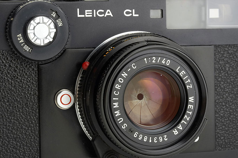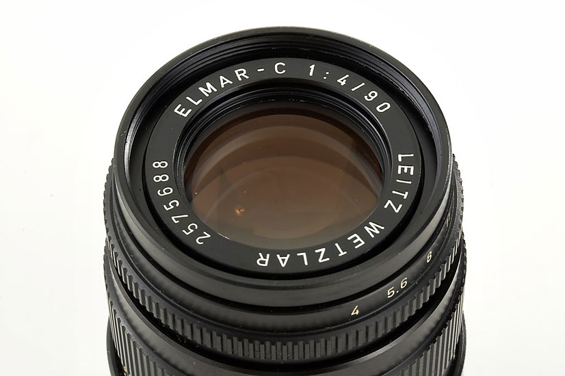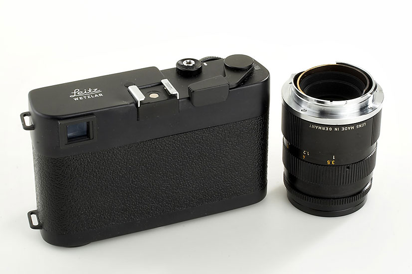 camera in perfect working order (dent near accessory shoe), near mint Summicron-C 2/40mm no.2631869 (filter, hood, cap), strap, case, mint Elmar-C 4/90mm no.2575688 (filter, hood, caps)
