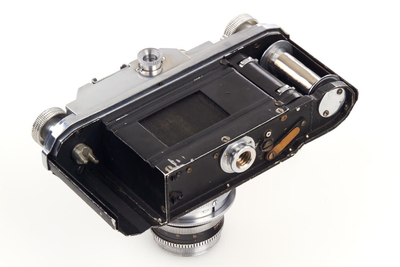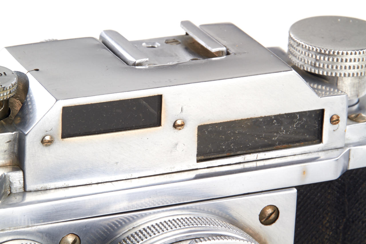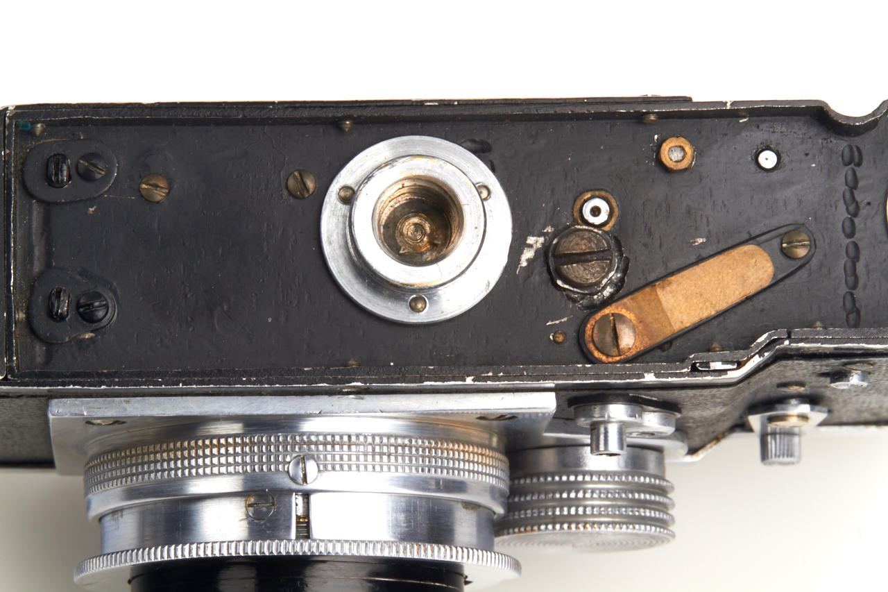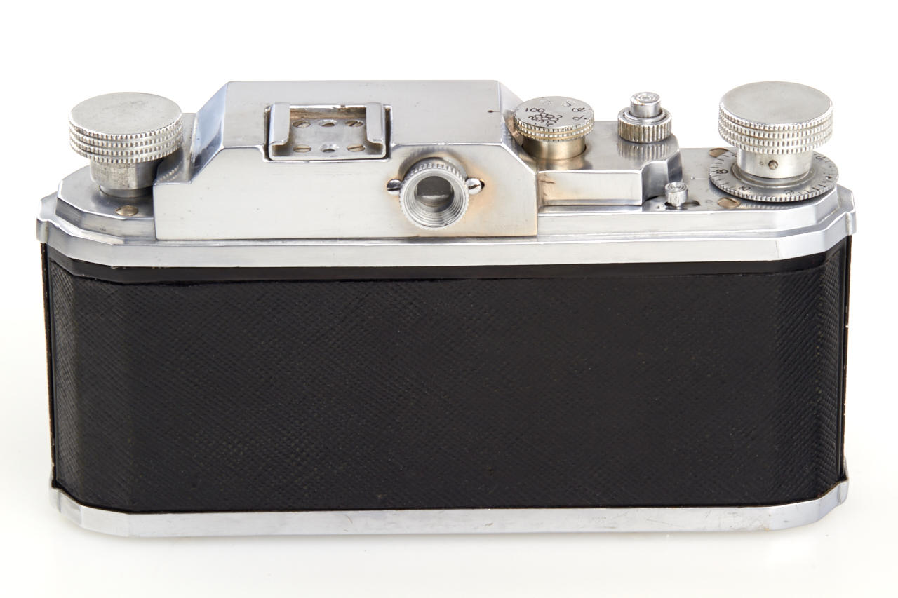 Unknown prototype of a 35mm RF camera 24x36mm with interchangeable lens, focal plane shutter (P, 1 - 1/1000) and selftimer. Uncommon rangefinder- the 1:1 viewfinder image is horizontally divided in two halves of which the lower moves laterally if the lens is focused by turning the substantial knob adjacent to it. The lens, a 2.8/50mm Wollensak Perfex Velostigmat without serial number, is interchangeable in a three claw breech lock bayonet mount of unknown design, it focusses to 3 feet. Longer shutter speeds (1/20 to 1) are set with a small dial above the focusing knob. Below it there are the sync contacts. The back can be removed in Contax style and is arrested with a sliding knob, for use on a tripod it has a 3/8” thread. The camera is the prototype of a advanced professional „Perfex“ camera made by Candid Camera/Chicago, IL, around 1940, which never went in production. The recently discovered camera is in very good and working condition. No other example is known to us.