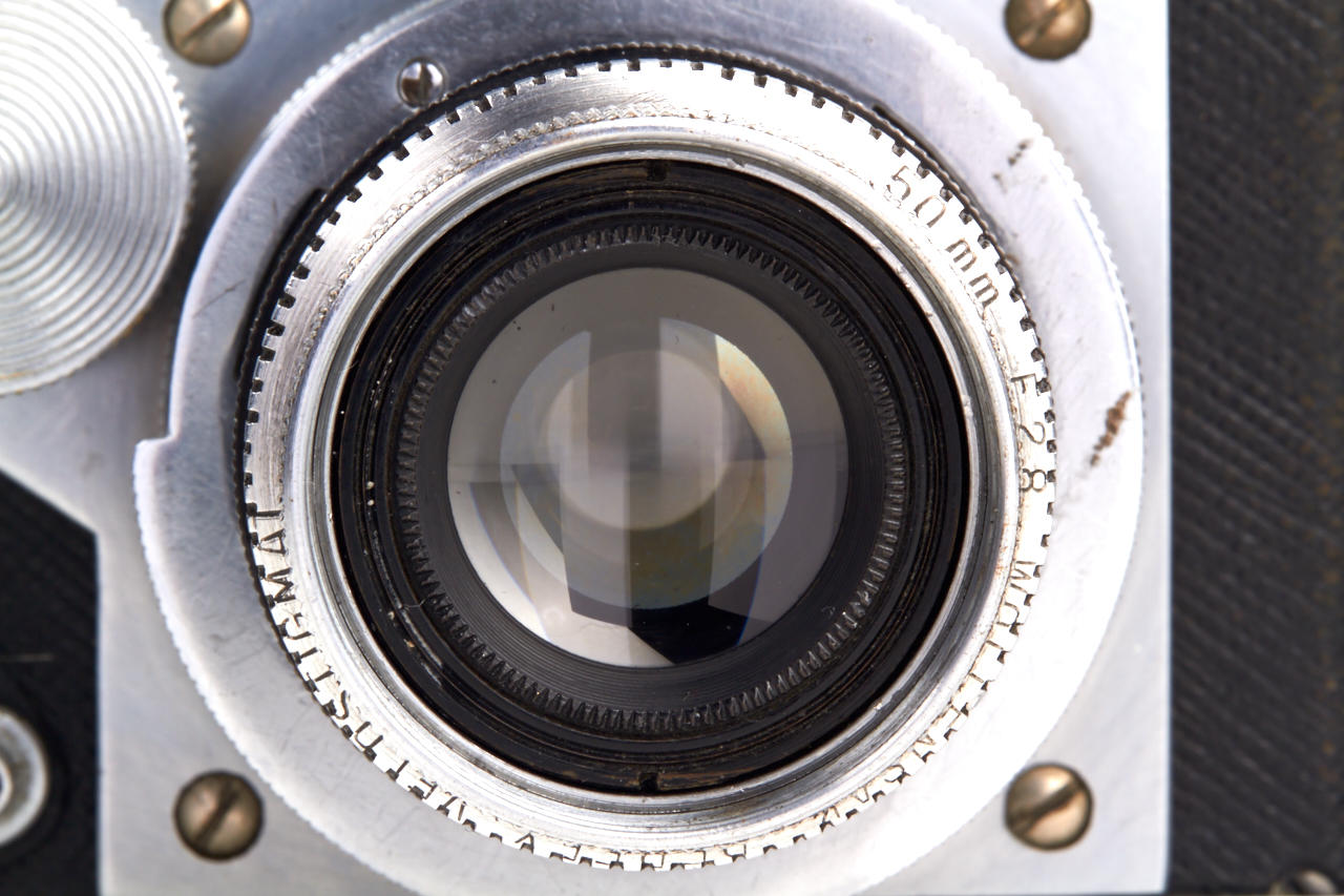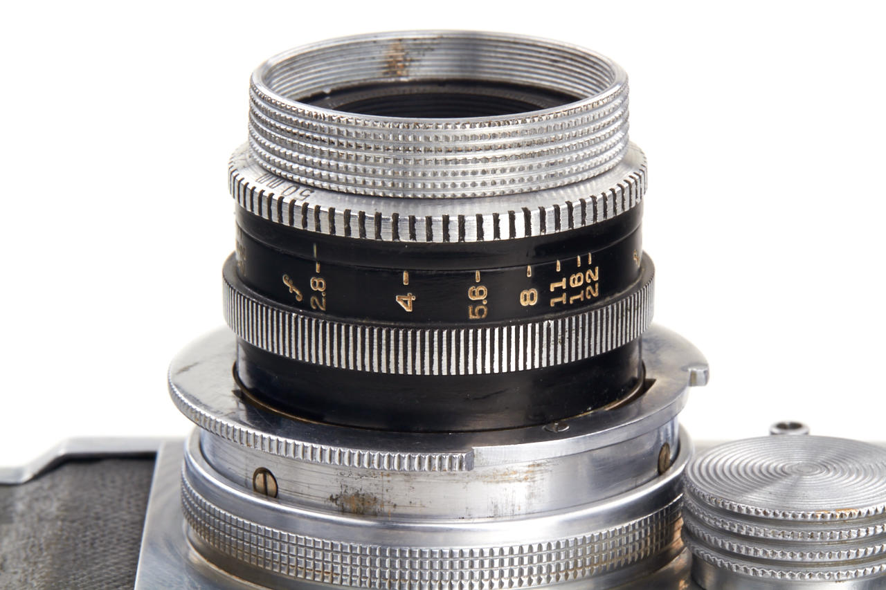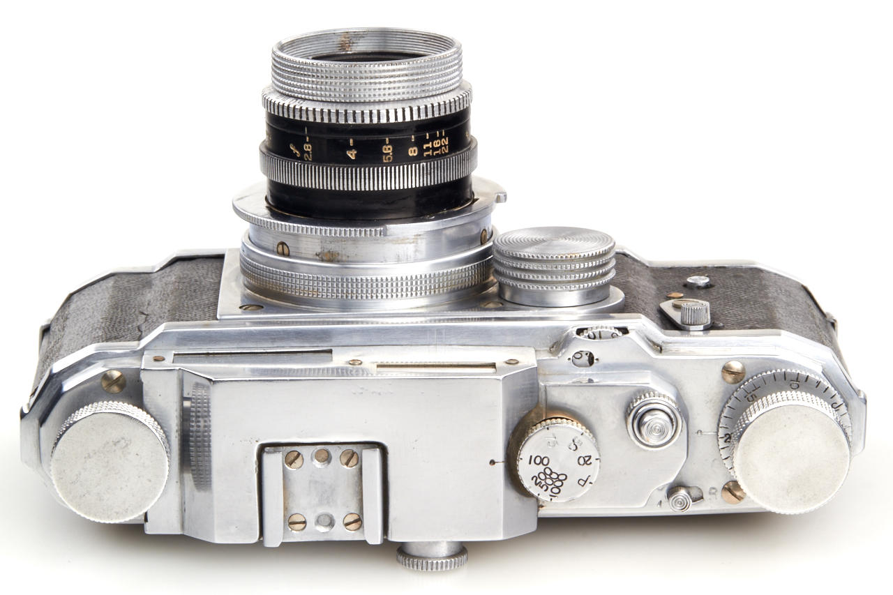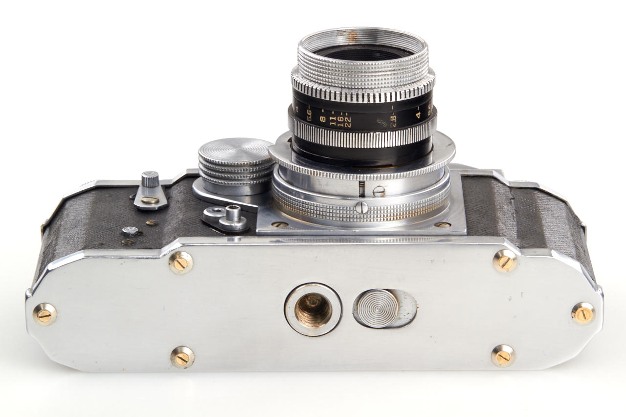 Unknown prototype of a 35mm RF camera 24x36mm with interchangeable lens, focal plane shutter (P, 1 - 1/1000) and selftimer. Uncommon rangefinder- the 1:1 viewfinder image is horizontally divided in two halves of which the lower moves laterally if the lens is focused by turning the substantial knob adjacent to it. The lens, a 2.8/50mm Wollensak Perfex Velostigmat without serial number, is interchangeable in a three claw breech lock bayonet mount of unknown design, it focusses to 3 feet. Longer shutter speeds (1/20 to 1) are set with a small dial above the focusing knob. Below it there are the sync contacts. The back can be removed in Contax style and is arrested with a sliding knob, for use on a tripod it has a 3/8” thread. The camera is the prototype of a advanced professional „Perfex“ camera made by Candid Camera/Chicago, IL, around 1940, which never went in production. The recently discovered camera is in very good and working condition. No other example is known to us.
