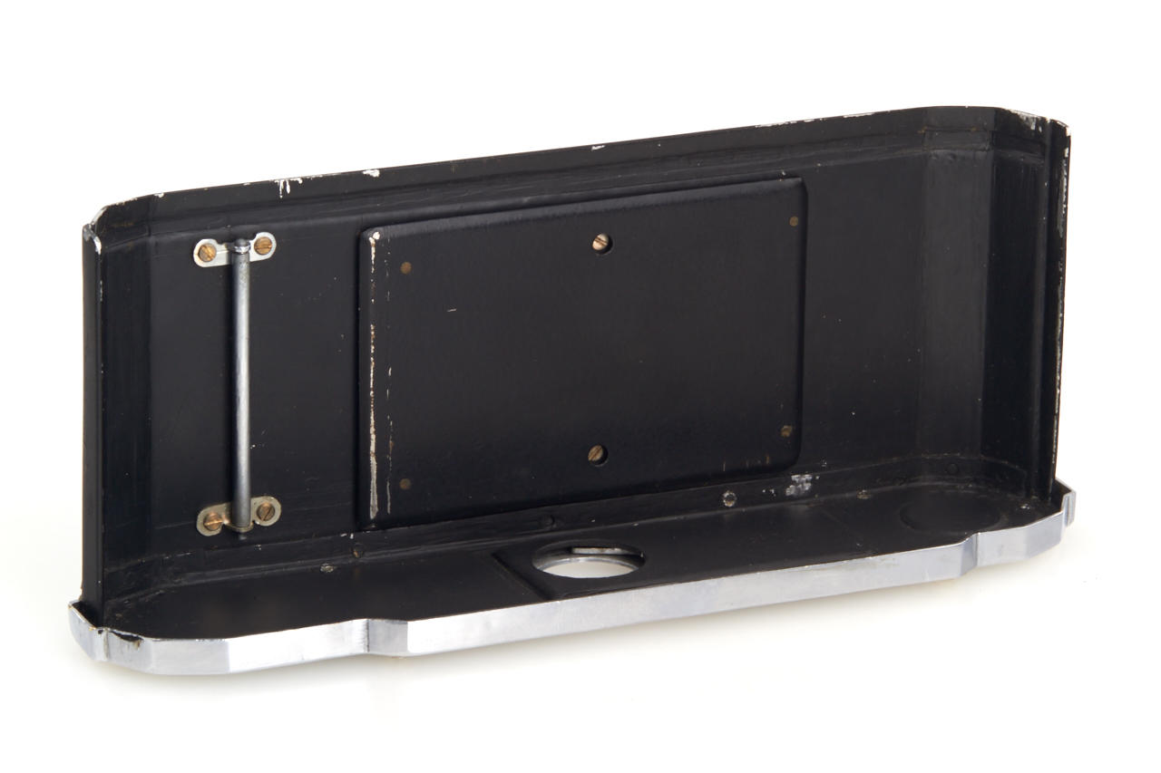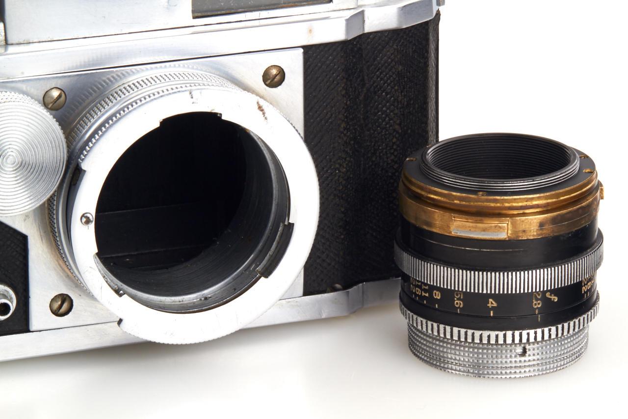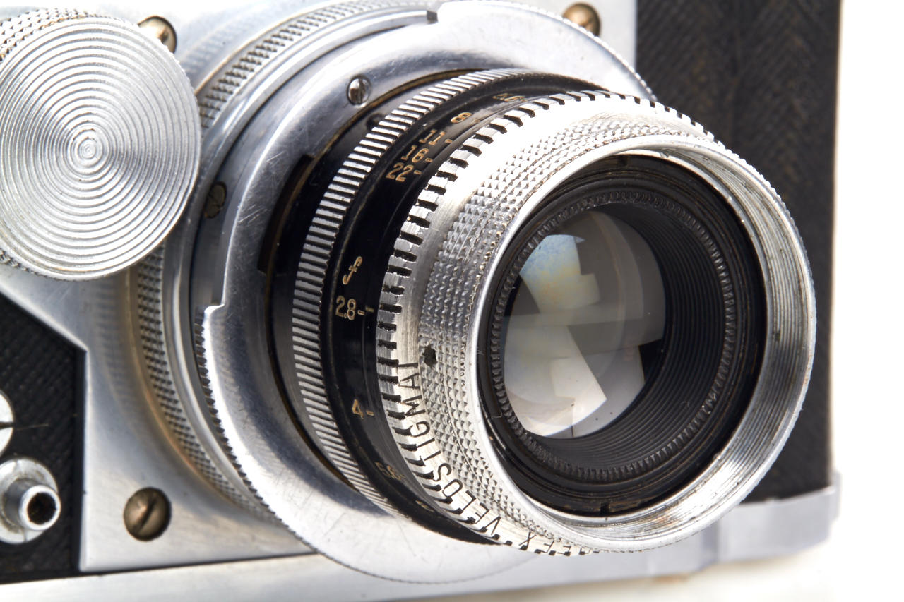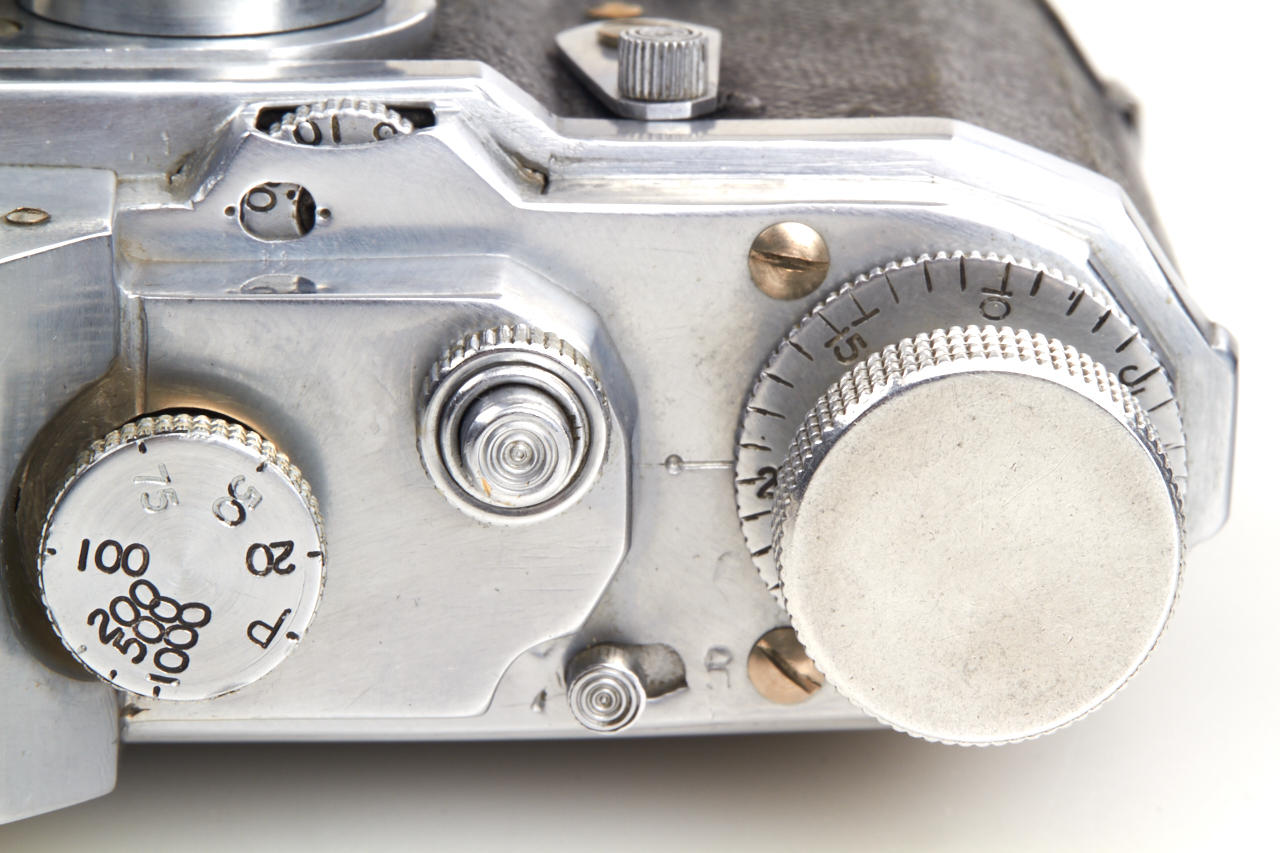 Unknown prototype of a 35mm RF camera 24x36mm with interchangeable lens, focal plane shutter (P, 1 - 1/1000) and selftimer. Uncommon rangefinder- the 1:1 viewfinder image is horizontally divided in two halves of which the lower moves laterally if the lens is focused by turning the substantial knob adjacent to it. The lens, a 2.8/50mm Wollensak Perfex Velostigmat without serial number, is interchangeable in a three claw breech lock bayonet mount of unknown design, it focusses to 3 feet. Longer shutter speeds (1/20 to 1) are set with a small dial above the focusing knob. Below it there are the sync contacts. The back can be removed in Contax style and is arrested with a sliding knob, for use on a tripod it has a 3/8” thread. The camera is the prototype of a advanced professional „Perfex“ camera made by Candid Camera/Chicago, IL, around 1940, which never went in production. The recently discovered camera is in very good and working condition. No other example is known to us.