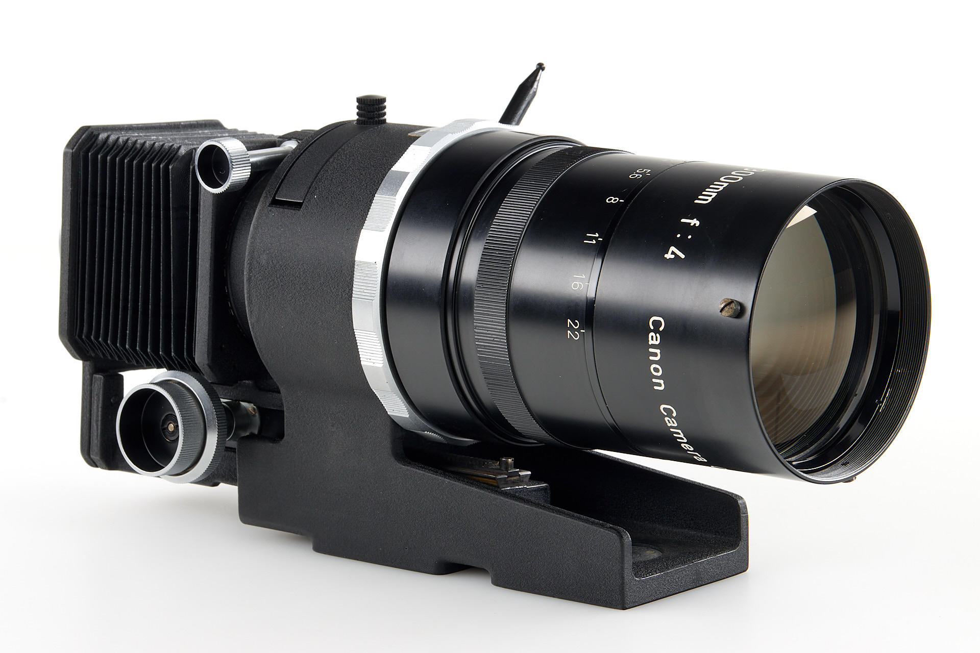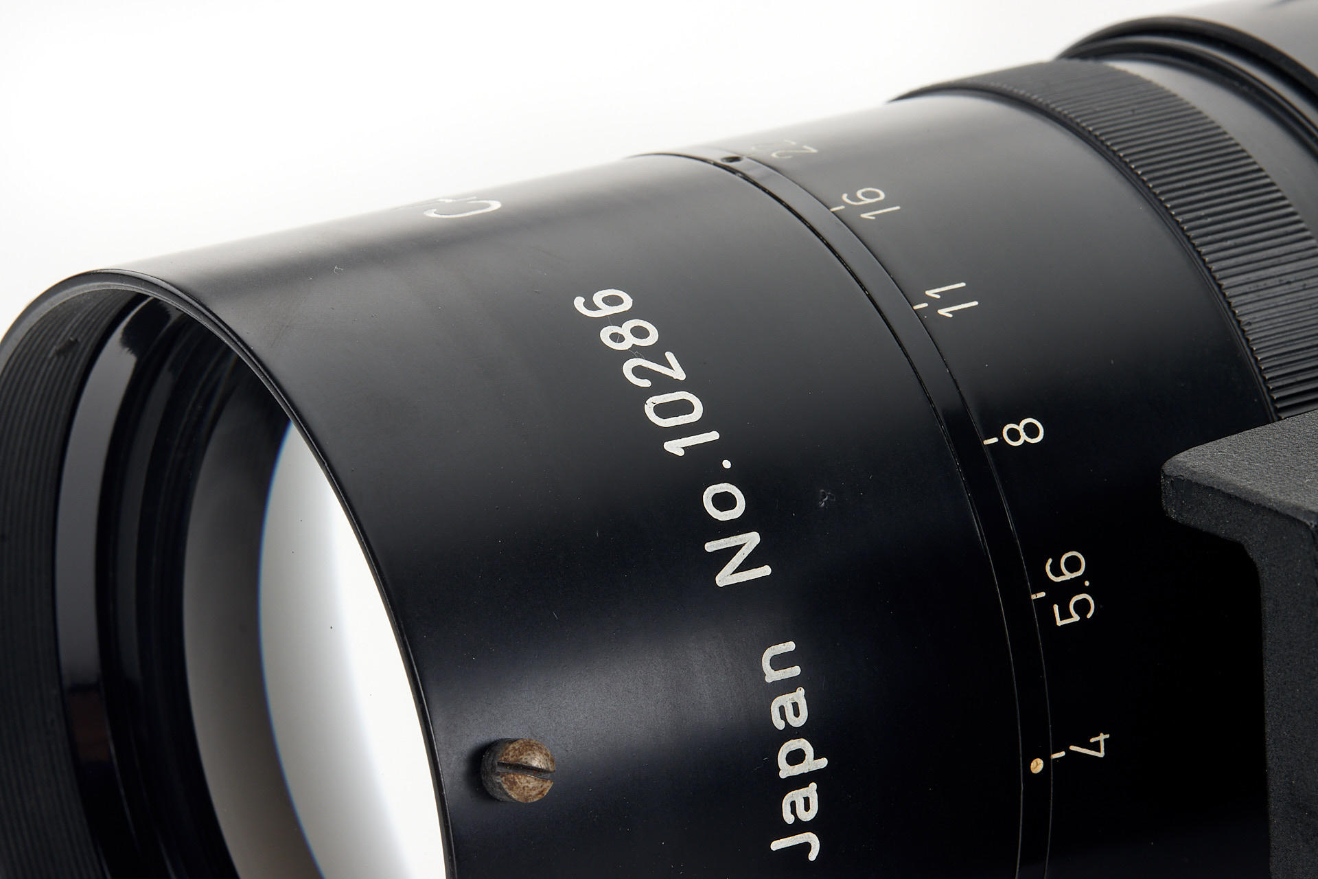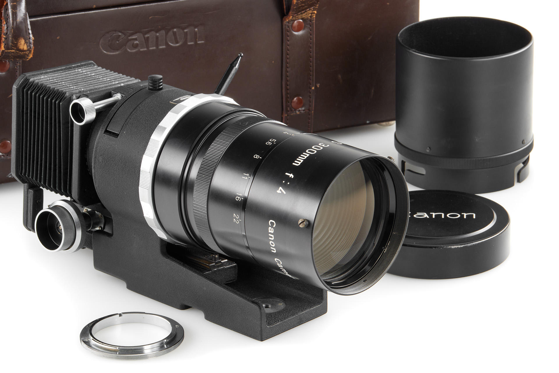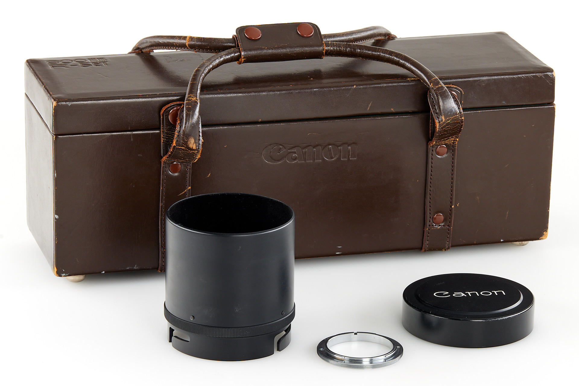 a very rare telephoto lens, a part of a lens system designed for Canonflex and including 300mm, 400mm, 600mm, 800mm and 1000mm lenses, each usable with the same lens supporter, in excellent condition, with lens supporter (focusing unit), special bayonet-mount hood, cap and original case
