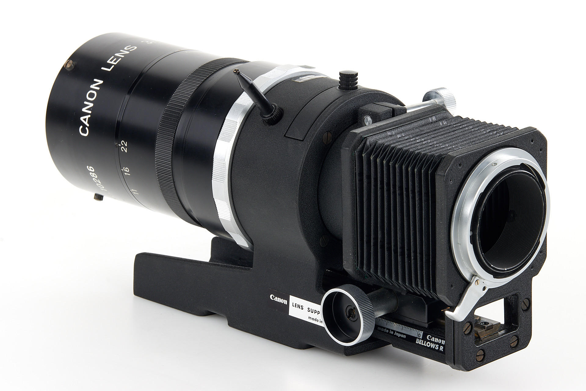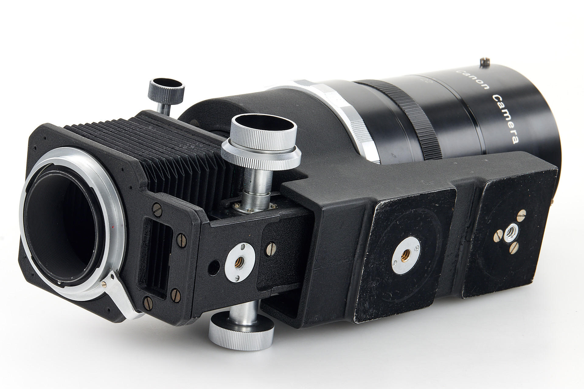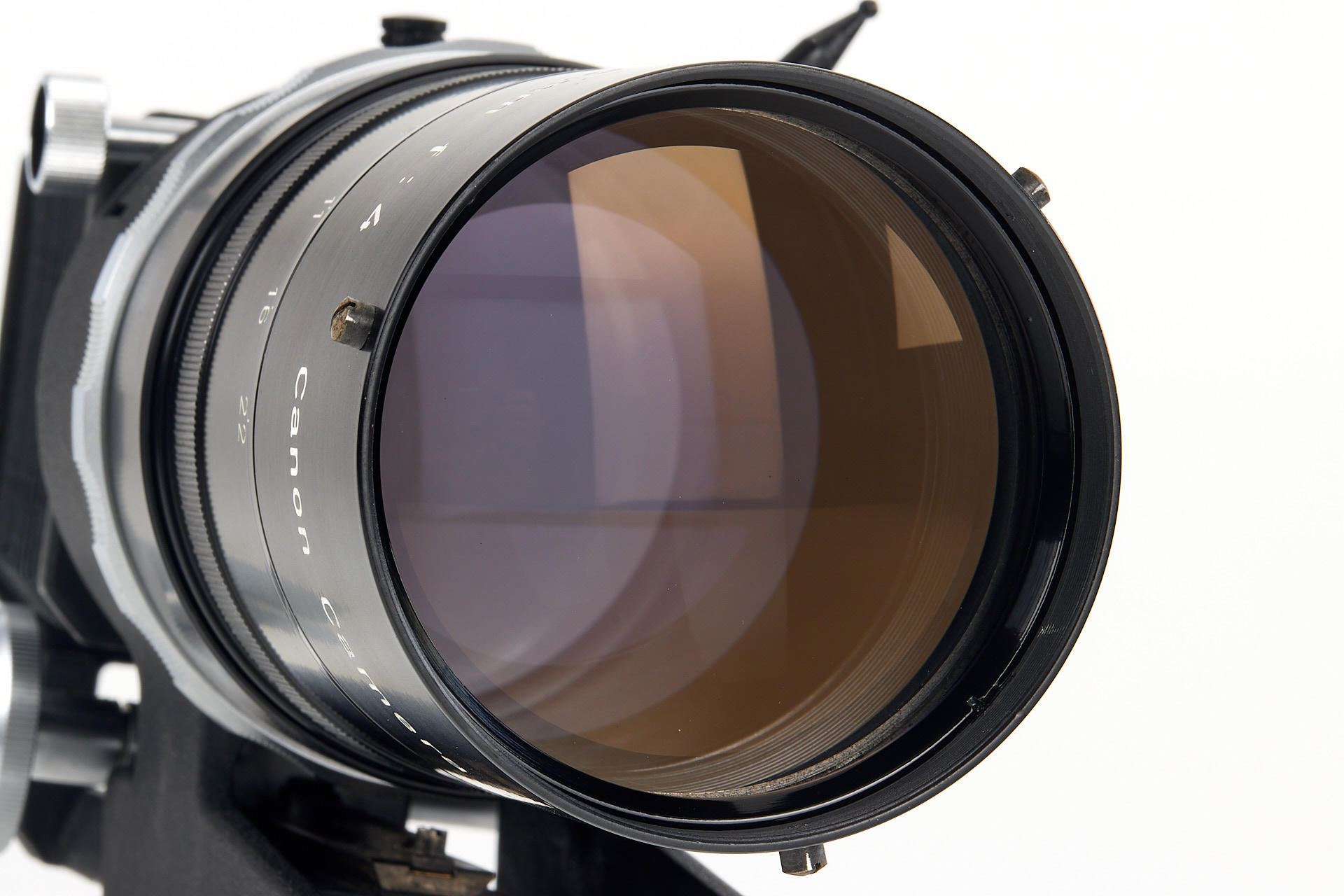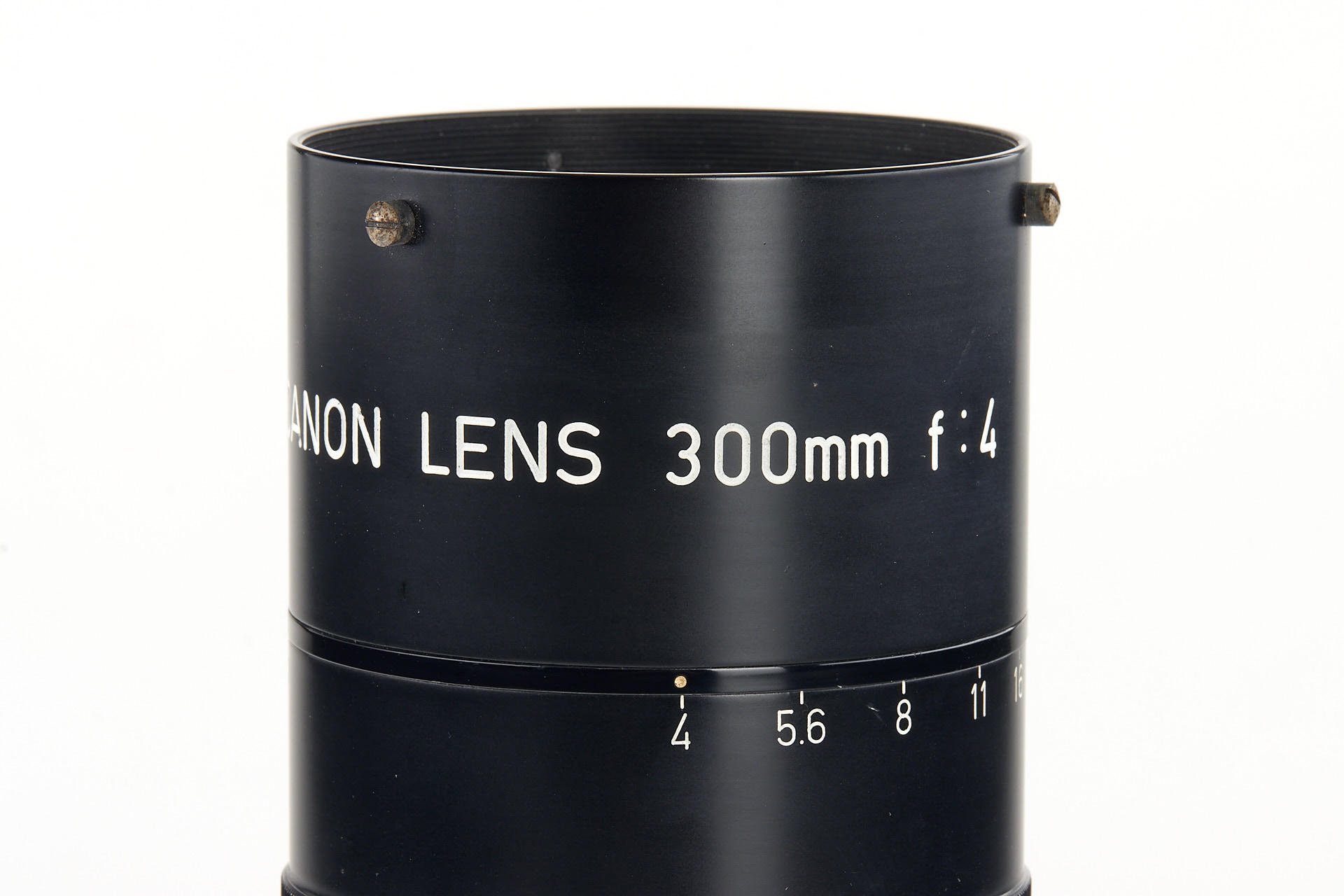 a very rare telephoto lens, a part of a lens system designed for Canonflex and including 300mm, 400mm, 600mm, 800mm and 1000mm lenses, each usable with the same lens supporter, in excellent condition, with lens supporter (focusing unit), special bayonet-mount hood, cap and original case