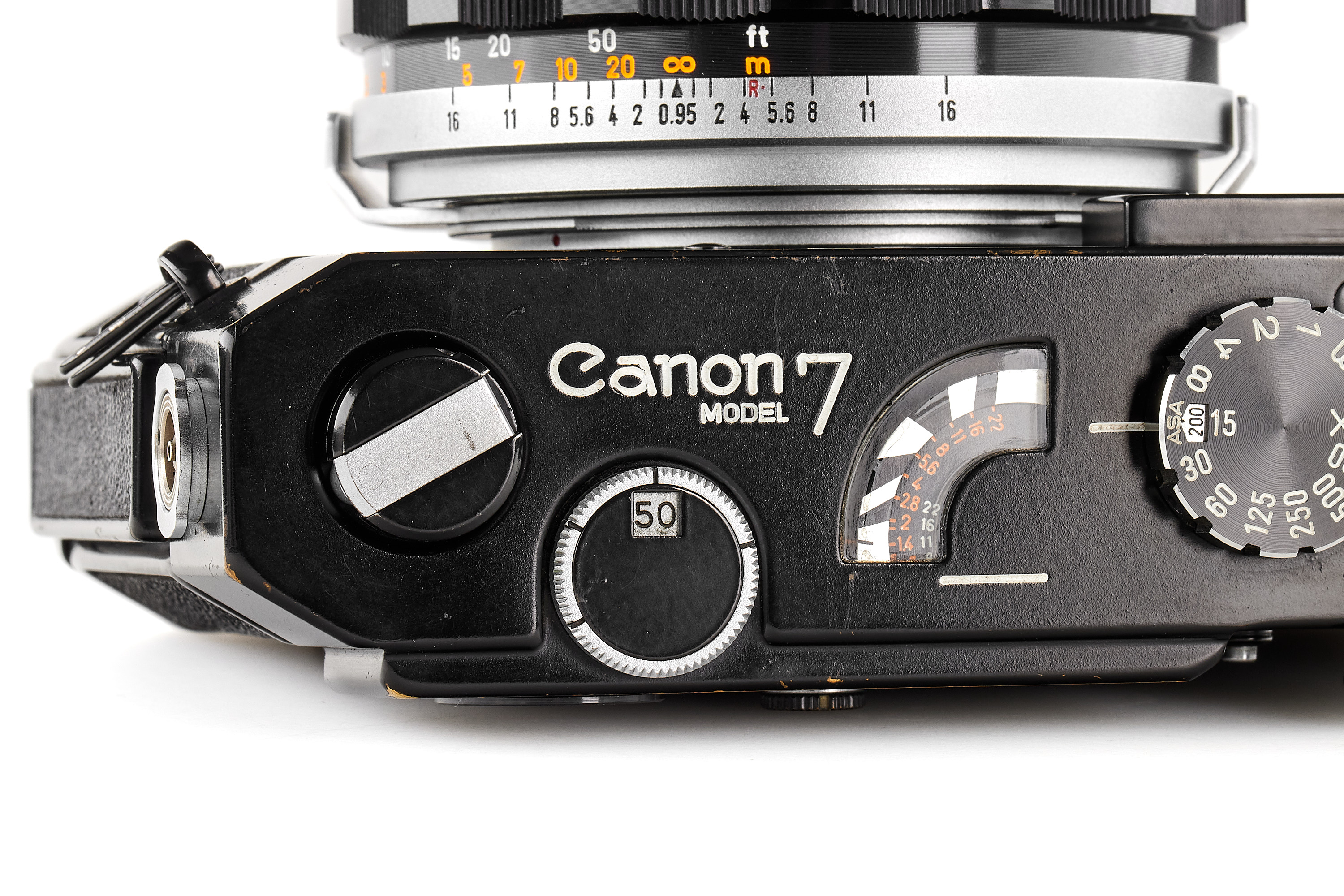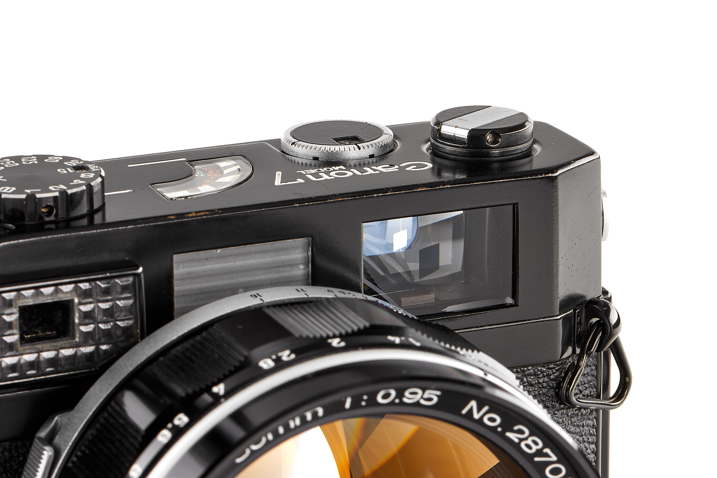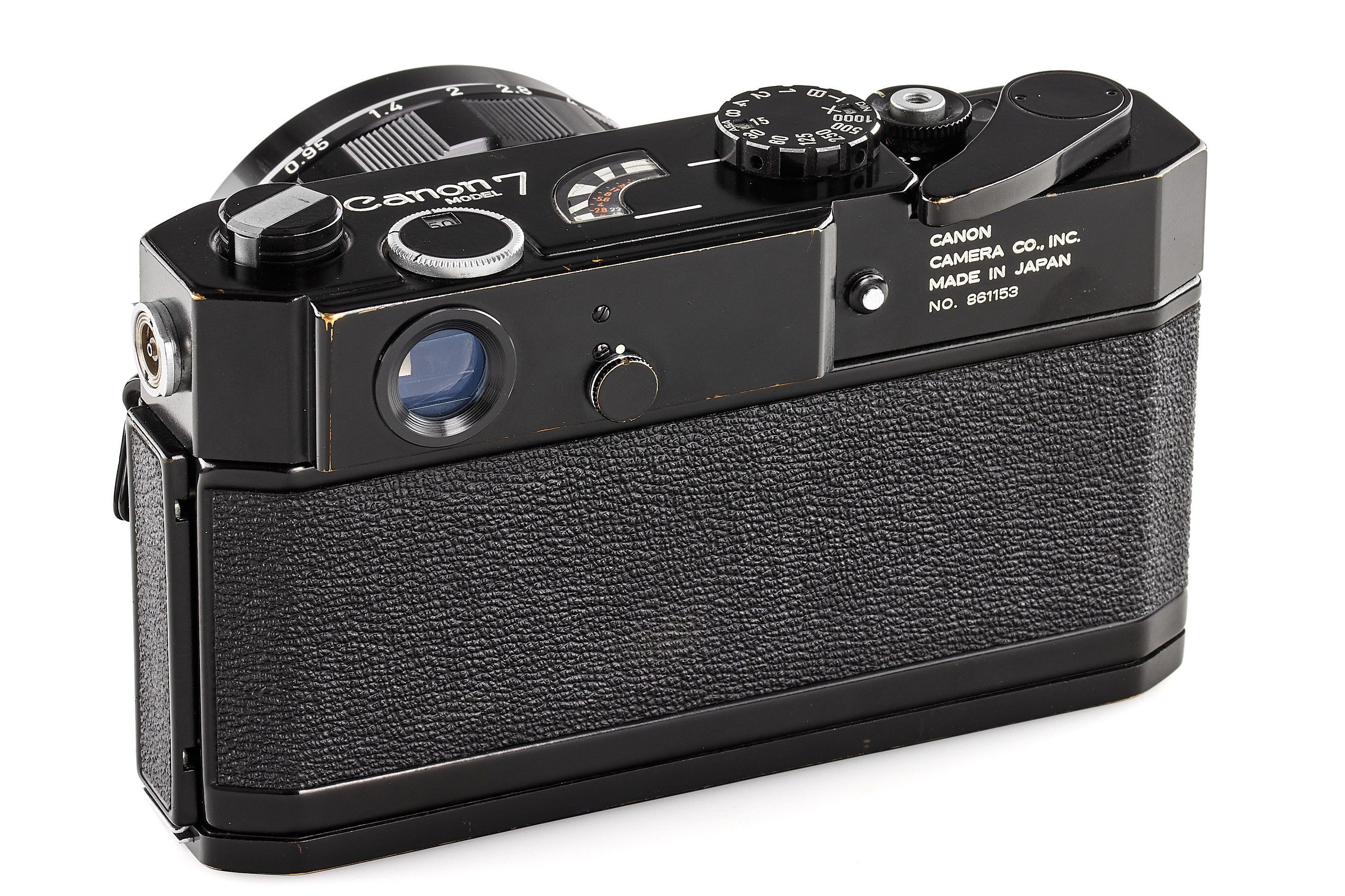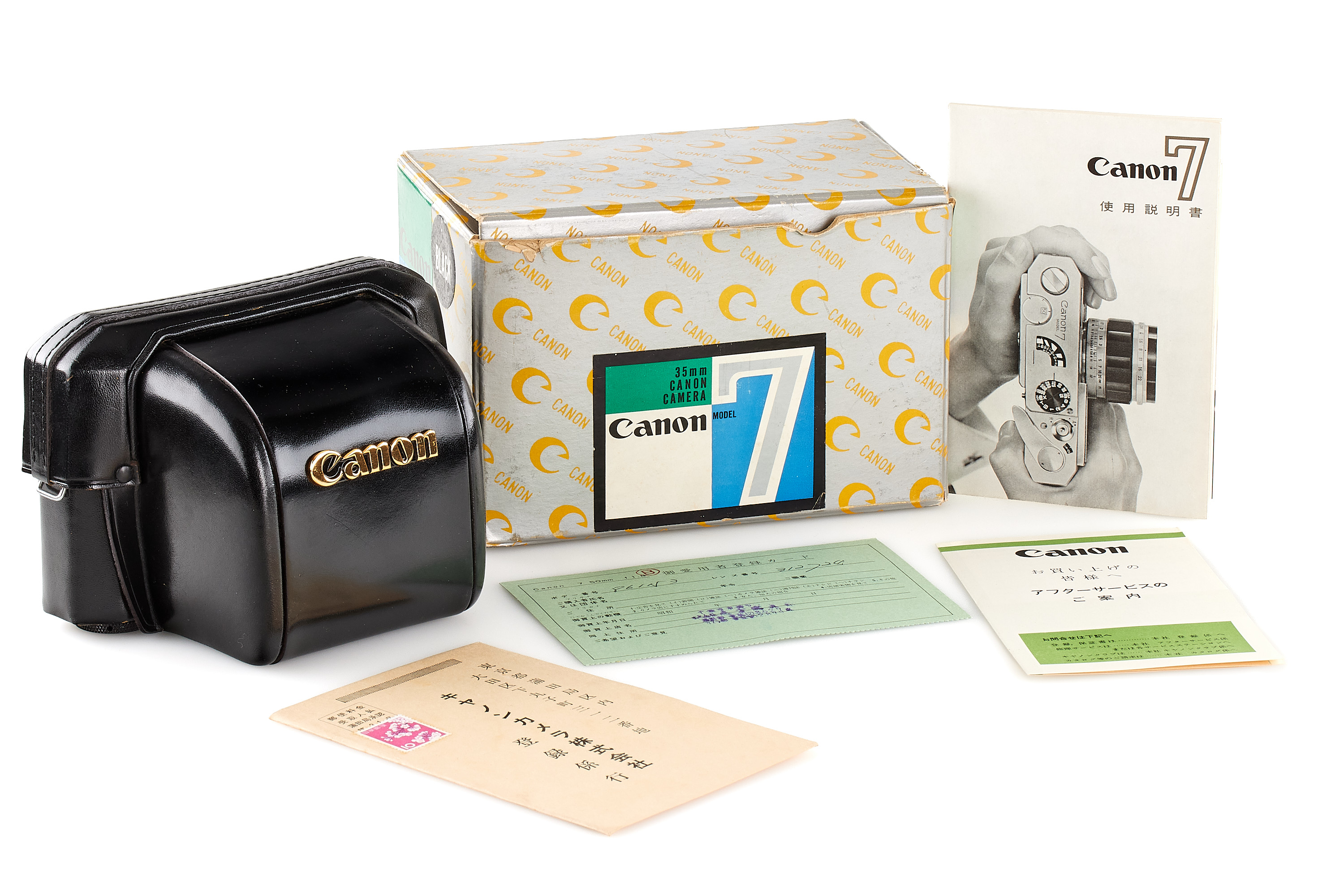 A rare black paint Canon 7 in beautiful, near-mint condition, with only minimal patina of use around the edges, with the ultra-fast Canon 0.95/50mm no.28705 (near-mint, with very good optics, including boxed hood, cap, protection filter). The set also includes a maker's box with matching camera serial number, Japanese instructions and papers.
