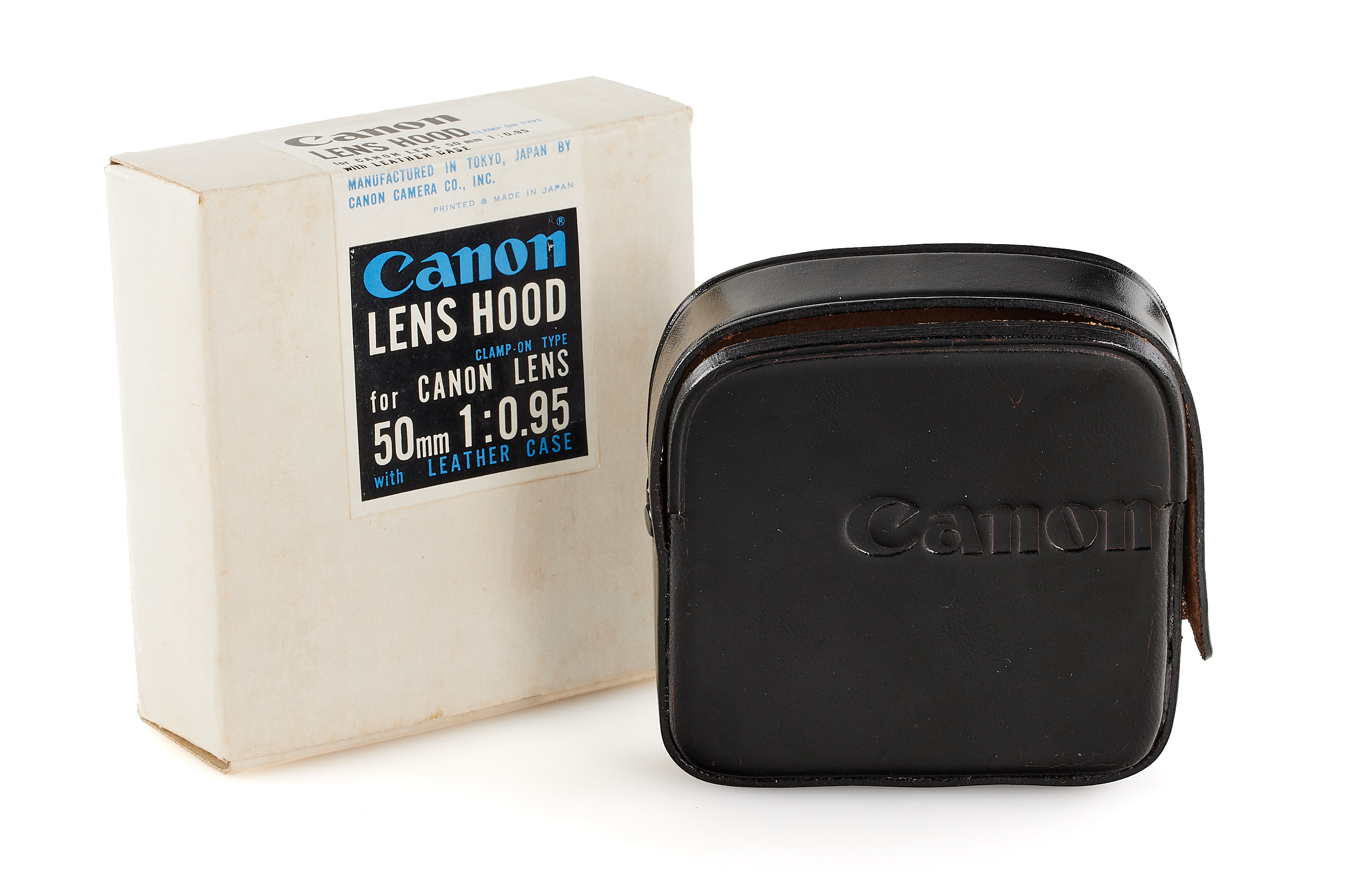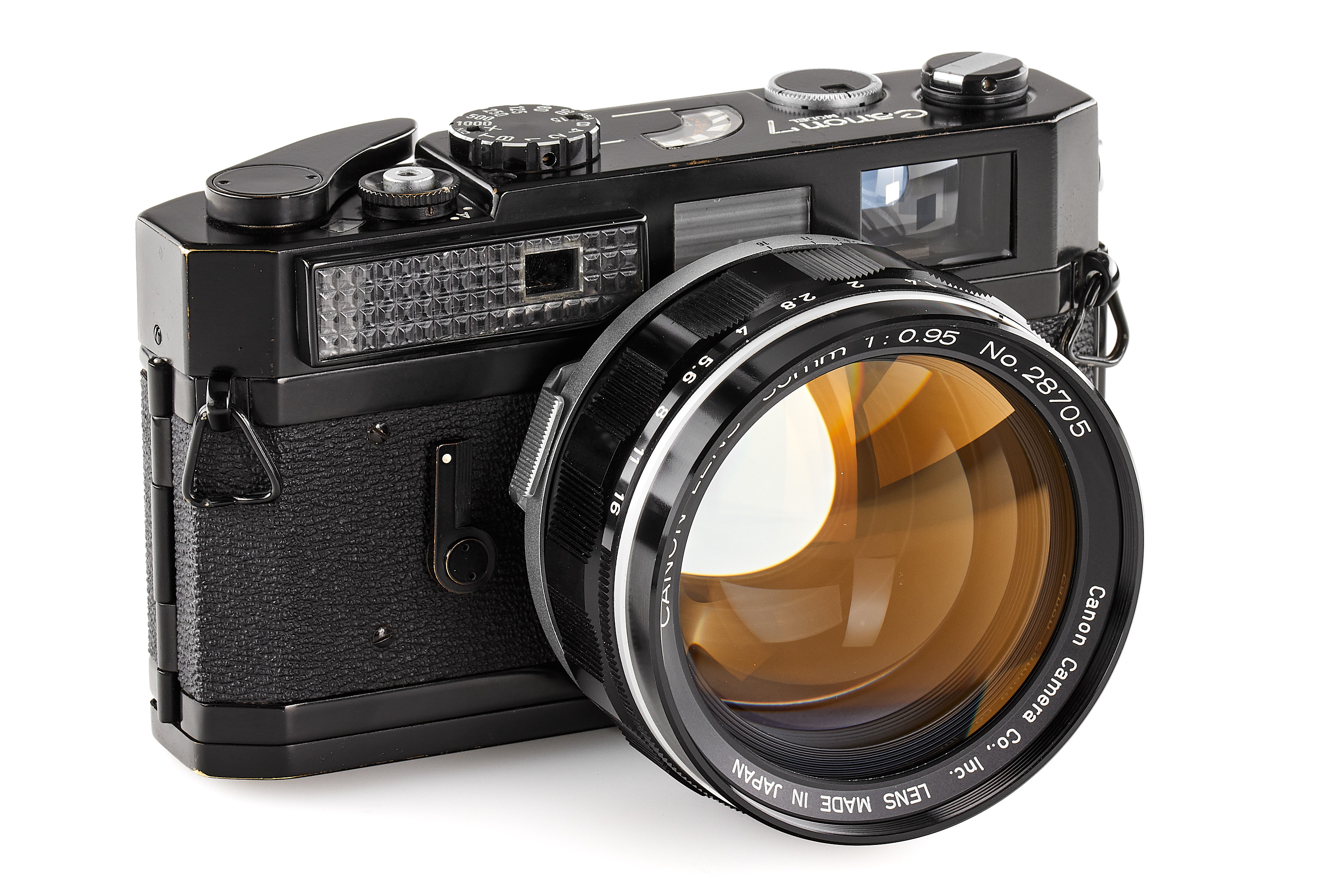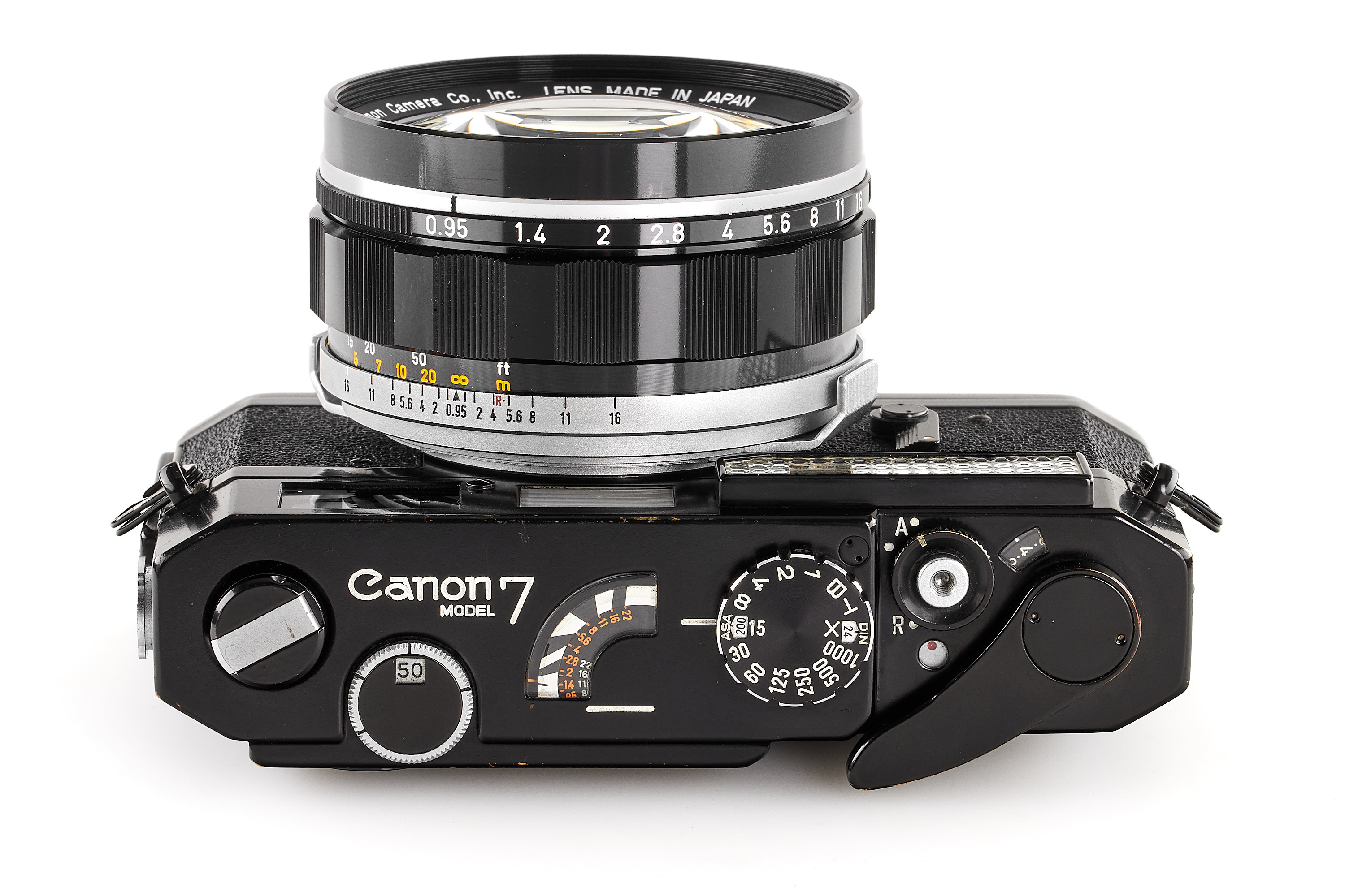 A rare black paint Canon 7 in beautiful, near-mint condition, with only minimal patina of use around the edges, with the ultra-fast Canon 0.95/50mm no.28705 (near-mint, with very good optics, including boxed hood, cap, protection filter). The set also includes a maker's box with matching camera serial number, Japanese instructions and papers.