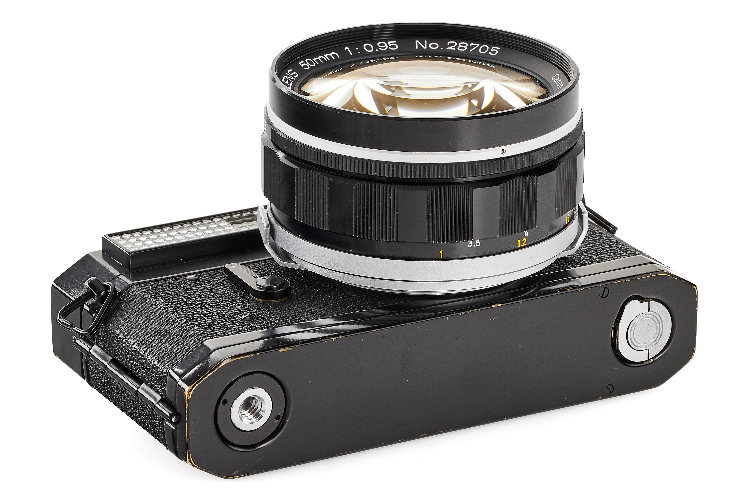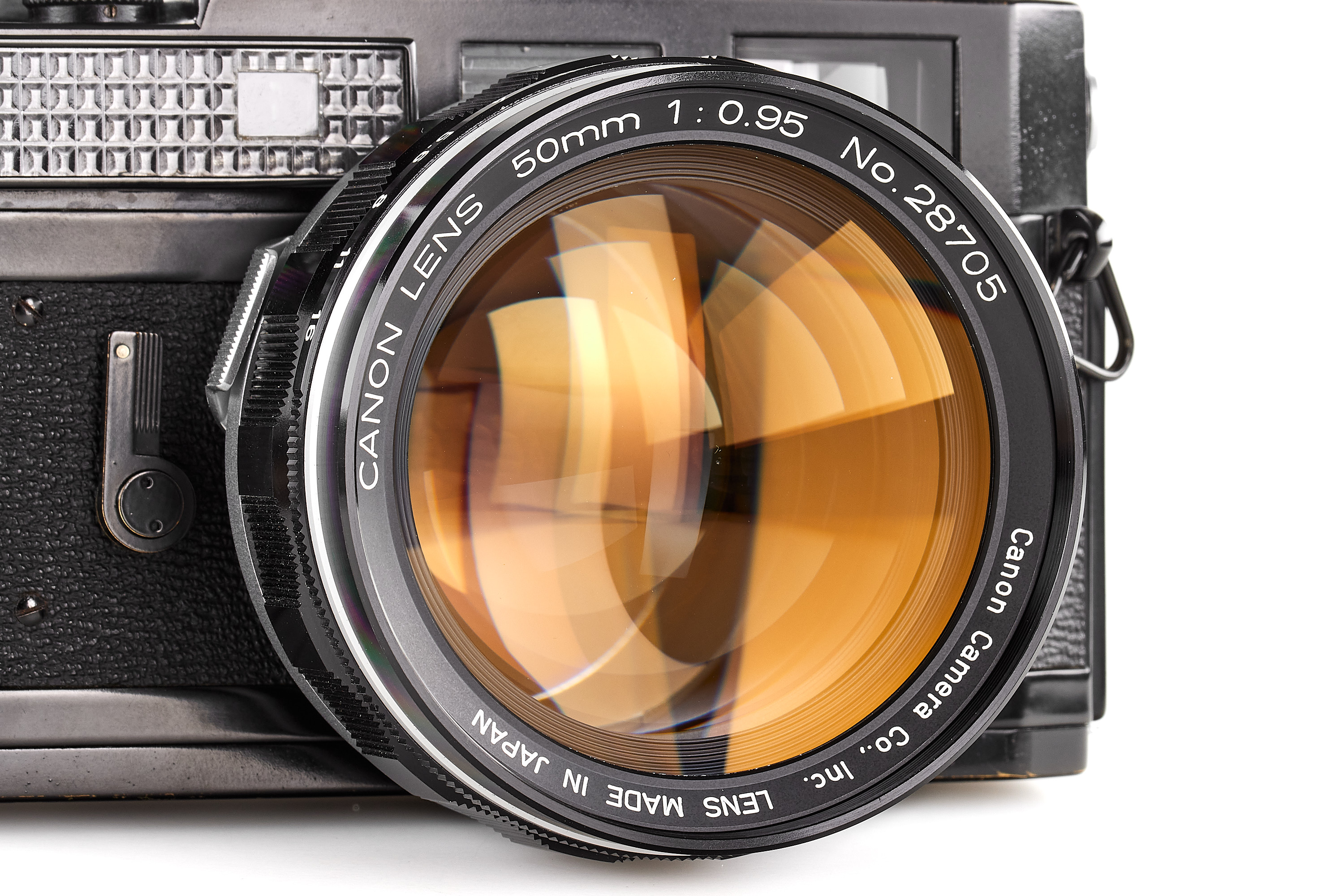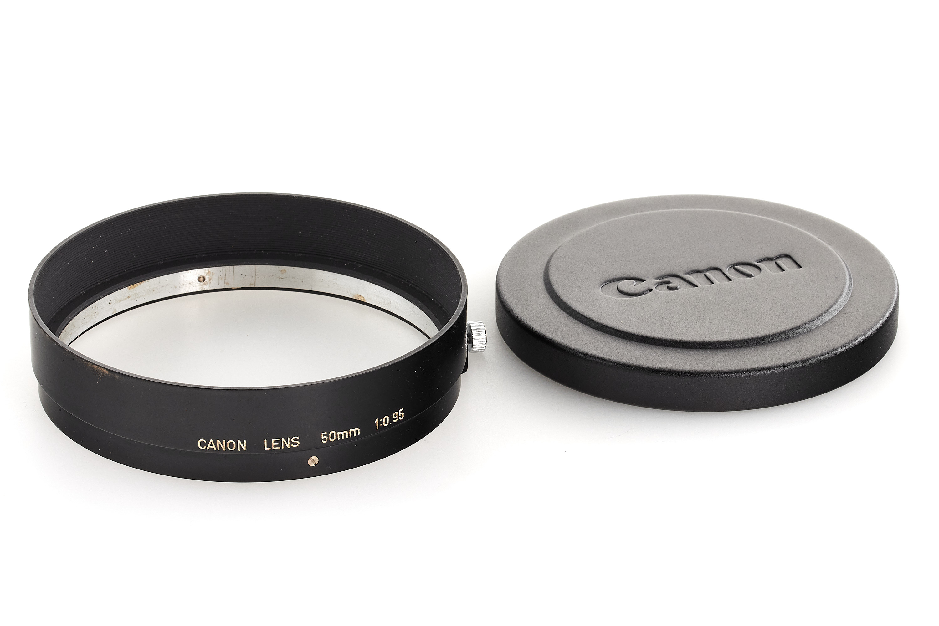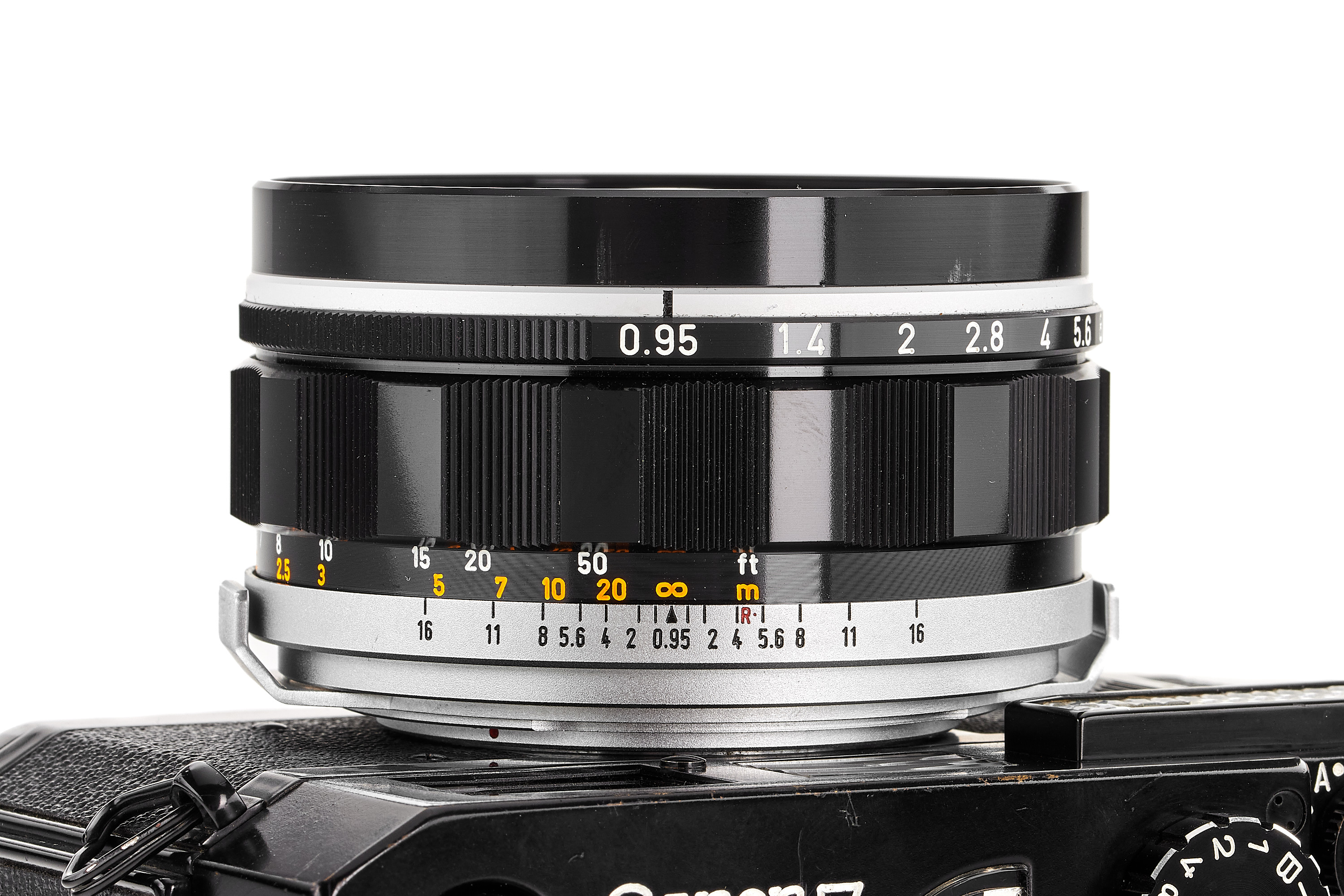 A rare black paint Canon 7 in beautiful, near-mint condition, with only minimal patina of use around the edges, with the ultra-fast Canon 0.95/50mm no.28705 (near-mint, with very good optics, including boxed hood, cap, protection filter). The set also includes a maker's box with matching camera serial number, Japanese instructions and papers.