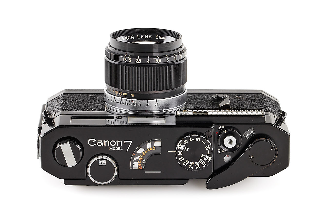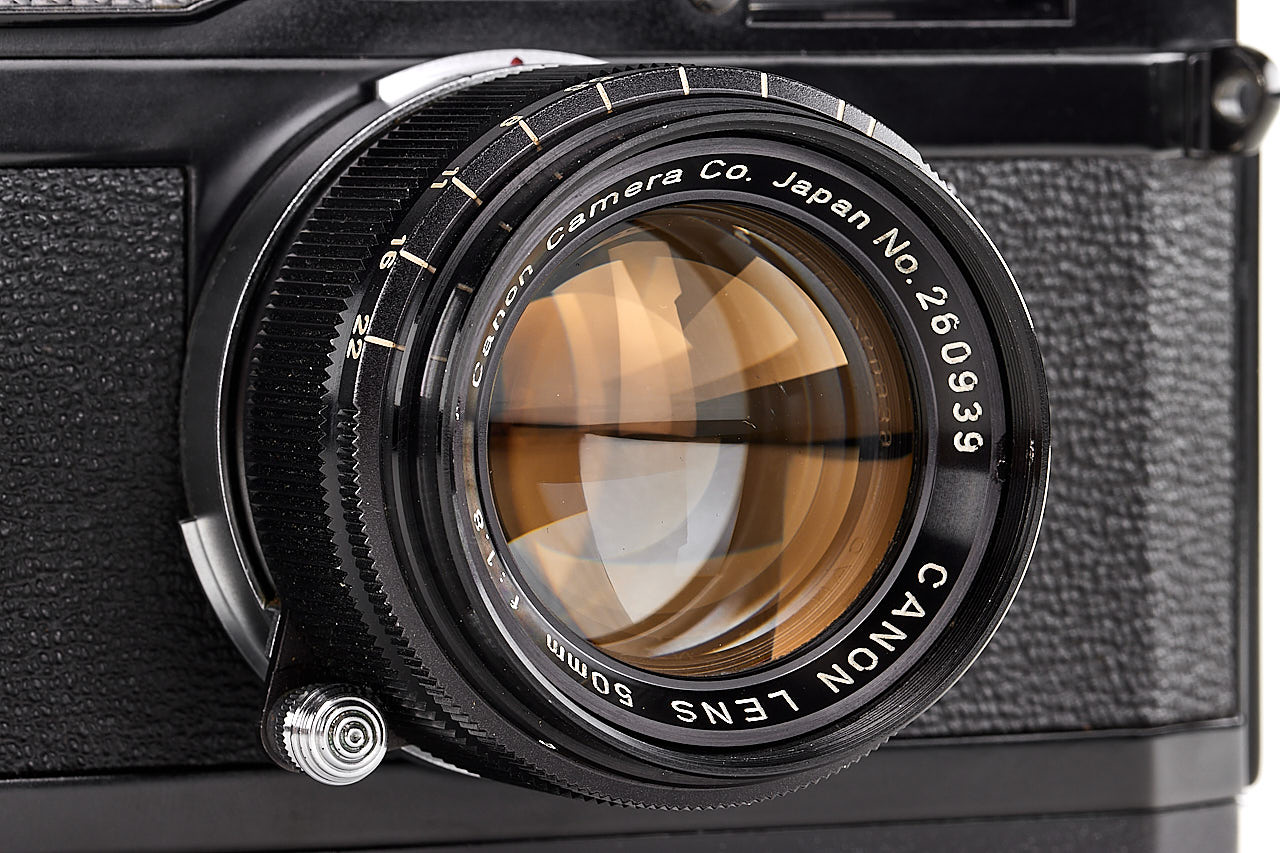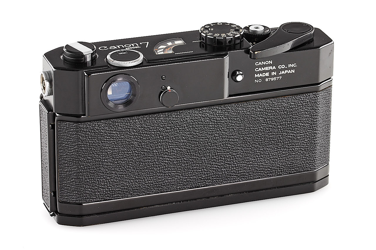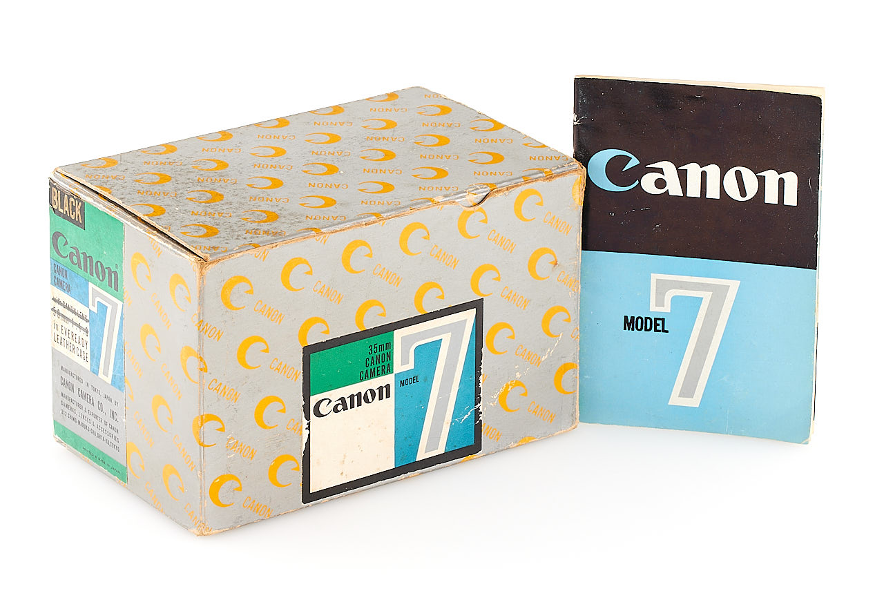 Beautiful and rare Canon 7 in black paint finish, in absolute mint, unrestored condition and in working order, with uncommon, matching all-black M39 meter scale Canon 1.8/50mm no.260939, showing some flaws, with front lens cap, Skylite filter, original hood (leather case), with Japanese instructions, ever-ready case and matching maker's box, both serial numbers are correct(!).