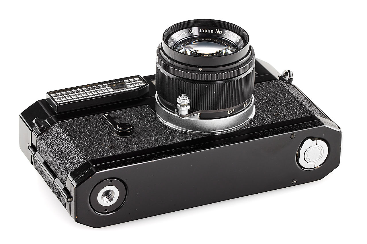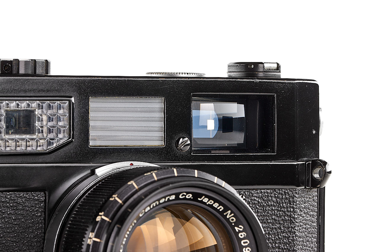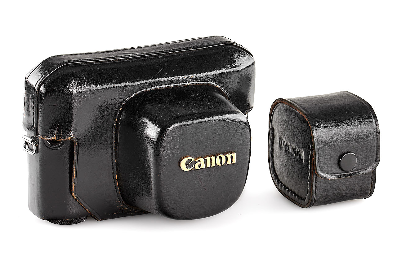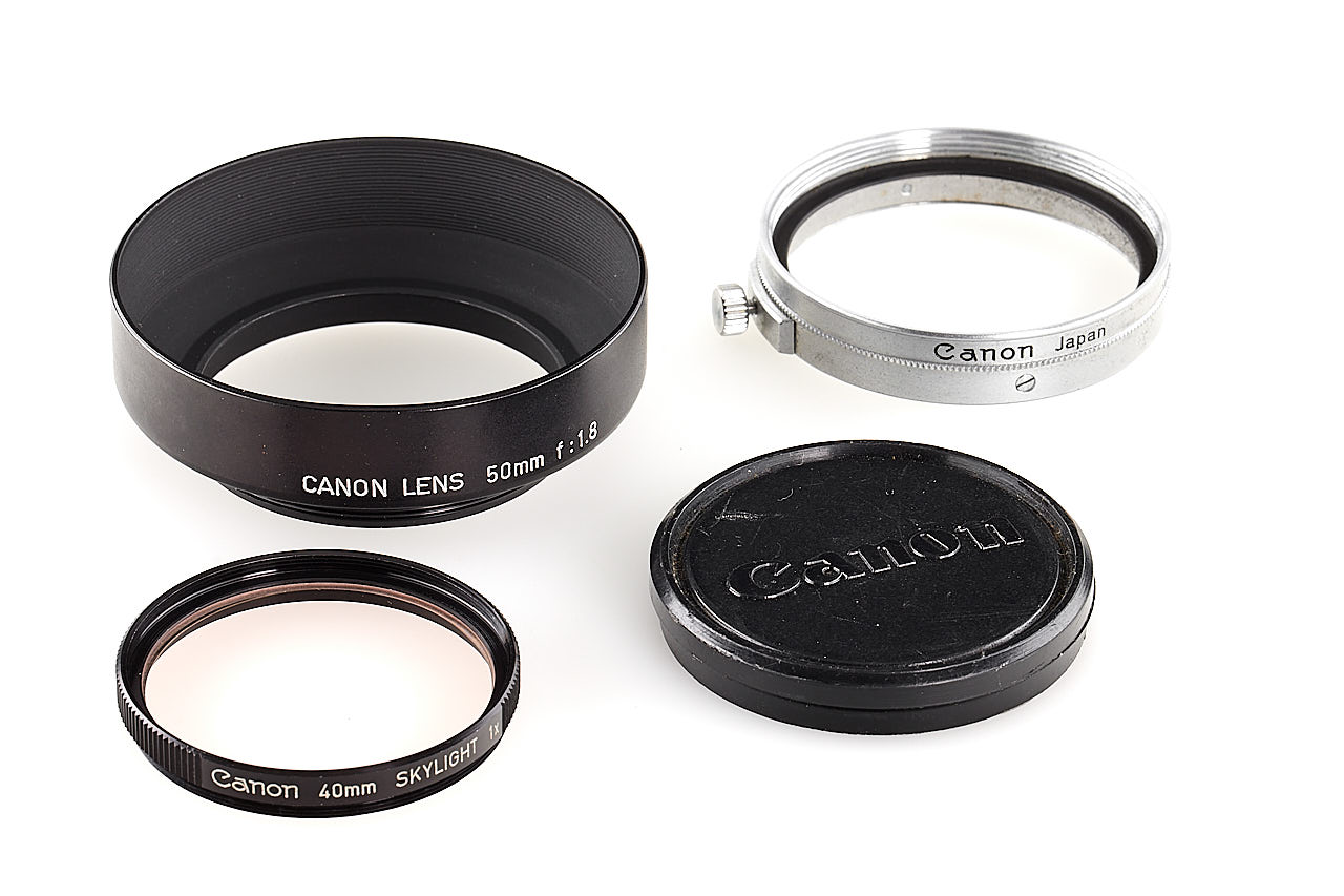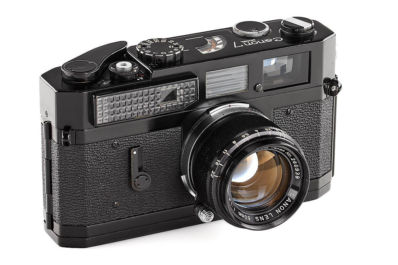 Beautiful and rare Canon 7 in black paint finish, in absolute mint, unrestored condition and in working order, with uncommon, matching all-black M39 meter scale Canon 1.8/50mm no.260939, showing some flaws, with front lens cap, Skylite filter, original hood (leather case), with Japanese instructions, ever-ready case and matching maker's box, both serial numbers are correct(!).