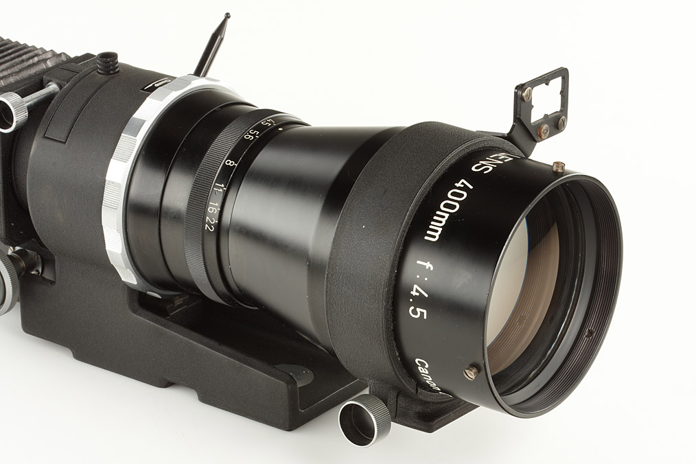 rare third type tele for bellows use in very fine condition with hood, Canon reflex housing 2 with bayonet mount, Canon lens supporter