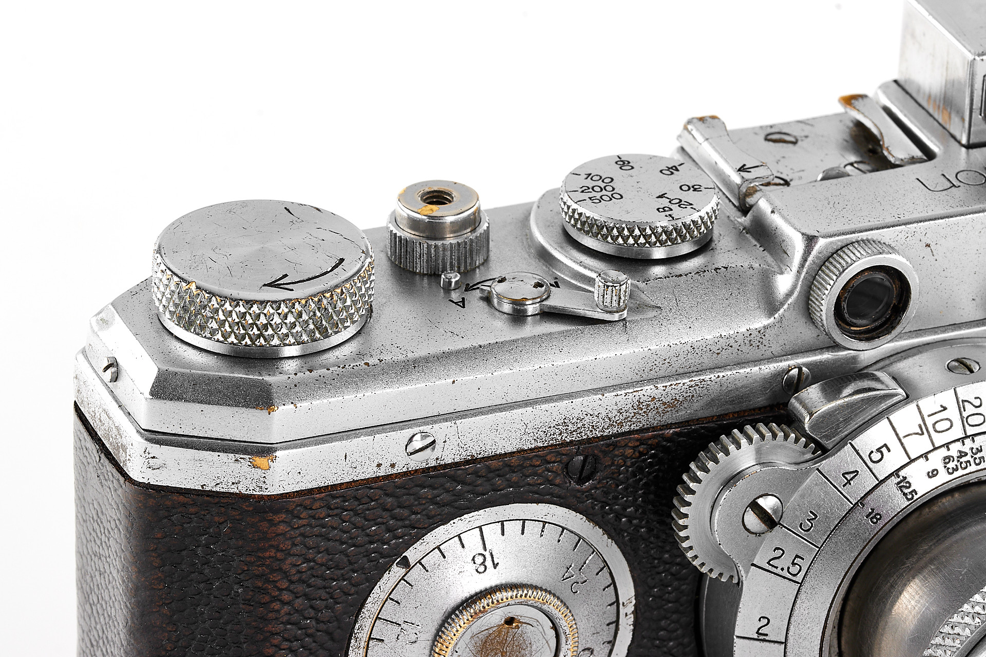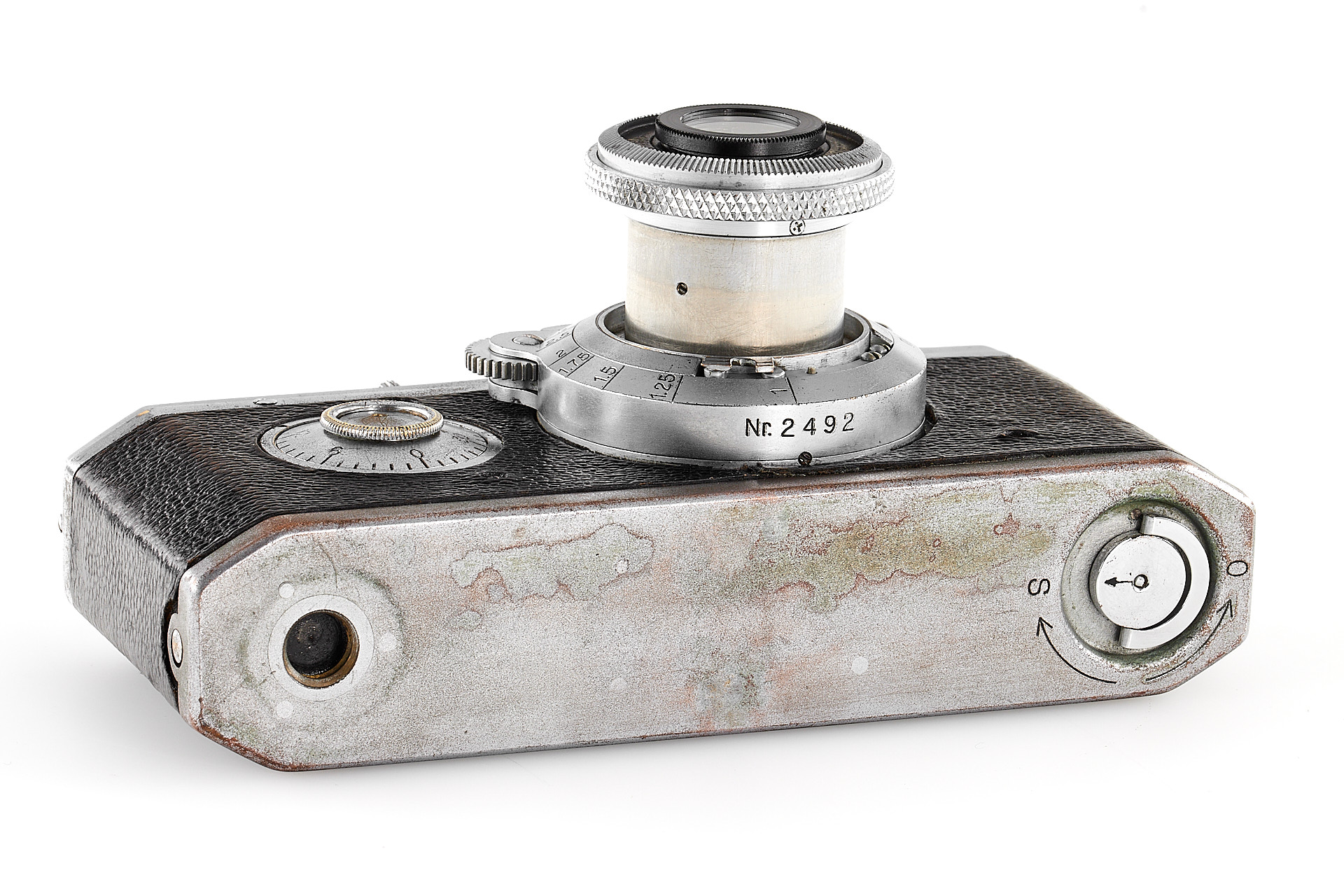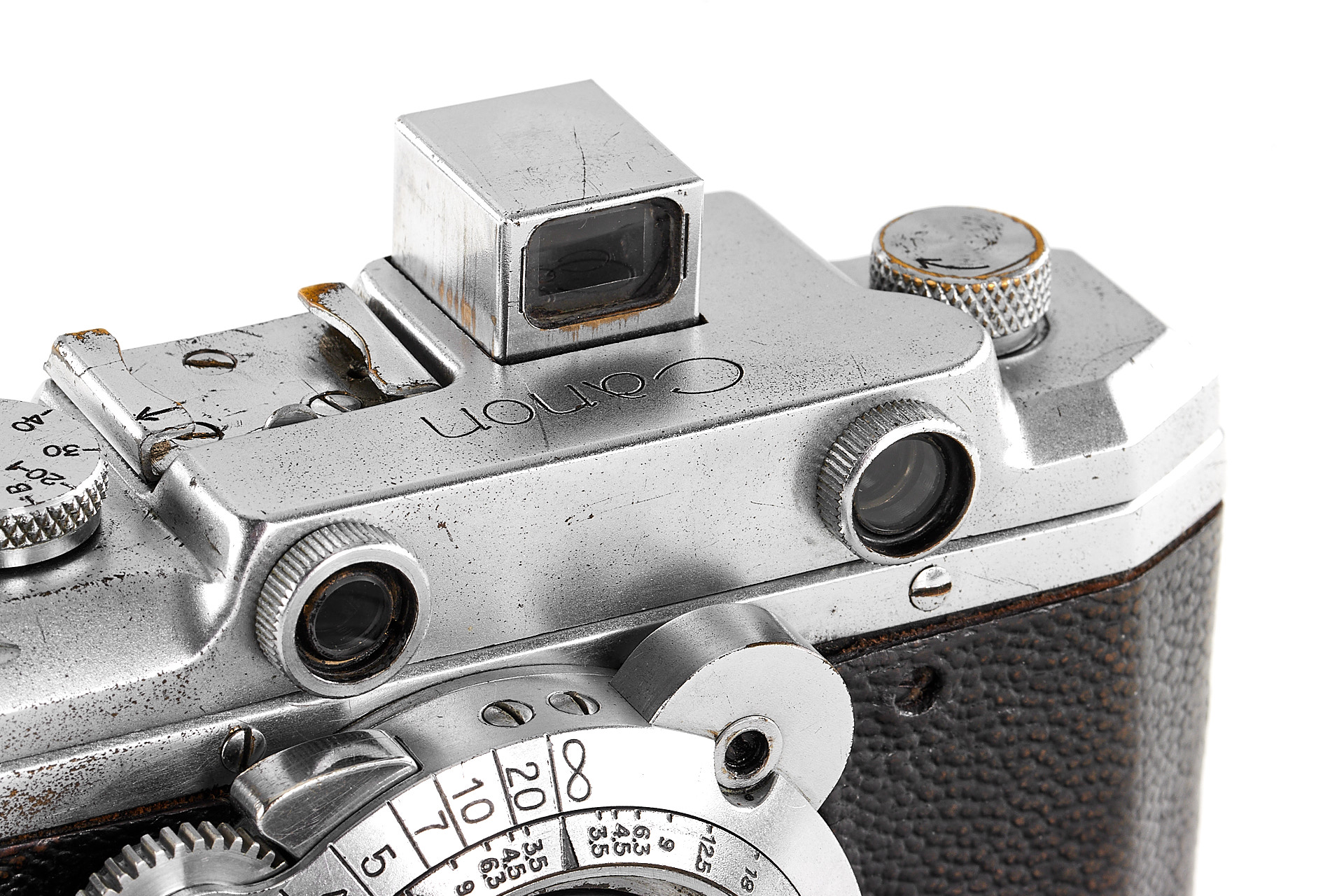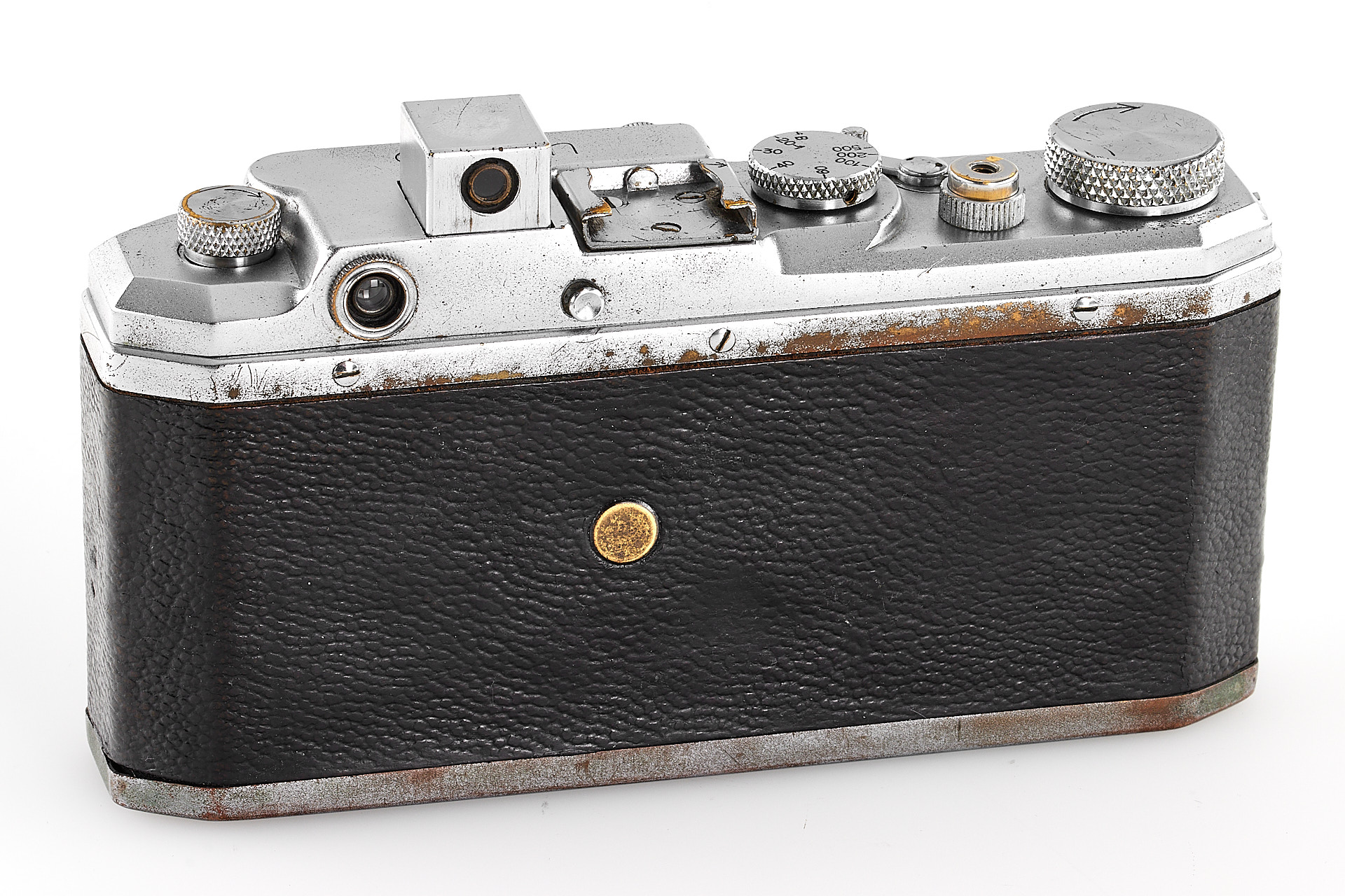 Rare variation of the Canon Hansa, without the 'Hansa' name engraved on the top plate, these uncommon cameras were sold directly from the factory, unlike the more common 'Hansa' - engraved version distributed by Omiya Photo Supply Co., the offered camera is in fine, original condition, lens mount number is 2492, the base plate is unnumbered. Included is an early, black-face Nikkor 3.5/50mm.