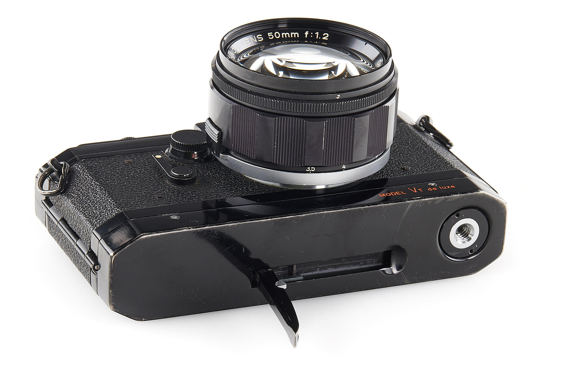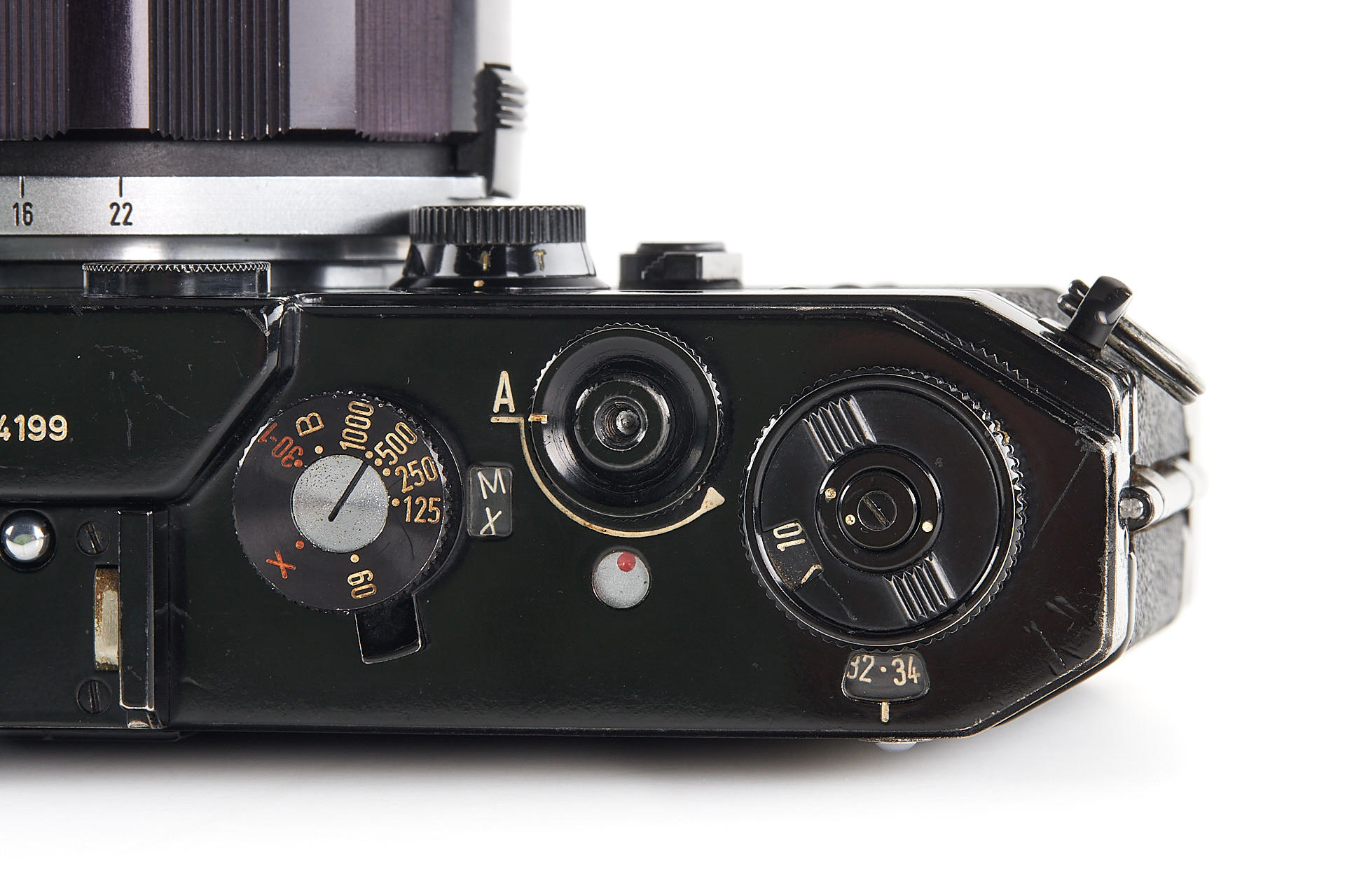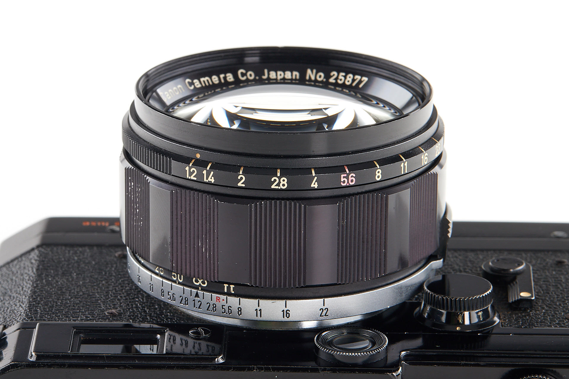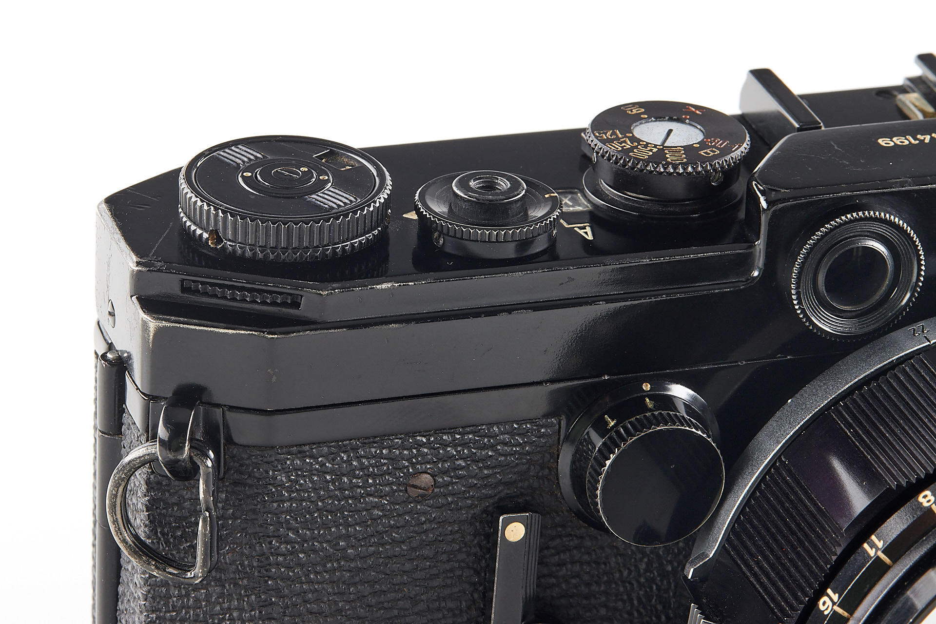 Very rare original black paint body in very good condition and working order, first version with cloth shutter curtains and no baseplate opening key, with rare all-black 1.2/50mm no.25877 (perfect optics), with front cap
