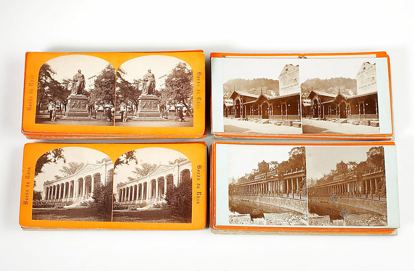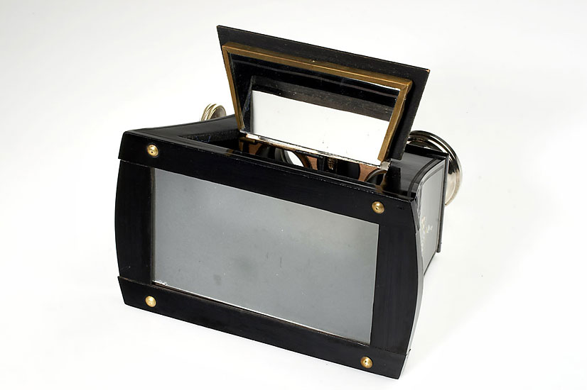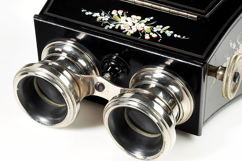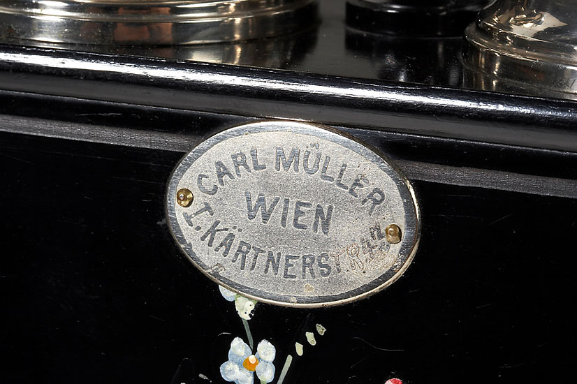 elegant Brewster-type stereo viewer for 6x13cm slides and prints, black enamel finish with hand-painted floral designs on all four sides, engraved on the nickel plated eyepieces: “Carl Müller, Wien V, Pilgramgasse 16”. The viewer comes together with 43 stereo cards including the series “Bords du Rhin” (12) and „Karlsbad und Umgebung” (12) and 19 views of Austria by Würthle & Spinnhirn, Salzburg. Except for a very slight dent on one of the eyepieces, the viewer is in near mint condition.