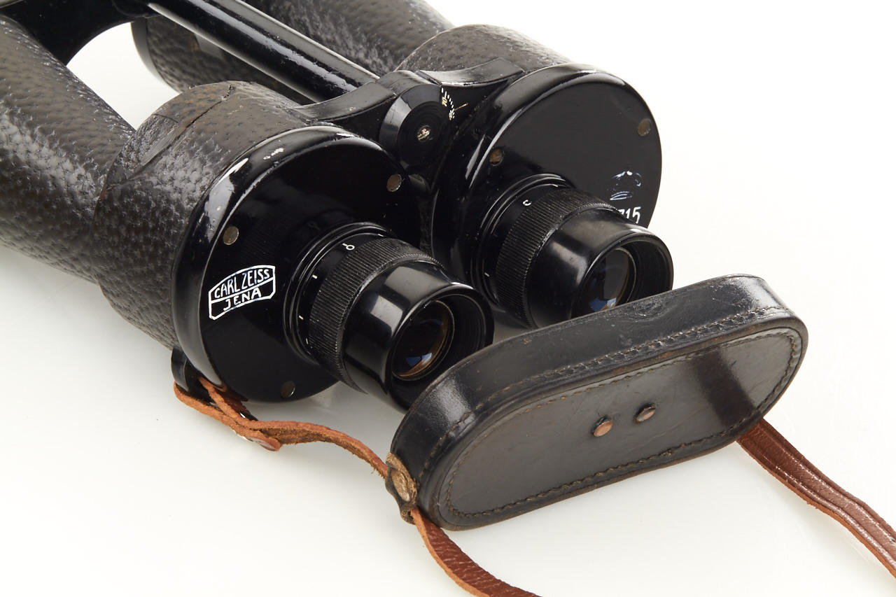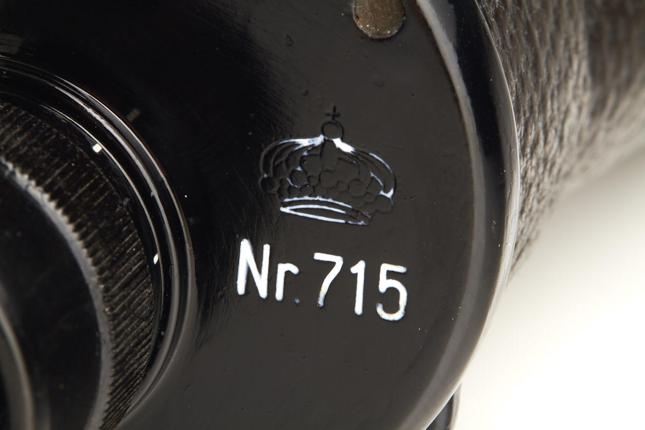 very rare porro prism binoculars made by Zeiss for the Swedish army, marked with crown, with cap, strap, two orange filters and leather case stamped with triple crown and matching serial number