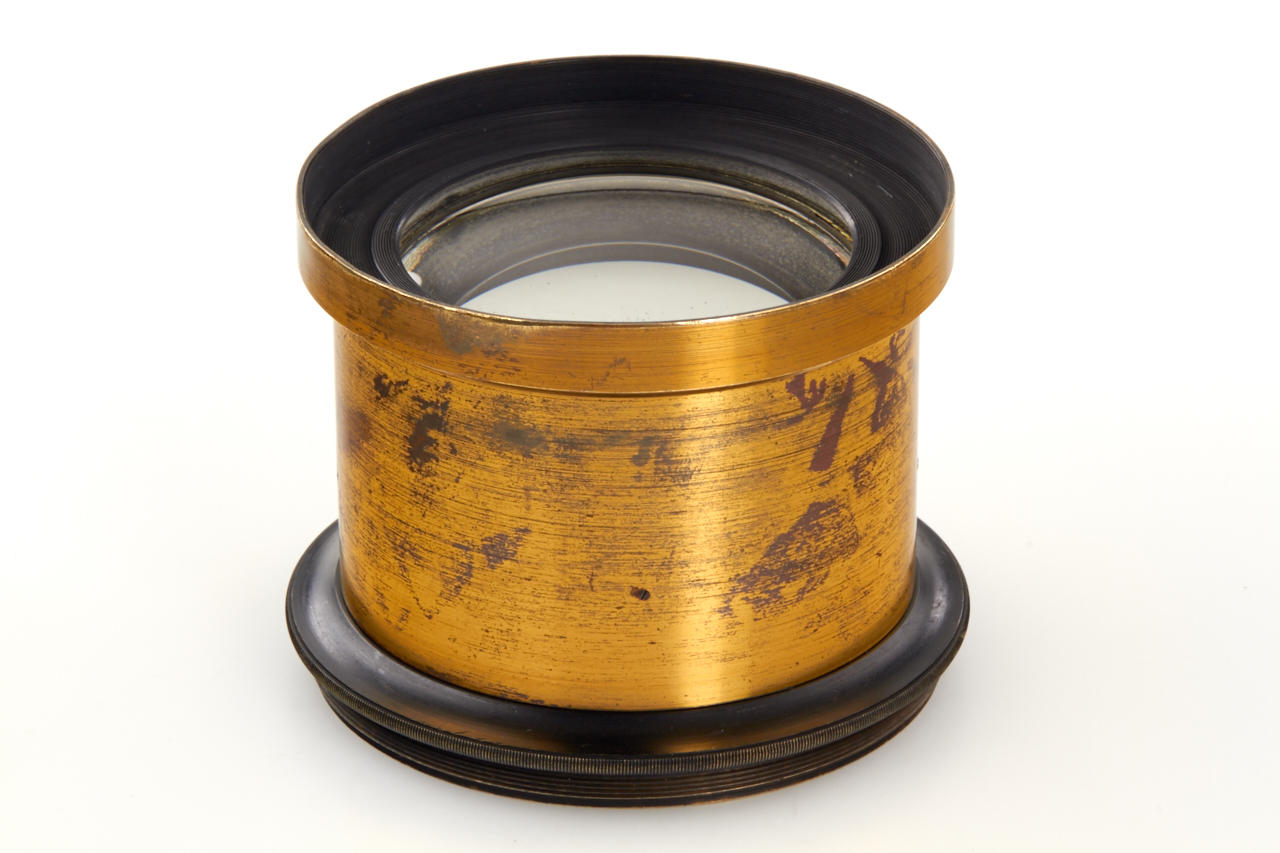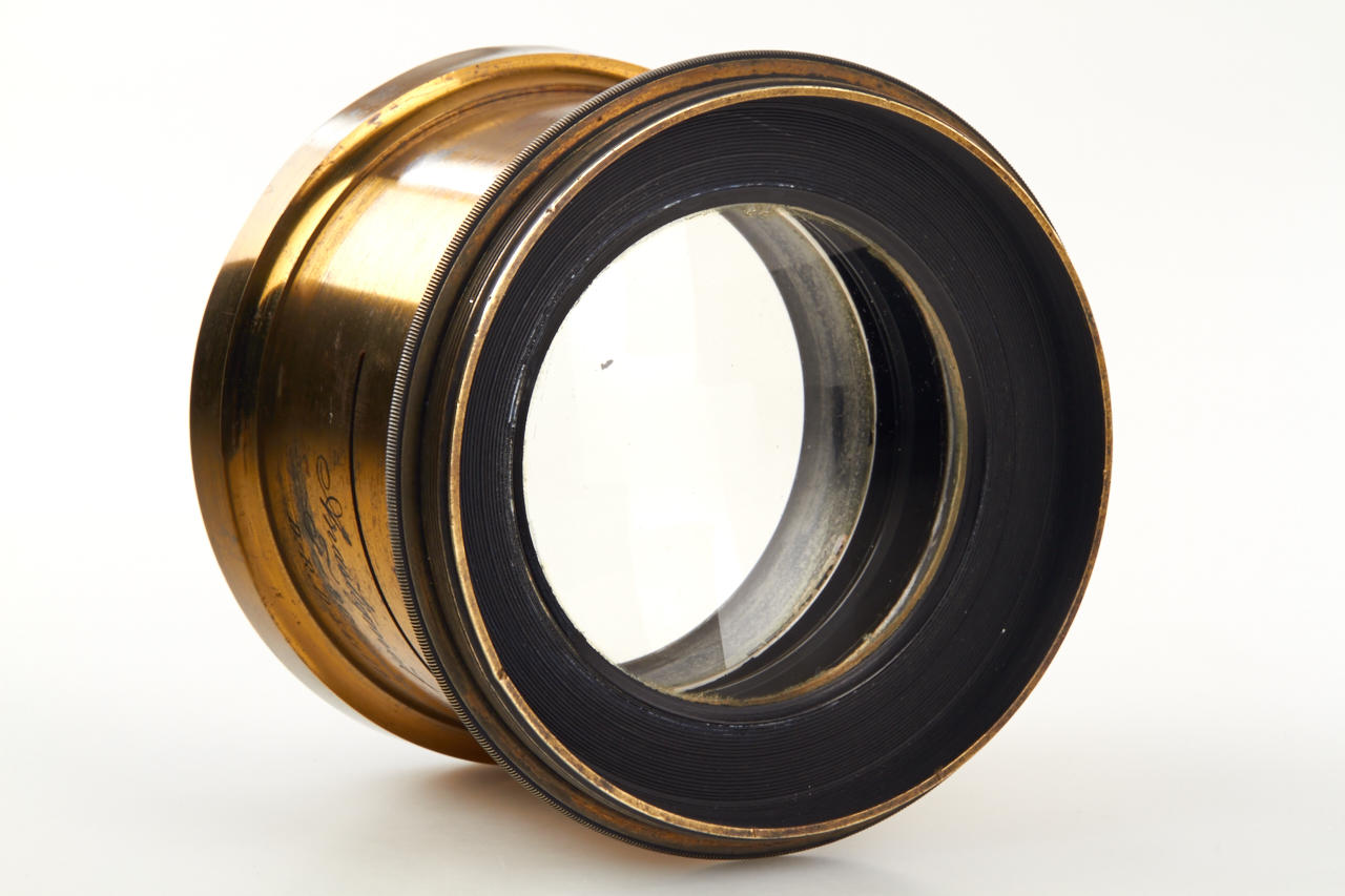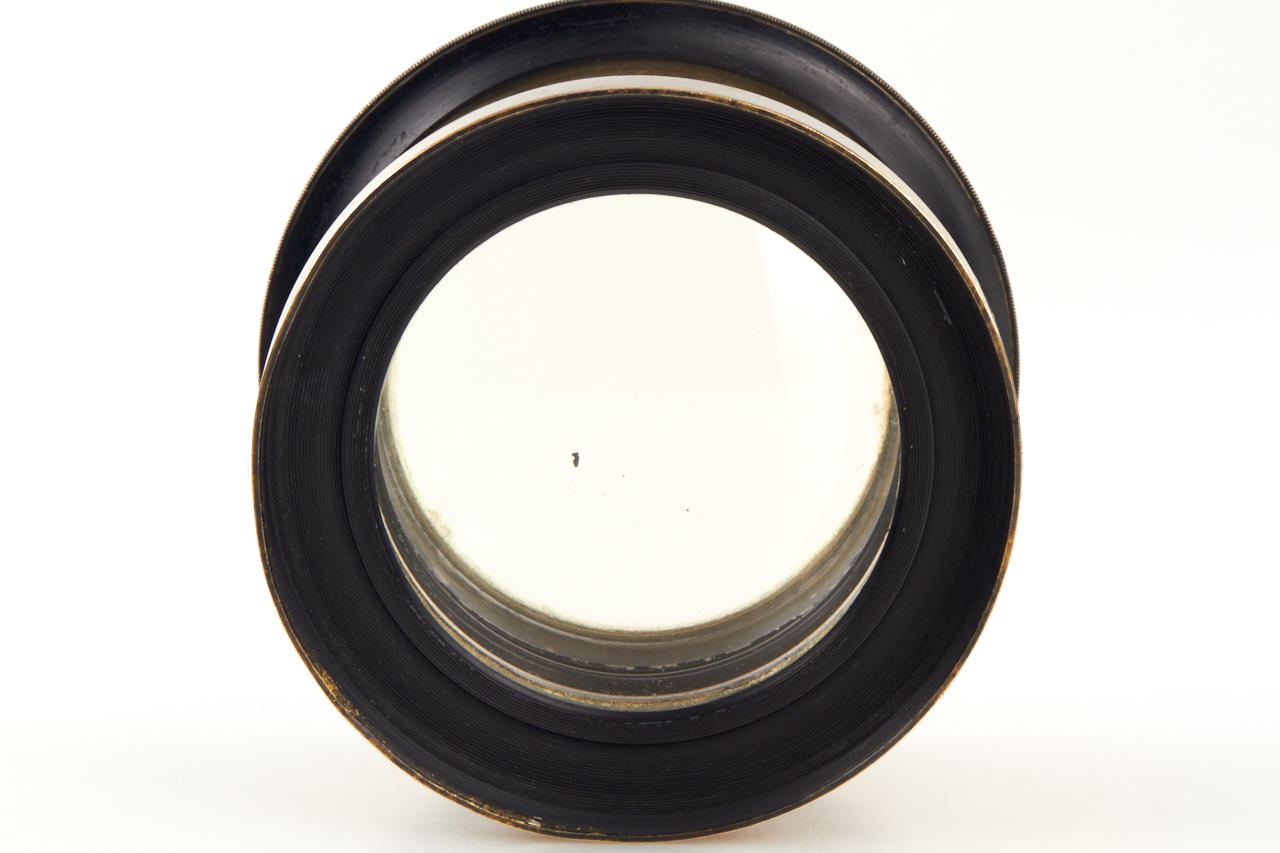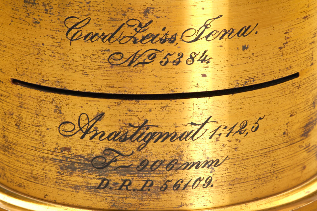 Extremely rare and very early large format, long focal length brass Carl Zeiss lens. One of very few existing lenses manufactured in April 1893 - front and rear element diameter 75mm, total height 90mm. In very fine condition, clean optics without scratches, with slot for waterhouse stops.