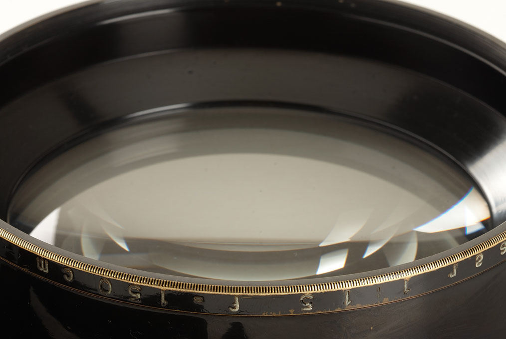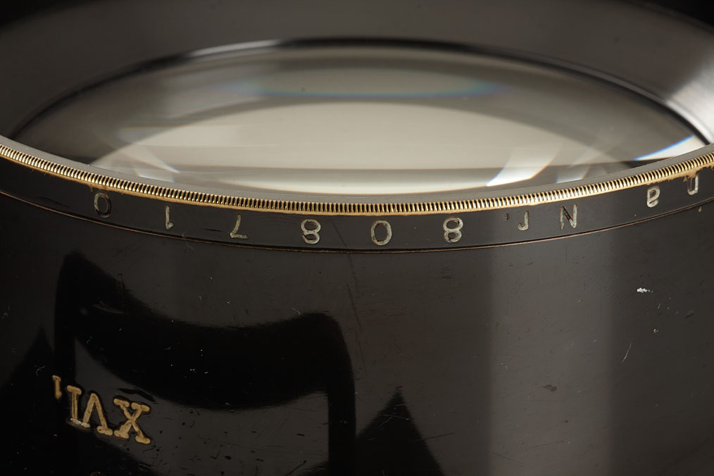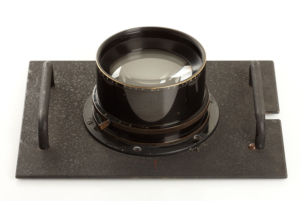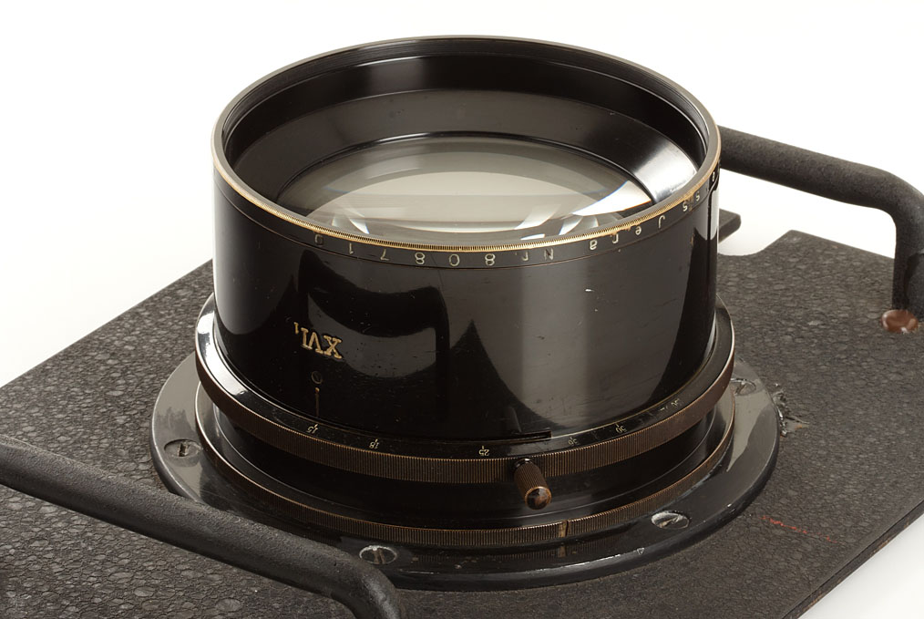 unknown lens for reproduction, with iris diaphragm, mounted on a lens-board with 2 handles, engraved: XVI1