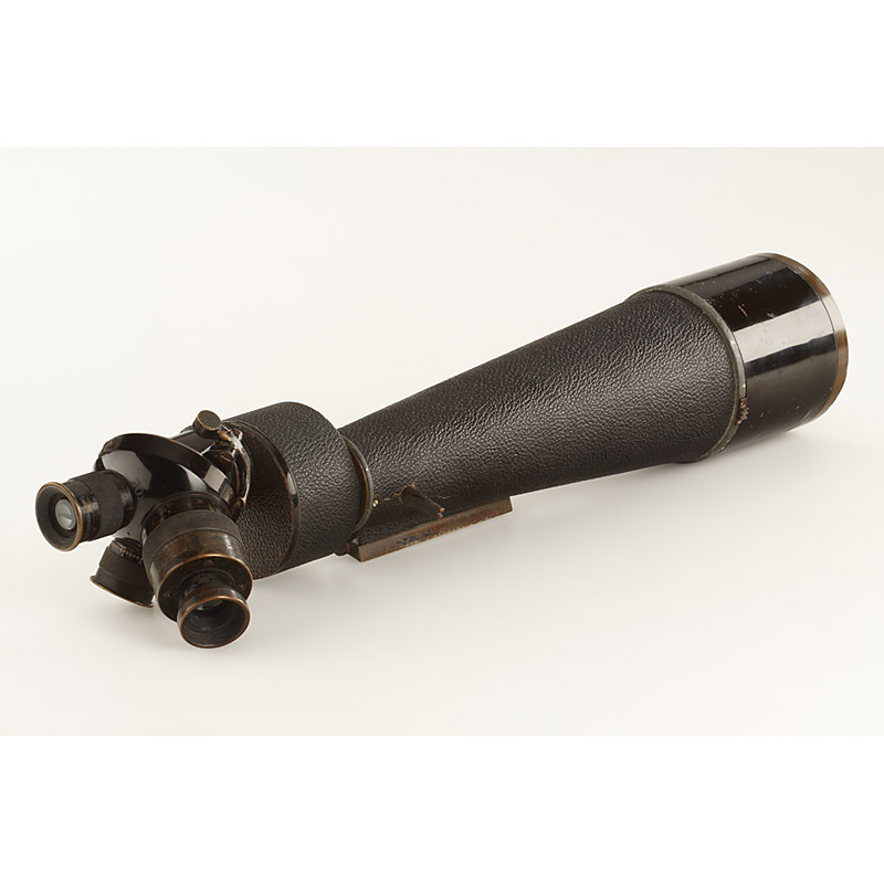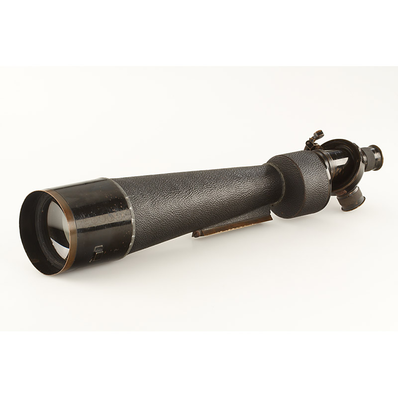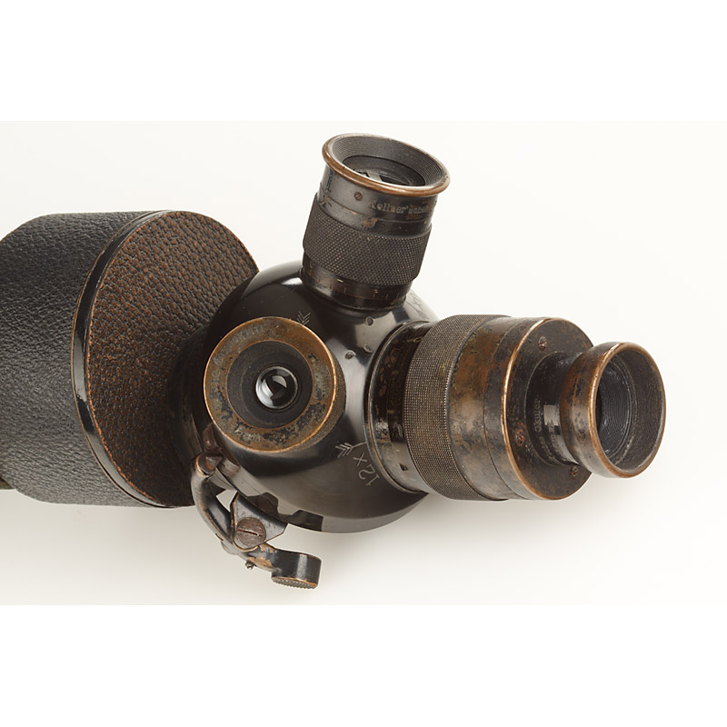 The monocular Carl Zeiss Asem telescope actually is half an Asembi Telsescope, dating from World War I. Like the 'Starmor' it has a ocular revolver, yet with 12, 20 and 40 times magnification. Magnification are marked near the oculars with an arrow pointing from the number to them. When turned the revolver snaps in at the right position by means of a spring lever that locks into a groove. Every ocular has a dioptre adjustment. All parts are made of black lacquered brass including the eyecups. The weight of this rare item is 6kg