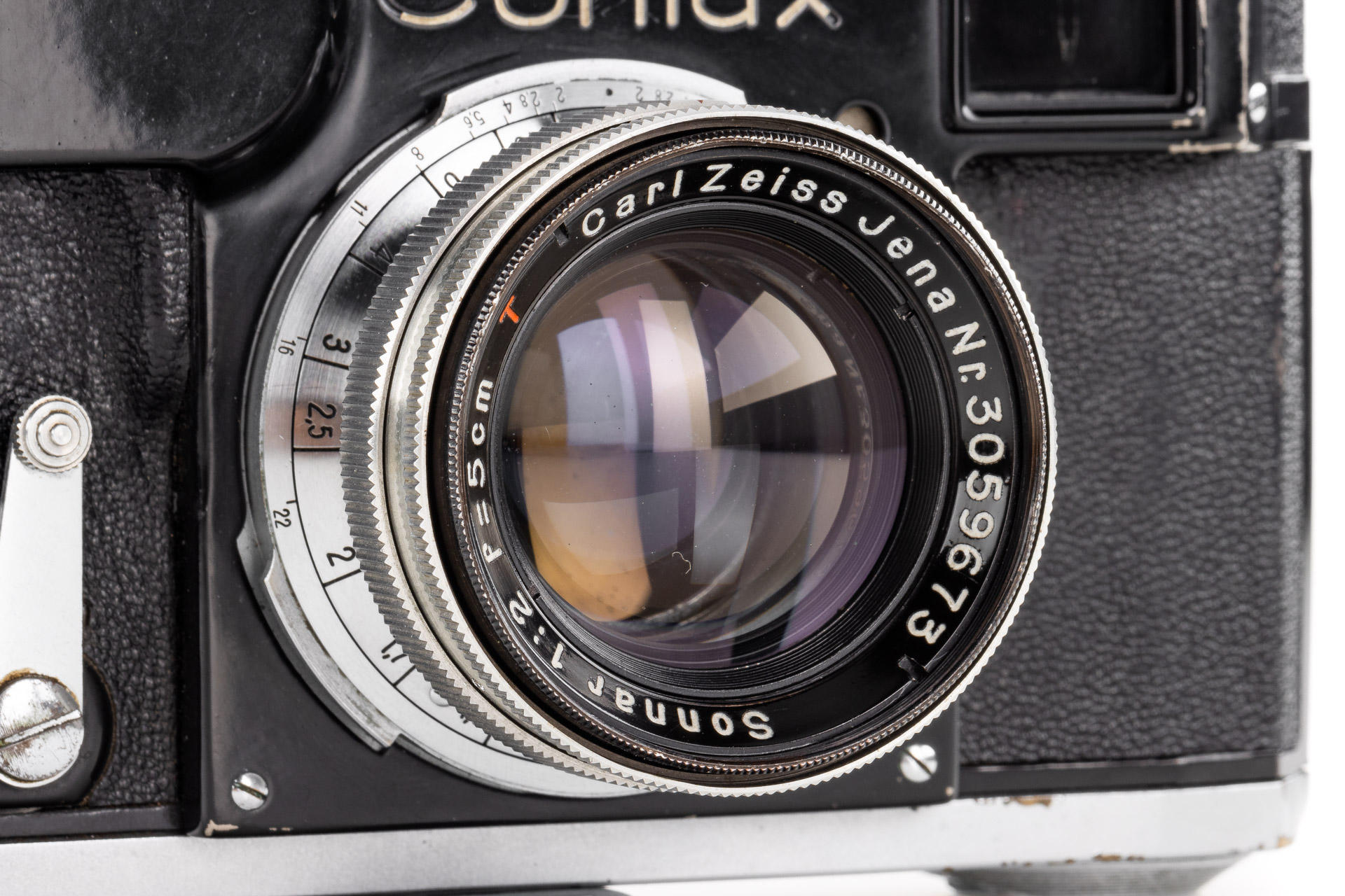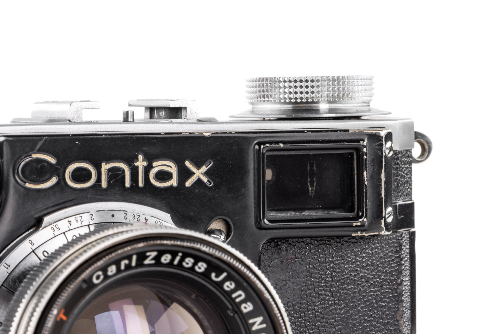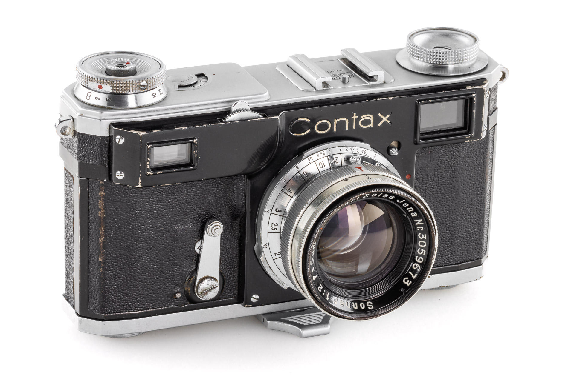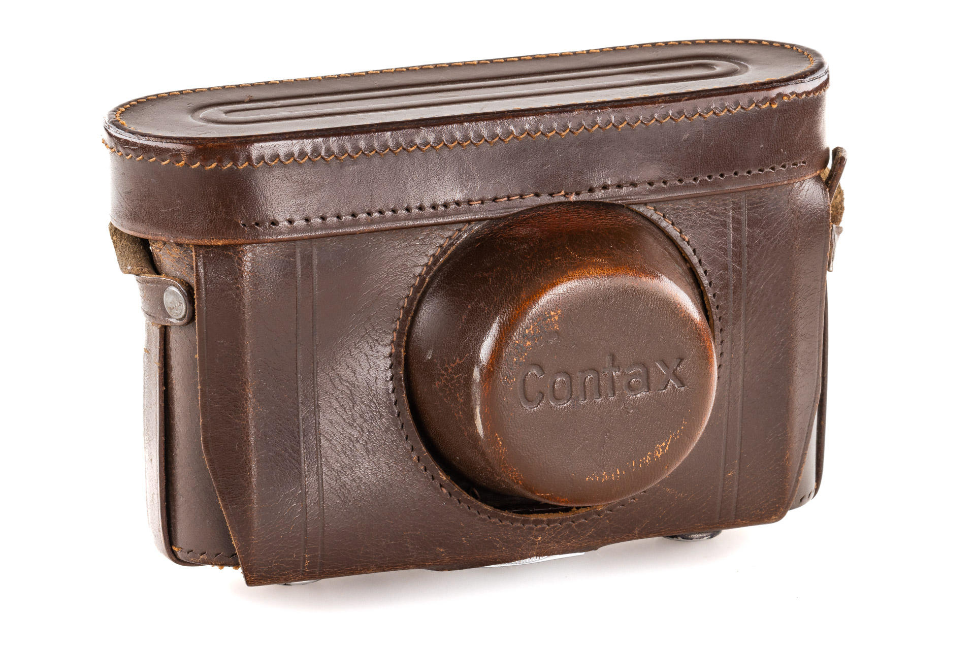 An extremely rare variant of the Jena Contax II, with the front plate finished in black paint; the camera is in very good and original condition, comes with a matching Carl Zeiss Jena Sonnar 2/5cm T no.3059673 and leather case (Cond. B), most probably only 4 to 6 examples of this rare Contax variation have been made, we have presented the cameras no.28068 and no.28079, finished in the same style, in our previous auctions