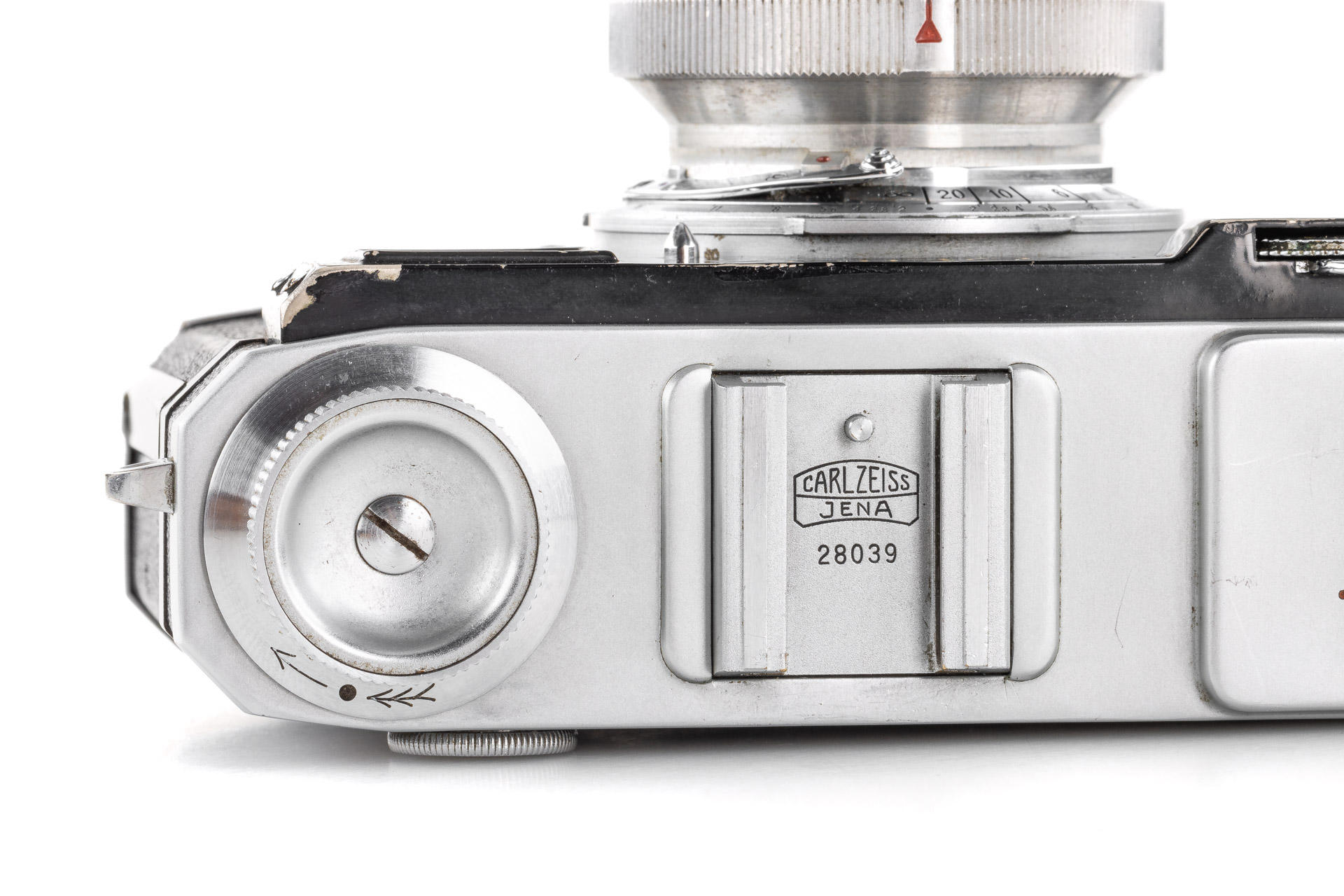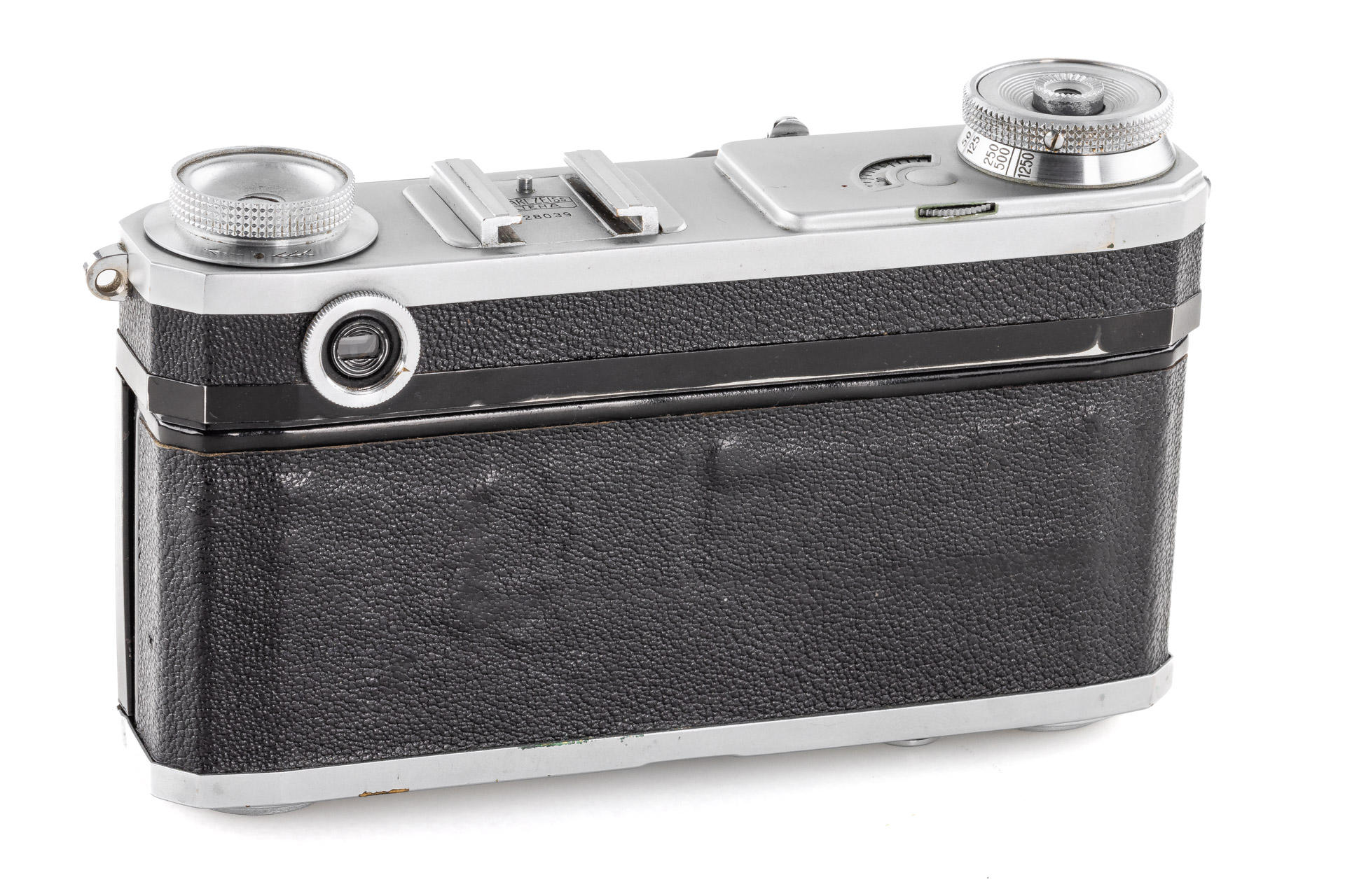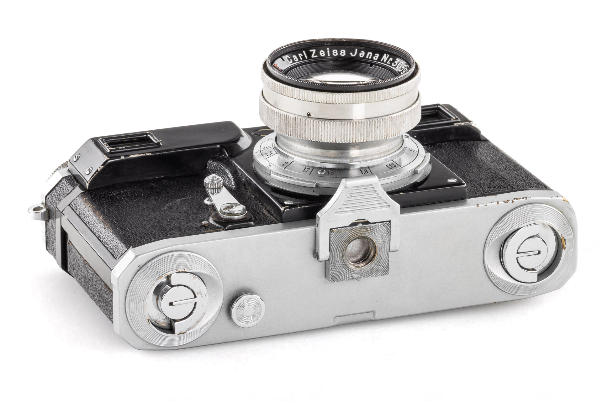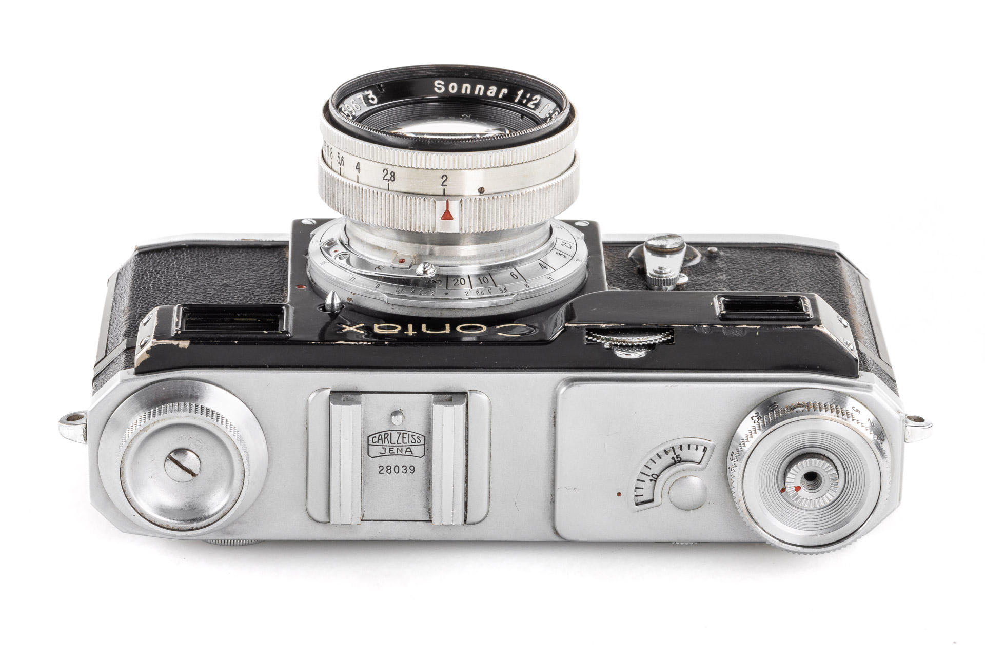 An extremely rare variant of the Jena Contax II, with the front plate finished in black paint; the camera is in very good and original condition, comes with a matching Carl Zeiss Jena Sonnar 2/5cm T no.3059673 and leather case (Cond. B), most probably only 4 to 6 examples of this rare Contax variation have been made, we have presented the cameras no.28068 and no.28079, finished in the same style, in our previous auctions