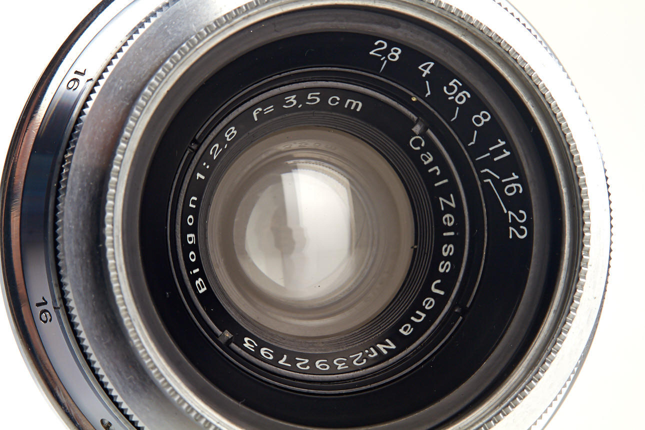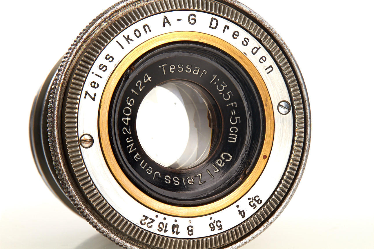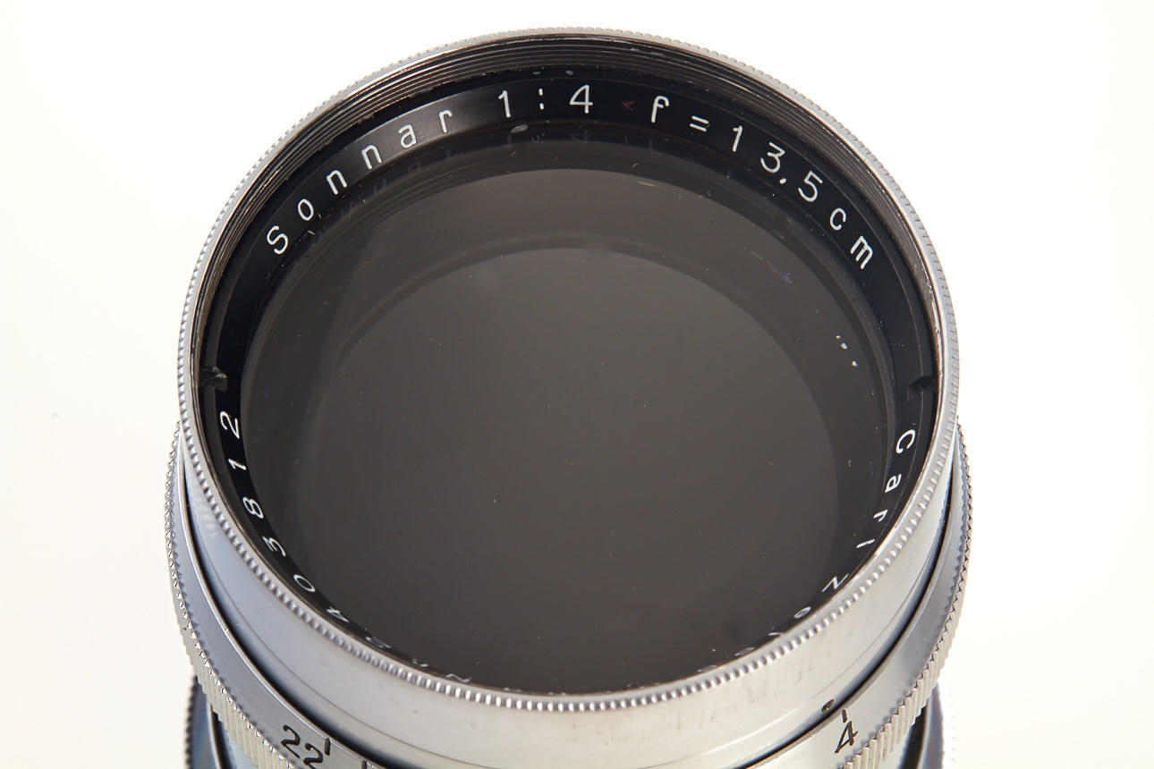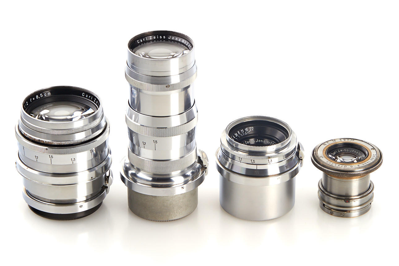 4 Contax pre-war lenses: (1) Biogon 2.8/3.5cm no.2392793 (cond. A-, both original caps and maker's box), (2) Tessar 3.5/5cm no.2406124 (cond. B-), (3) Sonnar 2/8.5cm no.2401485 (cond. B/A, both original caps), (4) Sonnar 4/13.5cm no.2403812 (cond. A/B, both caps, maker's box)