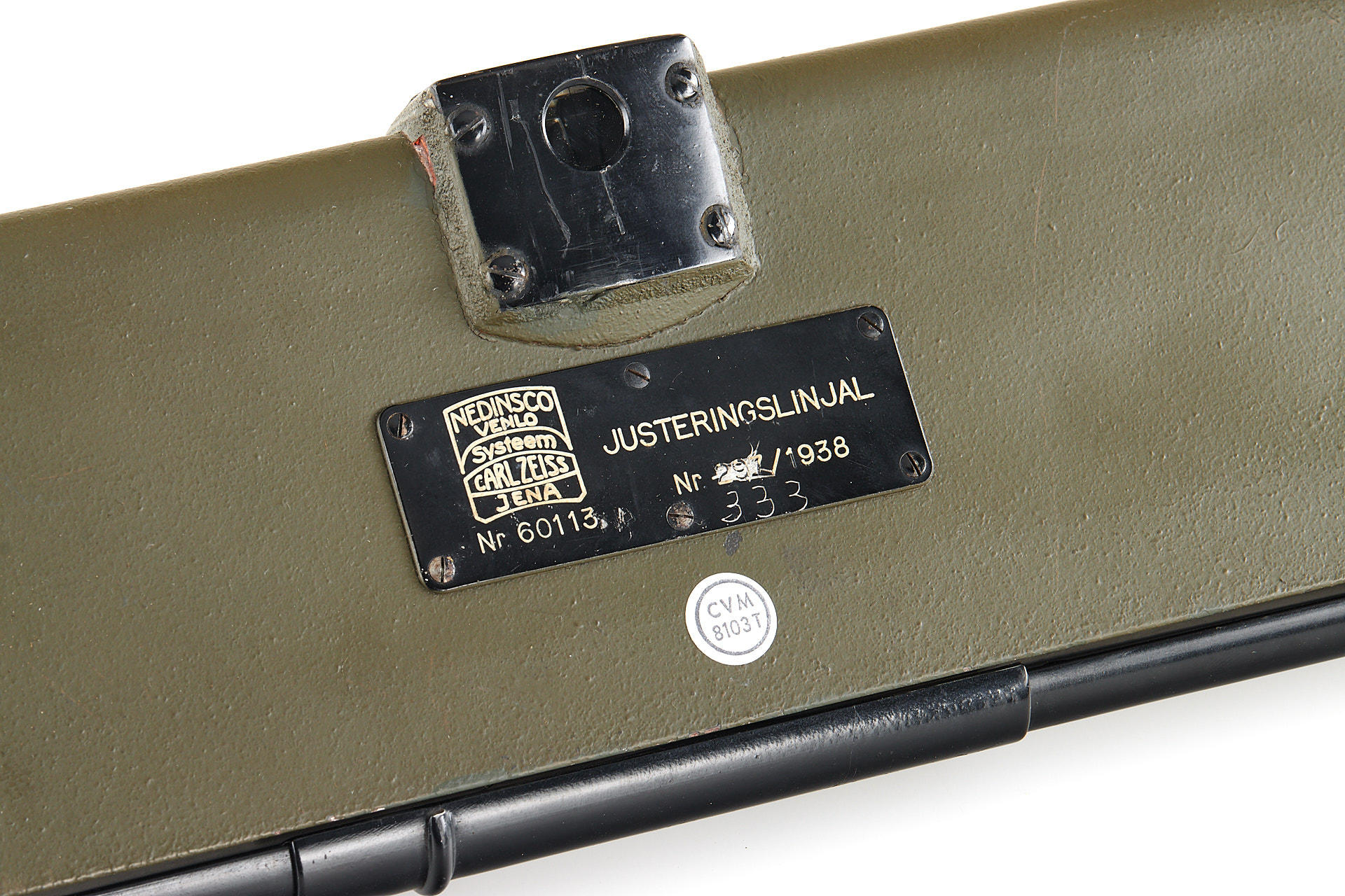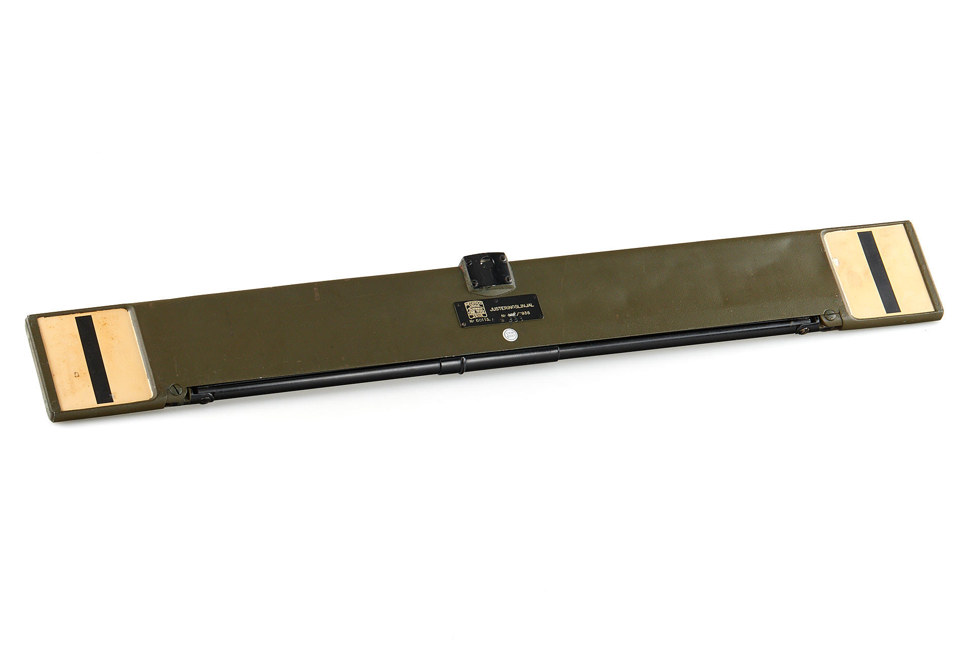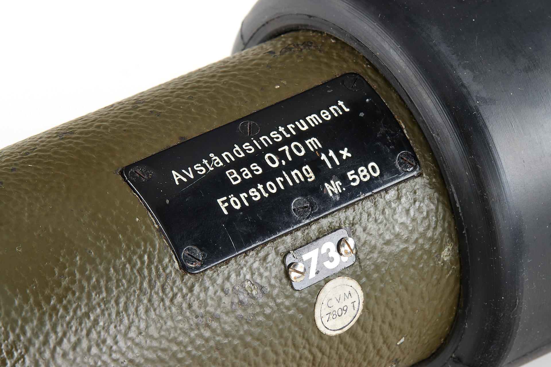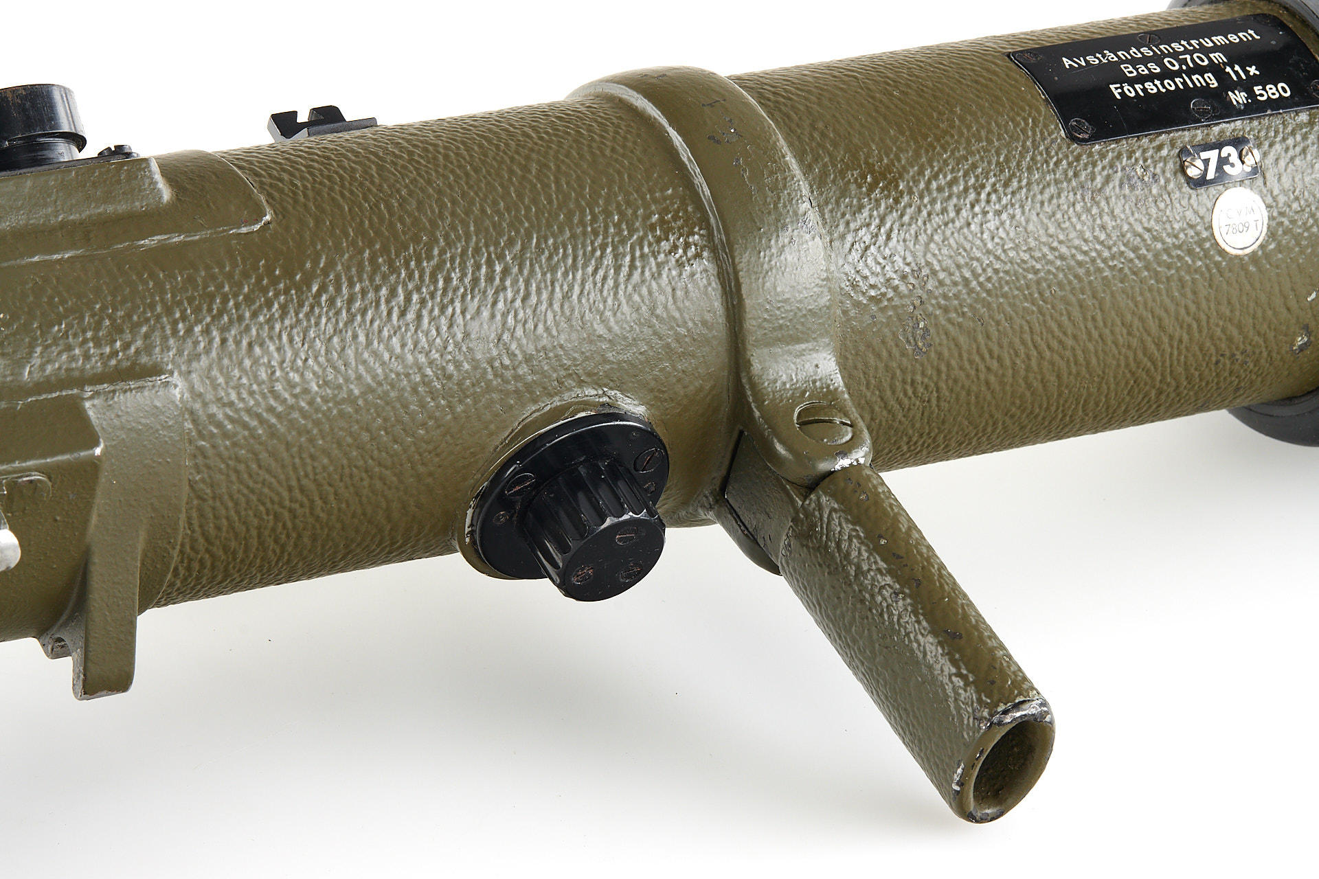 A long-range military rangefinder, made by Carl Zeiss Jena for the Swedish military and delivered shortly before the WWII, 0.7m rangefinder base with 11x enlarging, in excellent original condition and good working order, incl. small tripod, adjusting level, orange filters, everything in a large military-green aluminium case stamped with three crowns