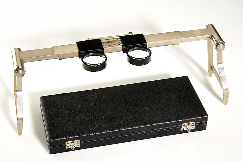 collapsable universal stereoscope used in conjunction with aerial surveillance photography, all parts are made of steel, in nearly mint condition, comes in it´s original black leather-covered fiited case.