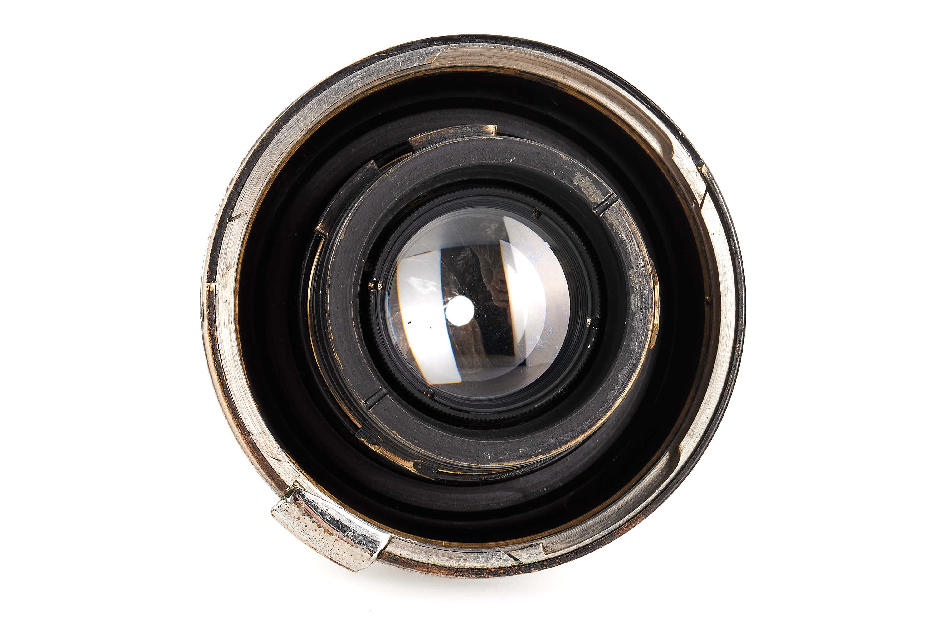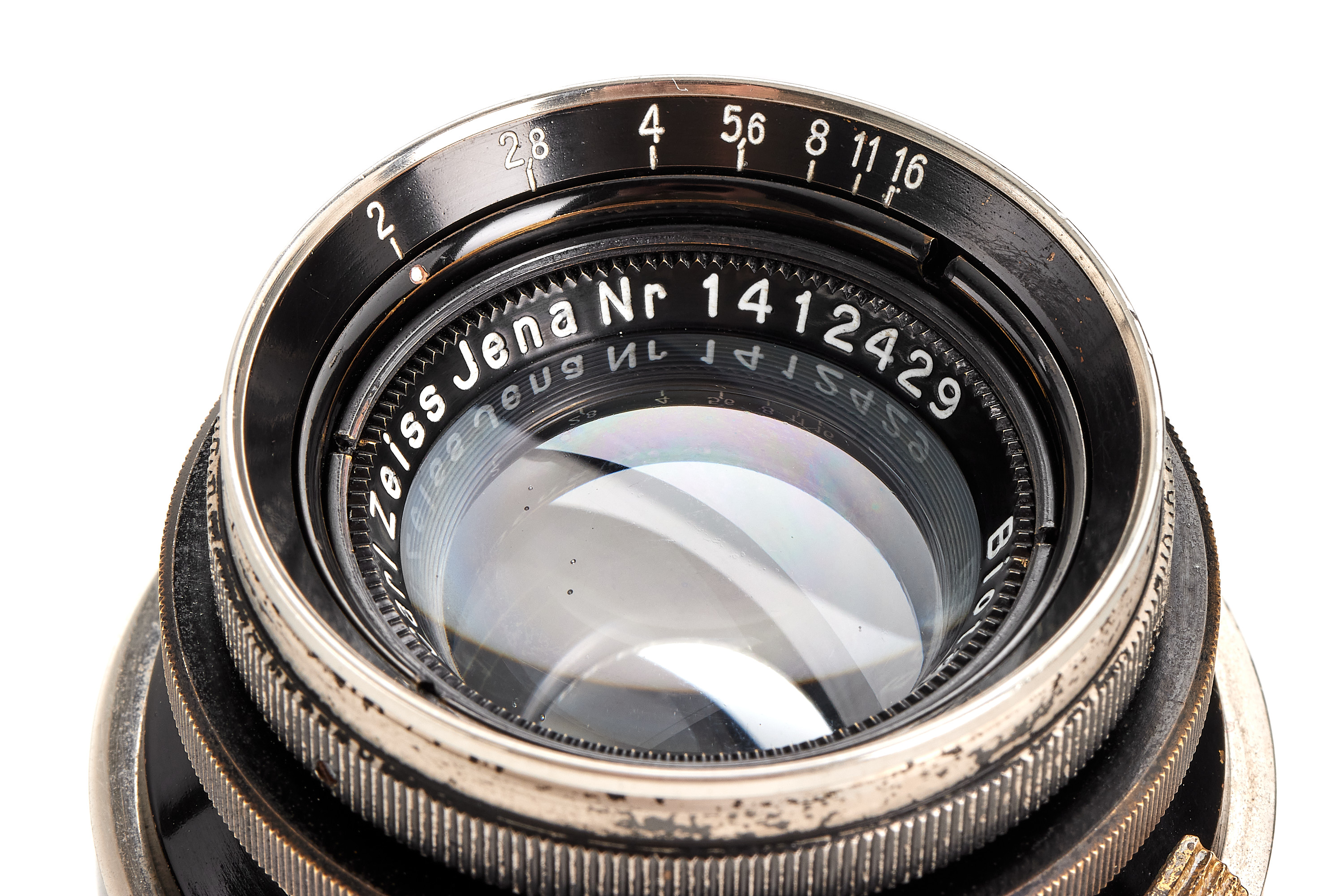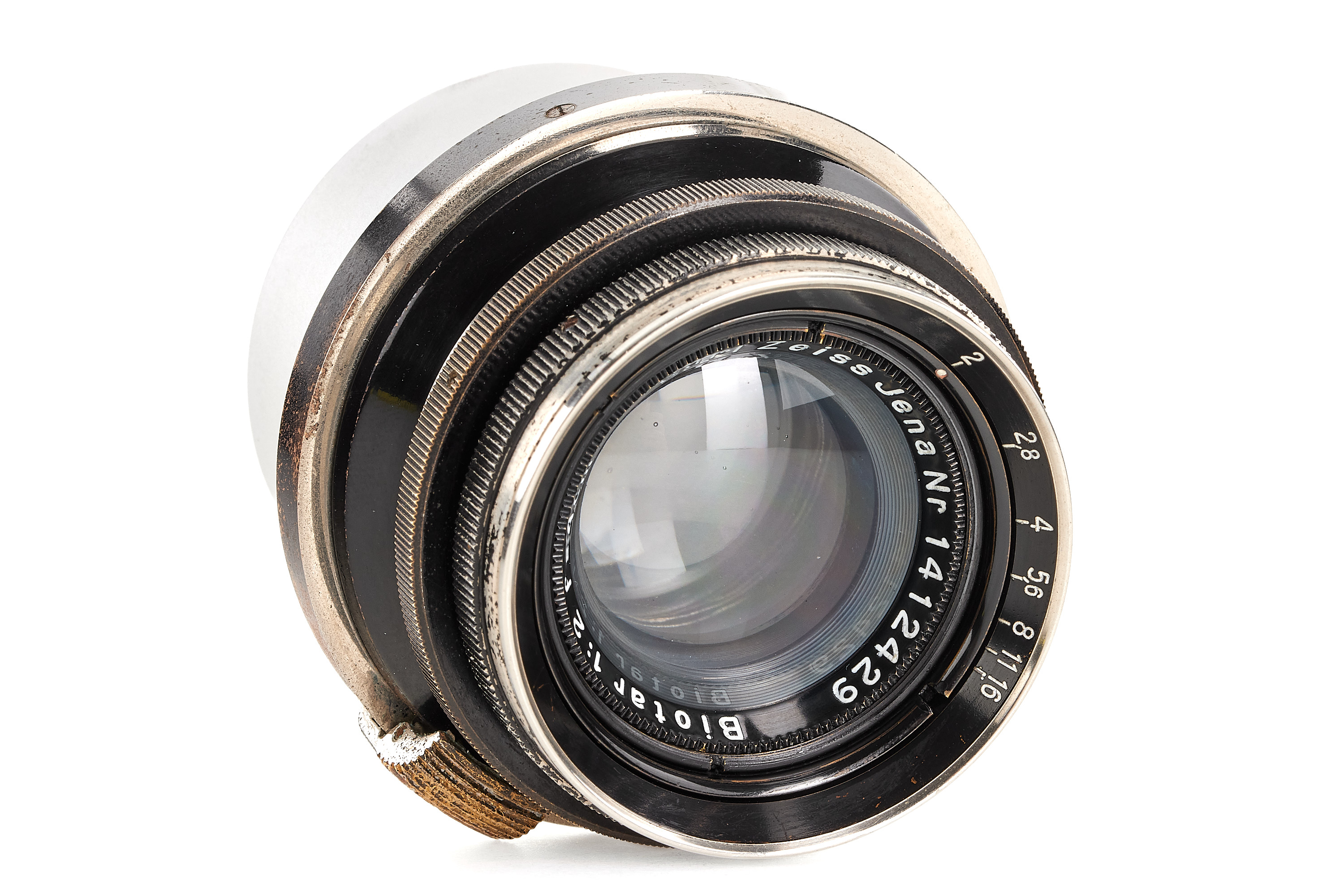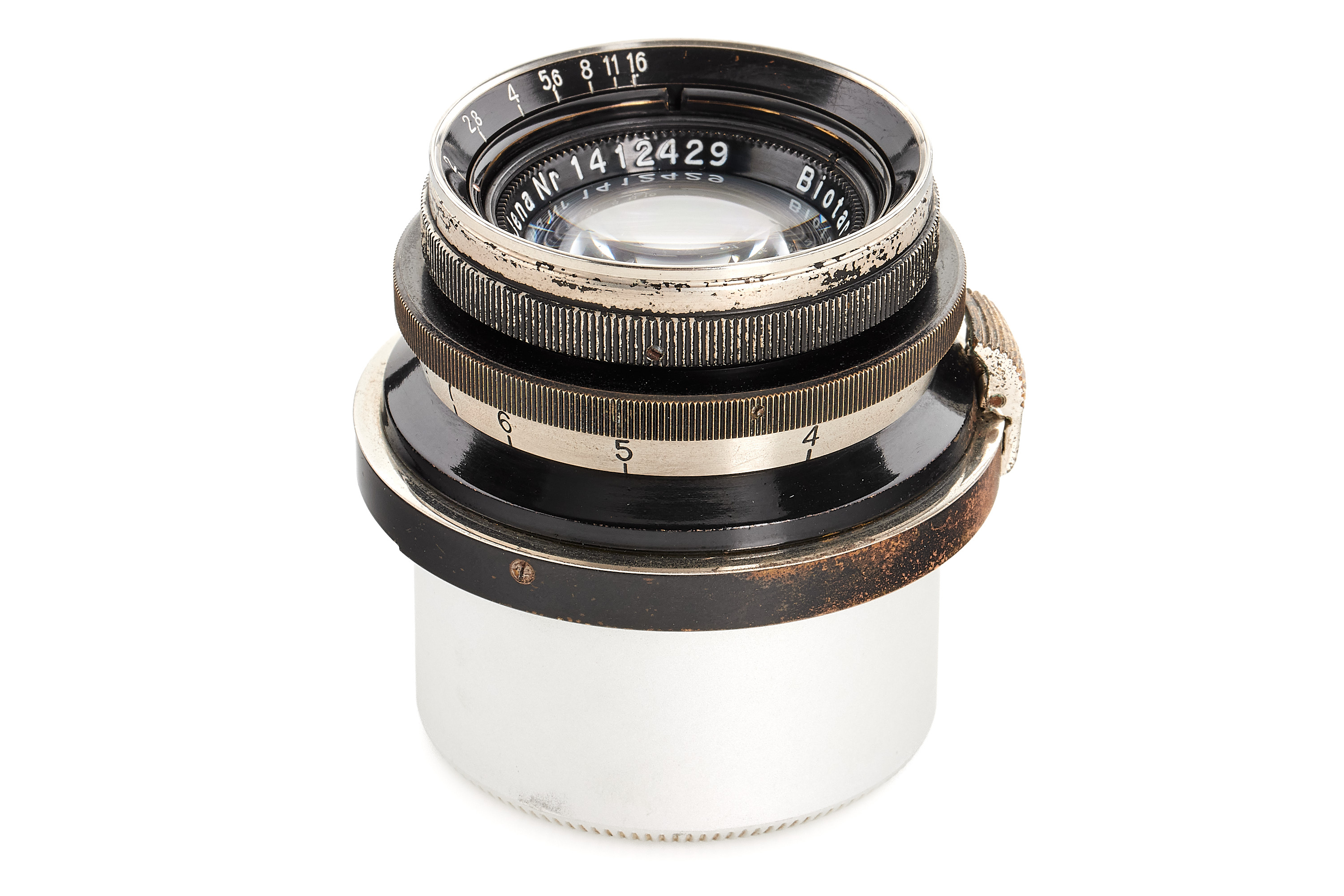 Very rare fast Biotar in original Contax mount, heavy brass barrel in black paint/nickel finish, feet scale, in good condition, optics only showing some cleaning marks and haze, note the unusual mount with 'Made in Germany' engravings in Chinese, with rear cap.