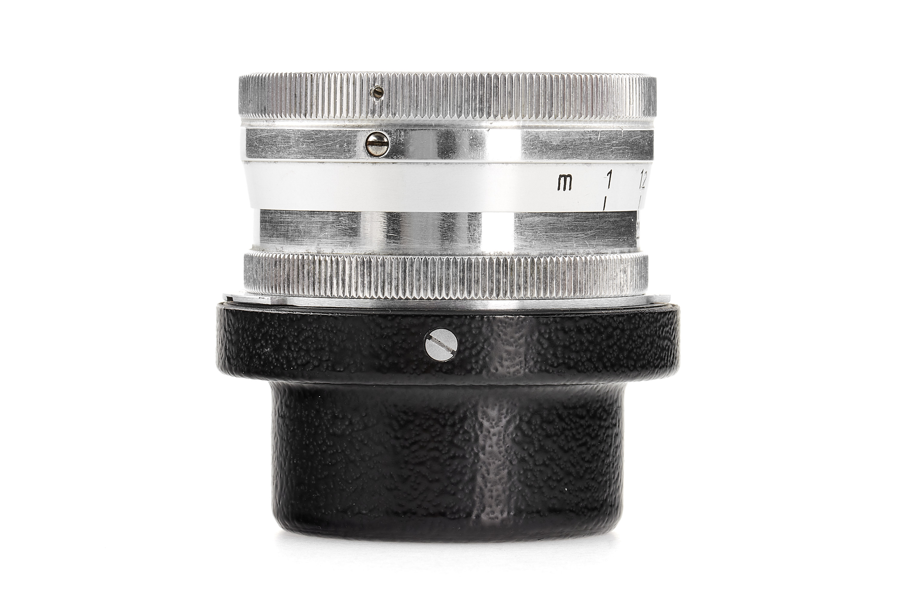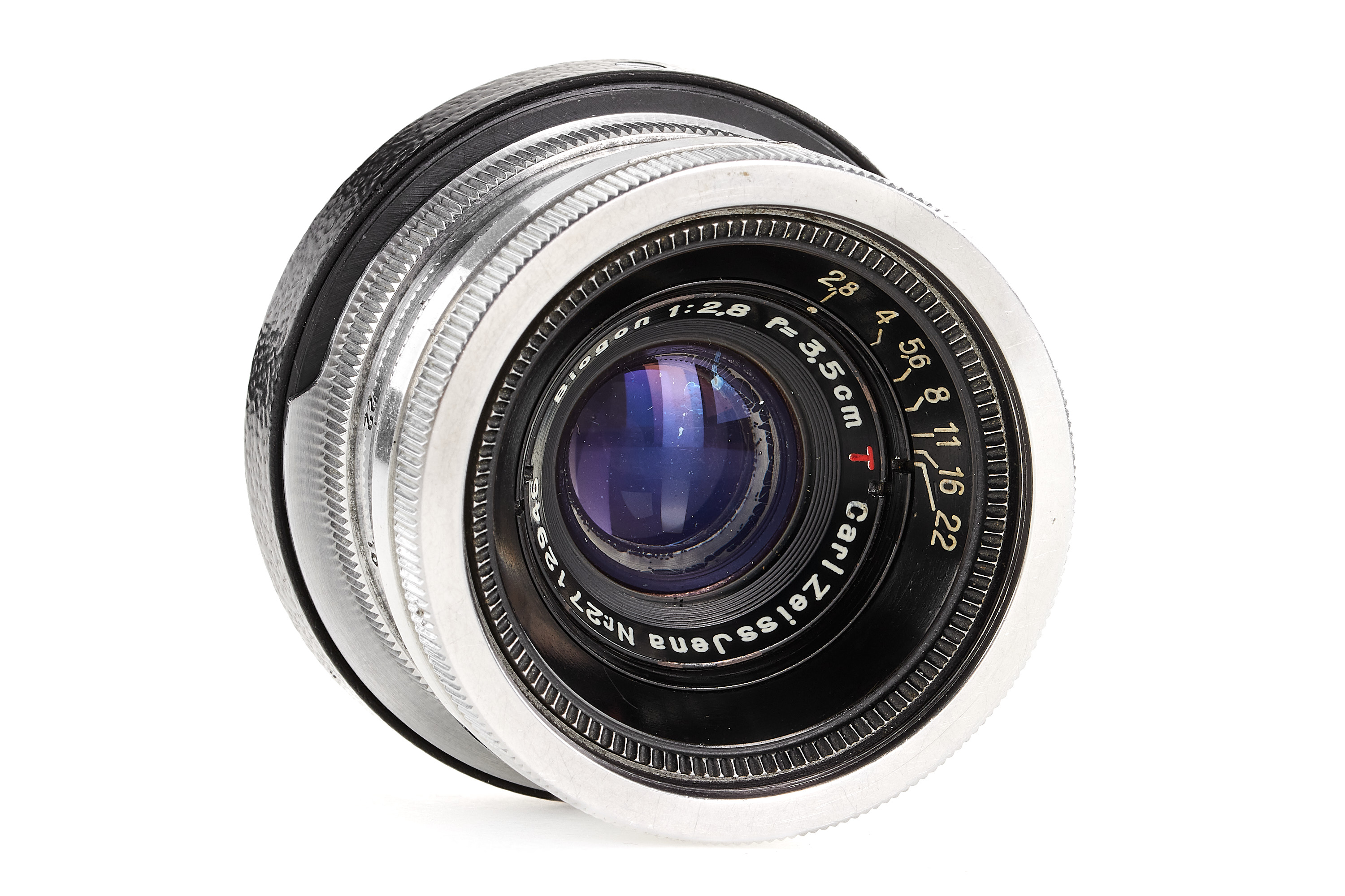 Rare RF coupled, war-time Biogon, one of only 400 lenses in original Leica M39 mount in a batch of 2000 produced in 1943, aluminium finish in almost mint condition, later high-polished, very early T coated optics showing some blemishes in the rear element and some cleaning marks on the front, with Leica M adapter and rear cap.