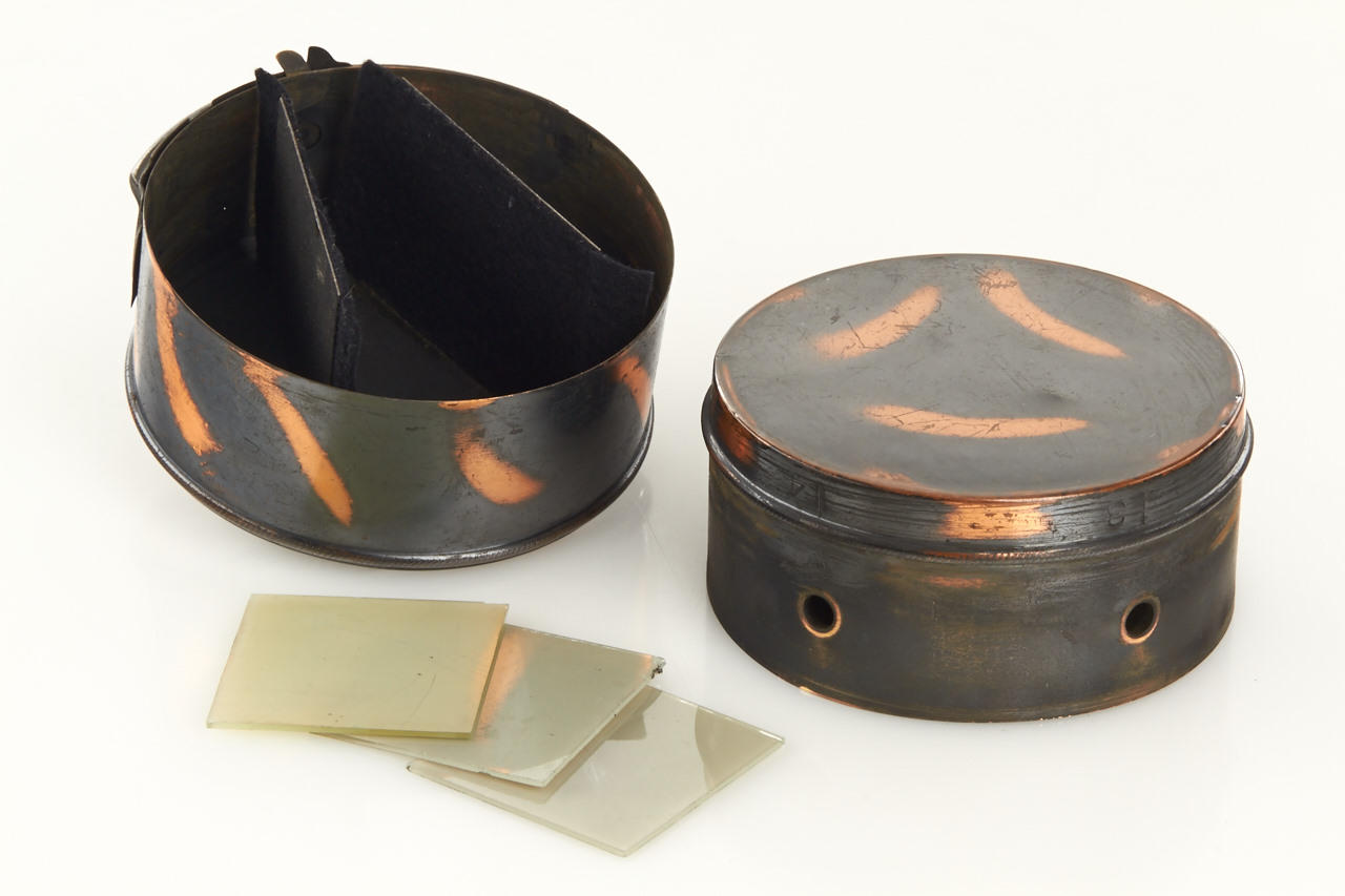 Seamless cylindrical camera for 5 exposures 5x5cm on plates, Achromat lens 14/120mm, rare and unusual. Designed by Henry E. Willsie of La Crosse Wisconsin. His camera was granted U.S. Patent 586,422 on the 29th September 1896 and was manufactured by the Chicago Camera Co., Illiniois, in beautiful fully original condition with finder and three 5x5cm glass plates