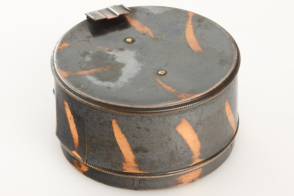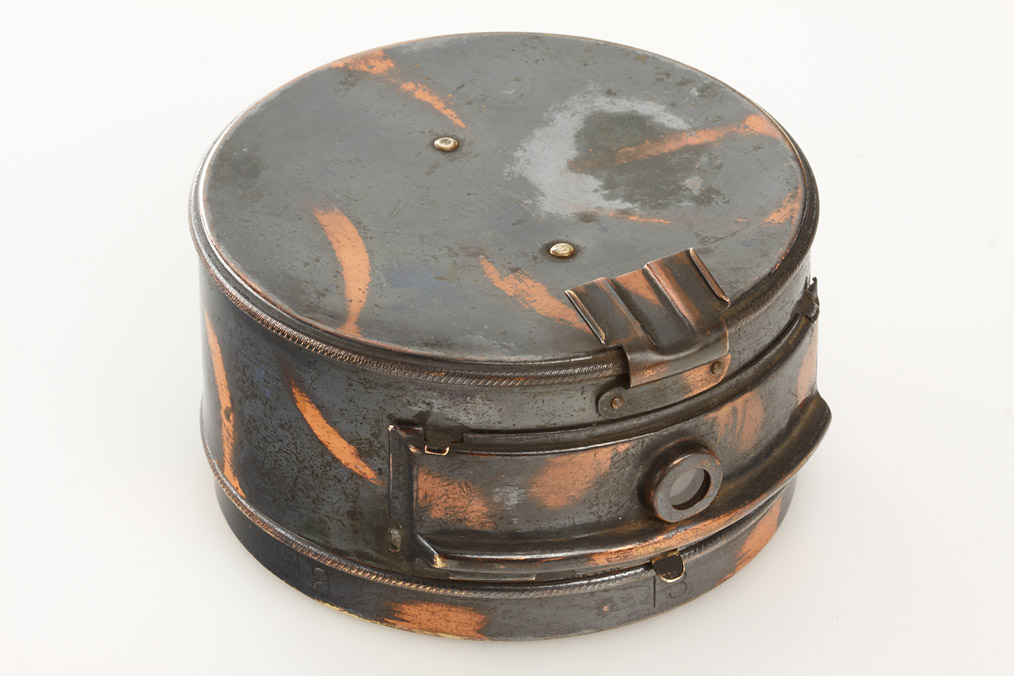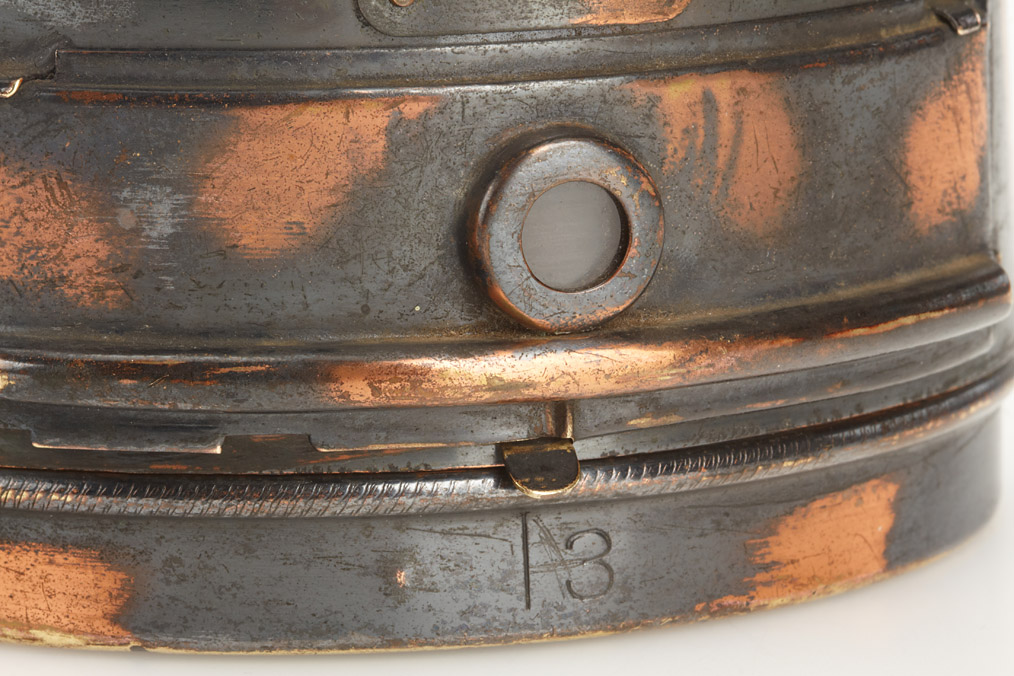 Seamless cylindrical camera for 5 exposures 5x5cm on plates, Achromat lens 14/120mm, rare and unusual. Designed by Henry E. Willsie of La Crosse Wisconsin. His camera was granted U.S. Patent 586,422 on the 29th September 1896 and was manufactured by the Chicago camera Co., Illiniois, with one exposed 5x5cm glass plate