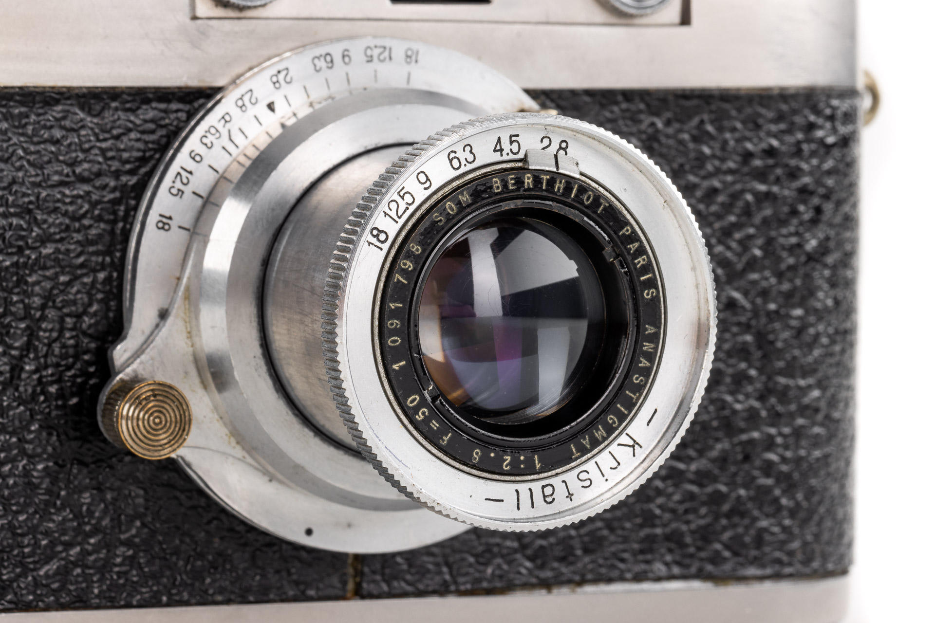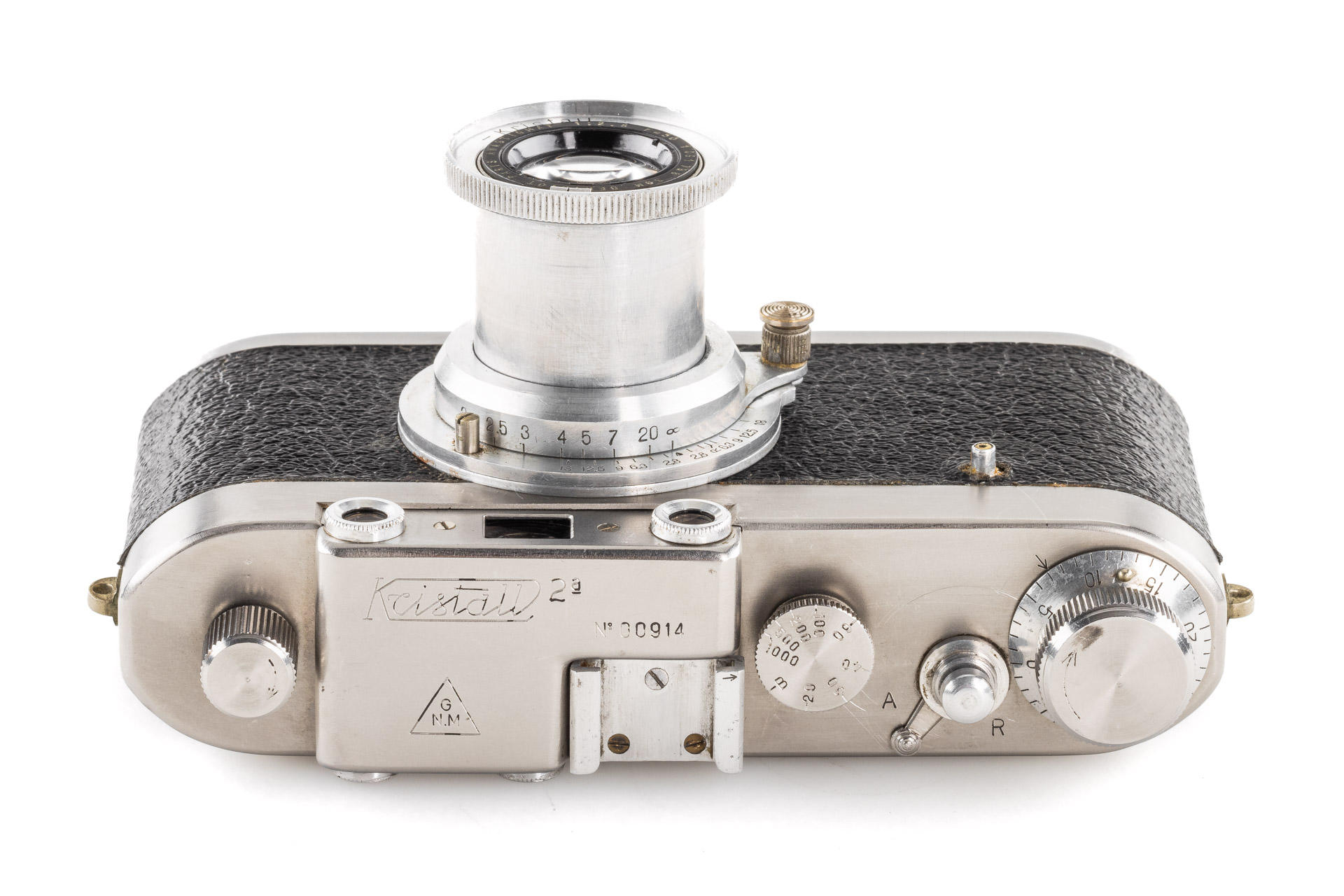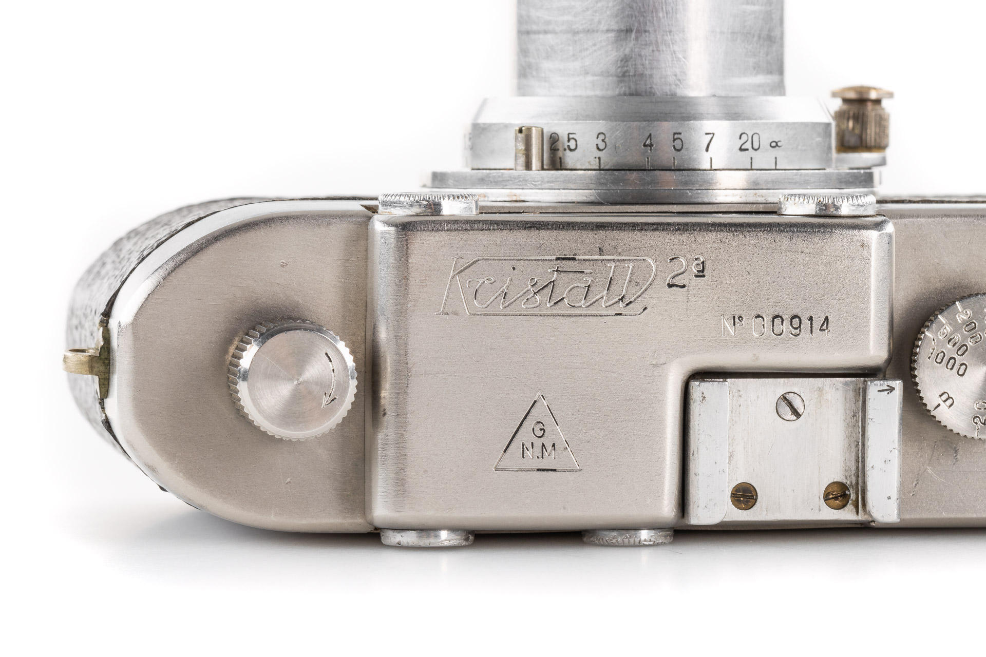 very rare Italian Leica copy in very good condition, well-contrasted rangefinder, sync. version, high-quality nickel finish with unique details like recessed rangefinder housing, with coated Som Berthiot Anastigmat 2.8/50mm no.1091798, the Kristall 2a was the first camera made by Domenico Chinaglia in Milan, Italy