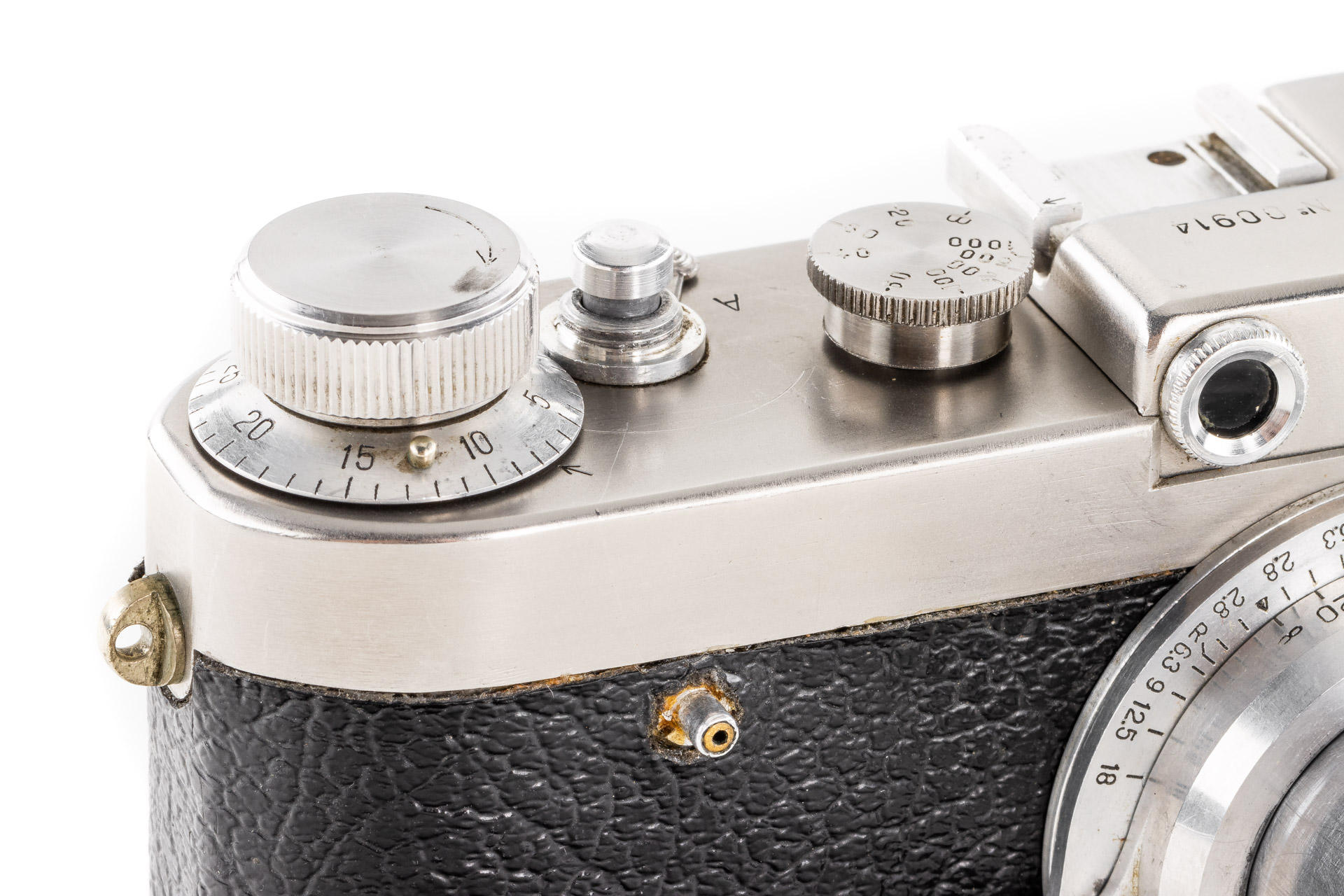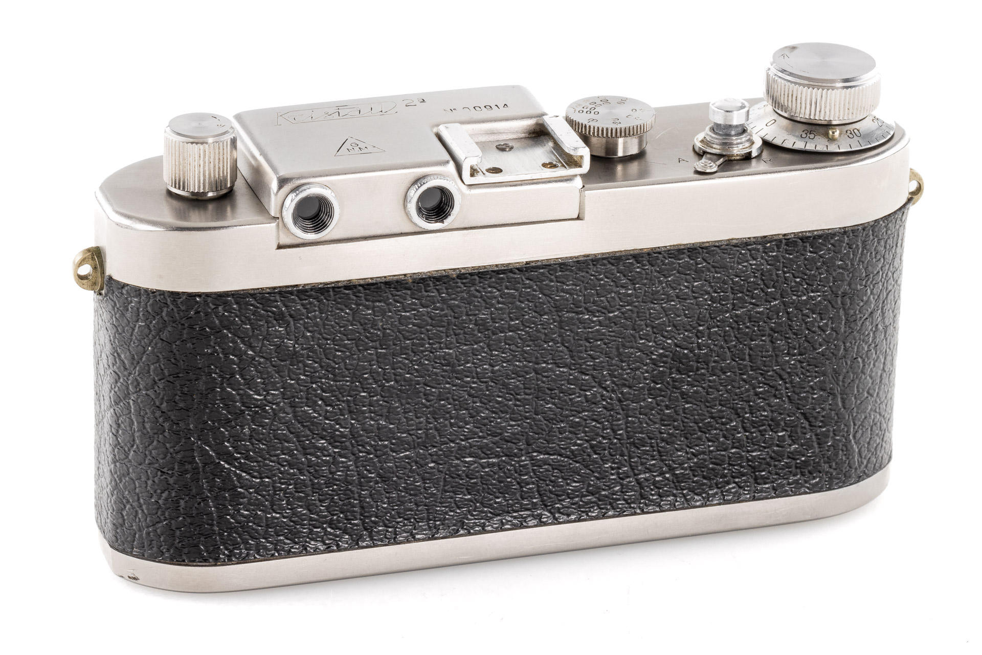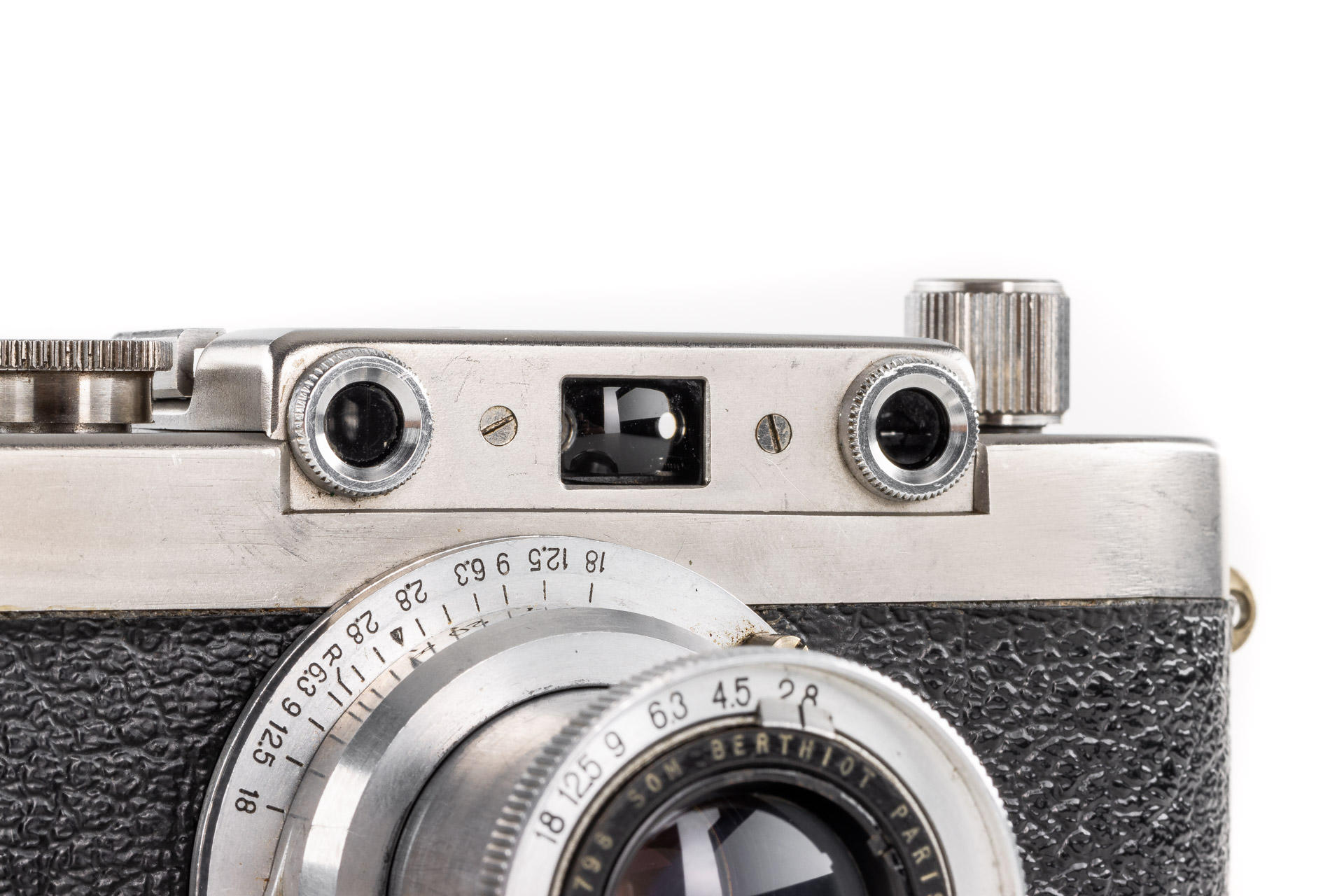 very rare Italian Leica copy in very good condition, well-contrasted rangefinder, sync. version, high-quality nickel finish with unique details like recessed rangefinder housing, with coated Som Berthiot Anastigmat 2.8/50mm no.1091798, the Kristall 2a was the first camera made by Domenico Chinaglia in Milan, Italy