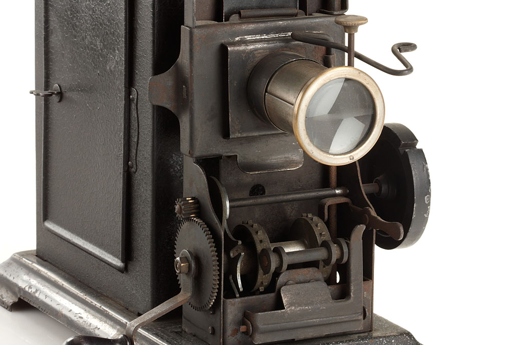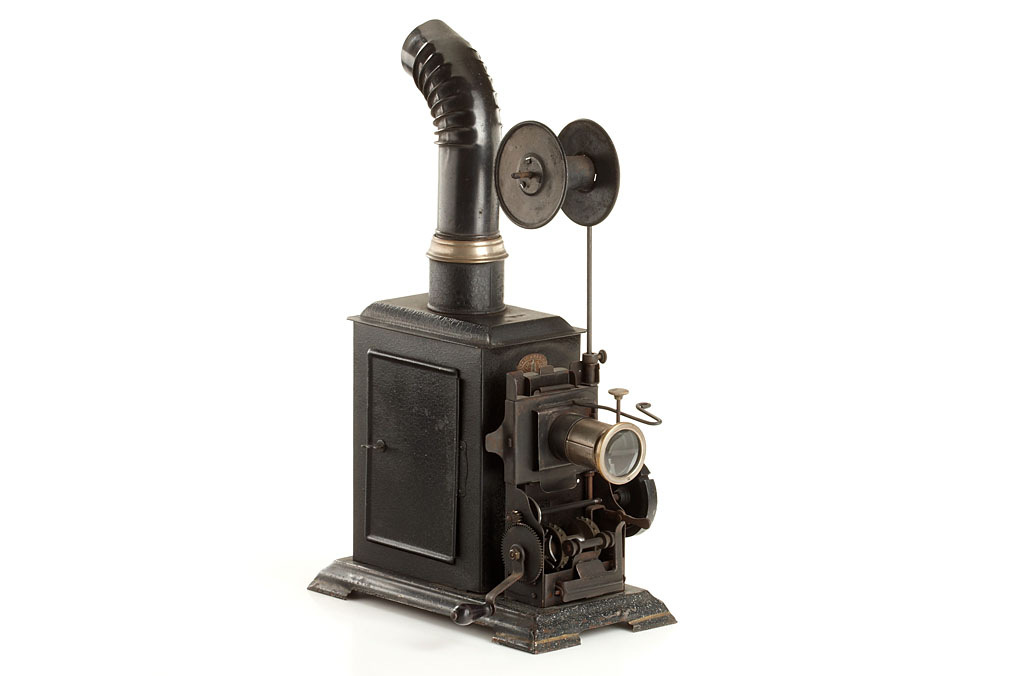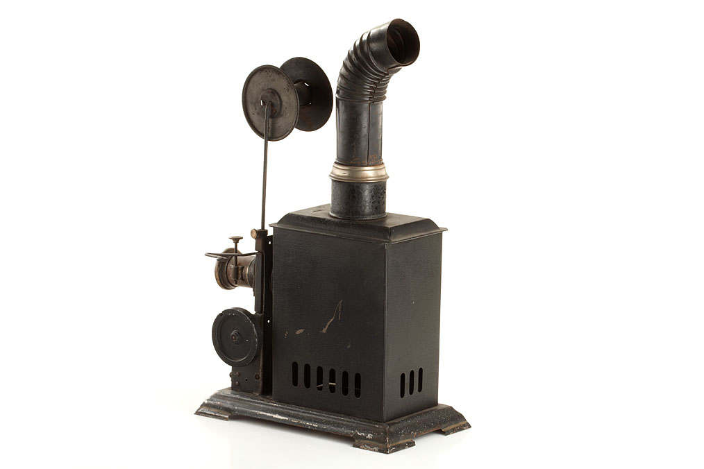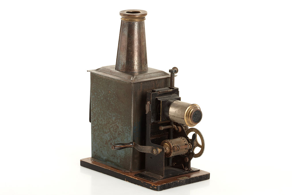 nice collection of three German lanterns equipped to project 35mm film, each approx. 35-40cm high, (1) Ernst Plank tin lantern with 'Russian Iron' finish mounted on wooden panel, significant crank operated large diameter transmission wheel on the right side, rotary shutter, brass made Malteser-intermission movement and sprocket wheel, complete with the original chimney, lens and film spool, embossed E.P. makers label on the front, later conversion to electric illumination, (2) Jean Falk, this model is not documented, but quite similar to the 1900 George Carette lantern, black lacquer finish, crank operated Malteser-intermission movement, complete with the original chimney, lens and film spool, the rotary shutter is missing, embossed 'J.F.' makers label on the front, (3) Gebrüder Bing, dark brown lacquer finish, brass made crank operated pull down mechanism, rotary shutter, with the original petrol burner, the chimney is not from this lantern but contemporary, the spool is missing, otherwise in nice condition.