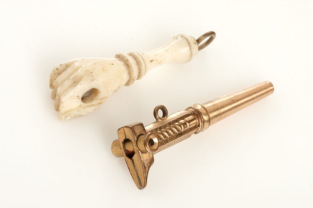 compilation of 6 Stanhope viewers: (1) metal combination bookmark and pencil, c.1900. 4 views of Banbury, (2) metal pencil in a shell, c.1890. 7 views: Robert Burns, (3) bone pen holder and letter opener, c.1910. 5 views: White Mountains, N.H., (4) metal tool charm, c.1910. 6 indistinct views, (5) bone hand charm, c.1890. McKee Dublin, 6 views of Appleby, (6) serpentine cauldron charm, c.1900. 6 views: Isle of Wight. Ex-Naylor Collection.