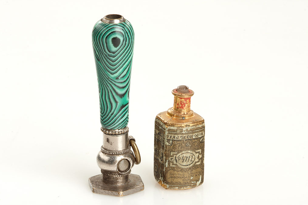 compilation of 6 Stanhope viewers: (1) red cut-glass perfume bottle, c.1890. McKee Dublin, 6 views of Rhyl, (2) bone domino charm, c. 1870. Single image: Le Rendez-vous. (Some glue bubbles), (3) wooden smokers’ compendium. Image: Bayrische Gewerbeschau München 1912, (4) metal and galalite seal/pencil fob. McKee Dublin, 6 views of Haawarden, (5) Corozo and bone barrel measure, c.1910. Single view: St. Anne de Beaupré, (6) metal 4711 cologne bottle charm, c.1900. Single view (few bubbles); Koelner Dom. Ex-Naylor Collection.