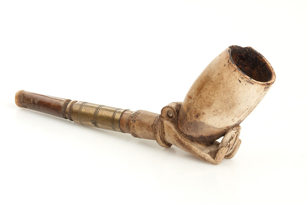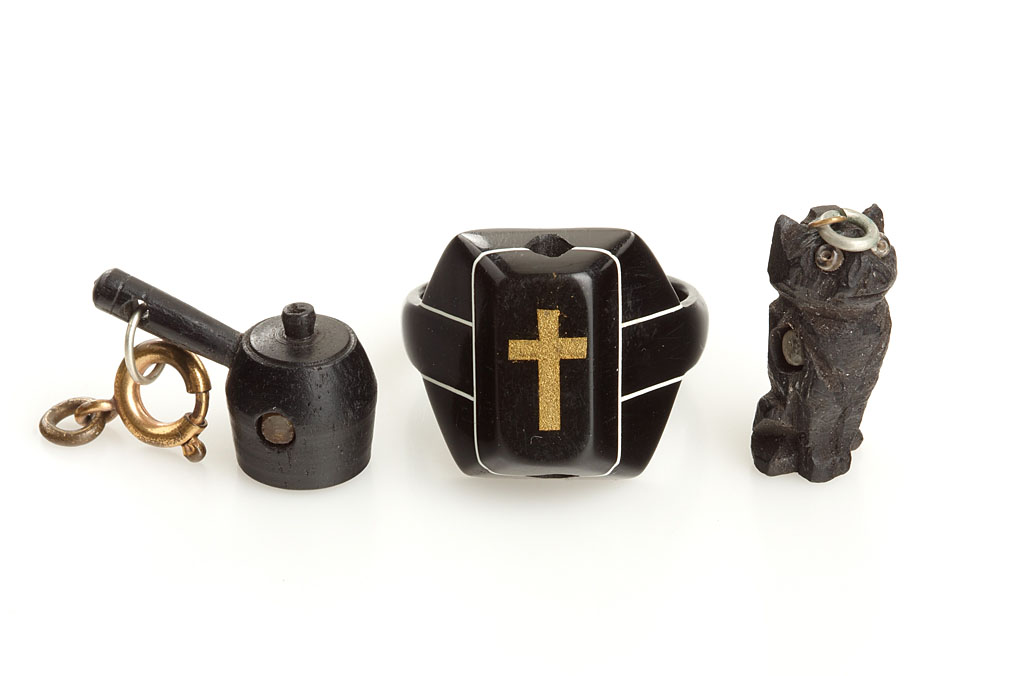 compilation of 5 Stanhope viewers: (1) Meerschaum pipe (worn), c. 1900. Single view: Toulouse, (2) Swiss ebonite horn needle case, c.1900. Single view: Der Löwe von Luzern, (3) ebonite ring, c.1900. Indistinct text image, (4) bog oak cat charm, c.1900. 6 views: Isle of Wight, (5) bog oak saucepan charm, c.1890. McKee Dublin, 6 views of Withernsea. Ex-Naylor Collection.