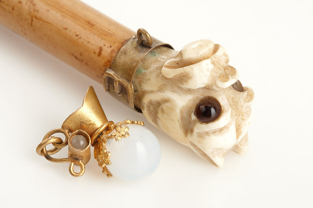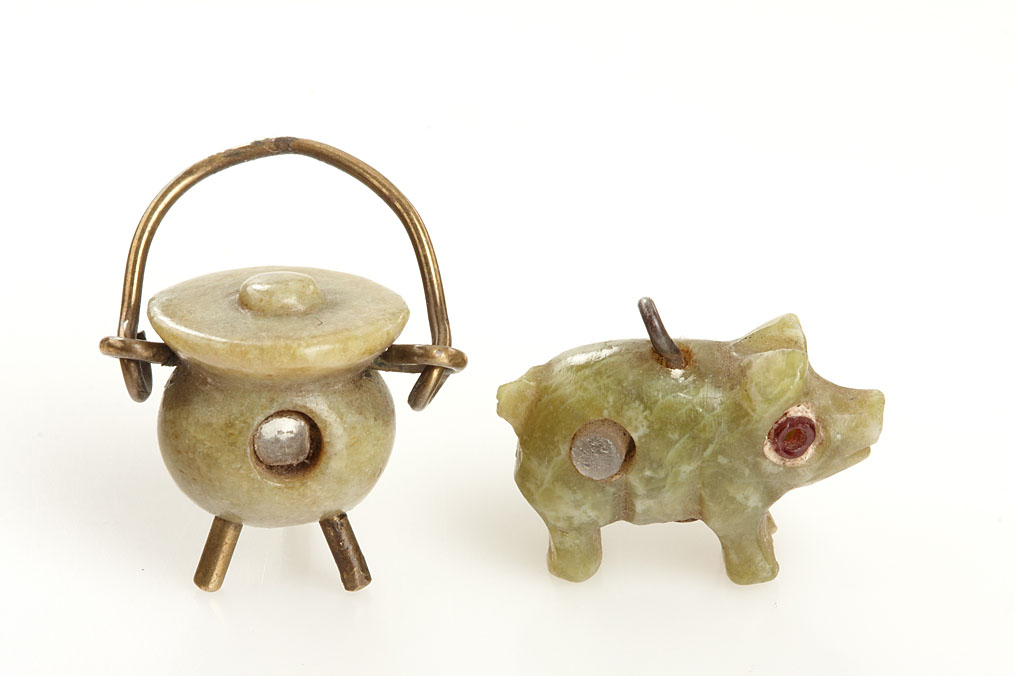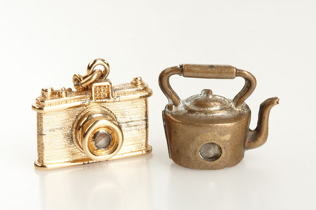 compilation of 6 Stanhope viewers: (1) gold plated and glass pitcher charm, c. 1890 McKee Dublin 6 views Welshpool, (2) bone carved dog head on wood handle, c.1900 single view of Long Stairs Watkins Glen, (3) gold plated camera charm, c.1960. Image missing, (4) serpentine pig charm, c.1900. 6 views of Dublin, (5) brass kettle charm, c.1900. McKee Dublin, 6 views of Tunbridge Wells, (6) serpentine cauldron charm, c.1900. McKee Dublin 6 views of Halstead. Ex-Naylor Collection.