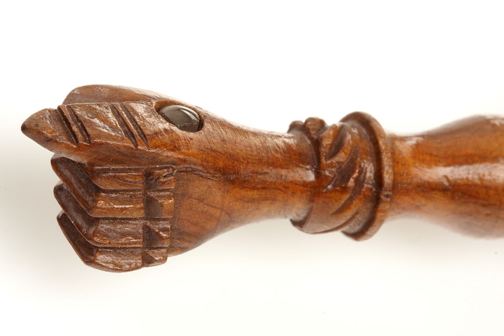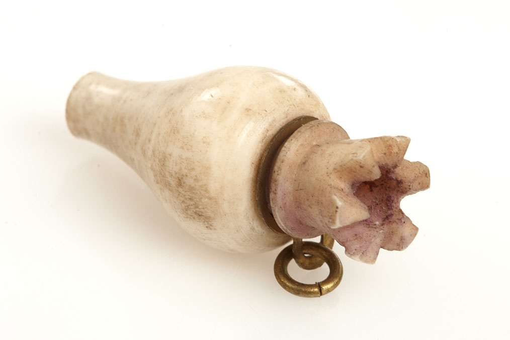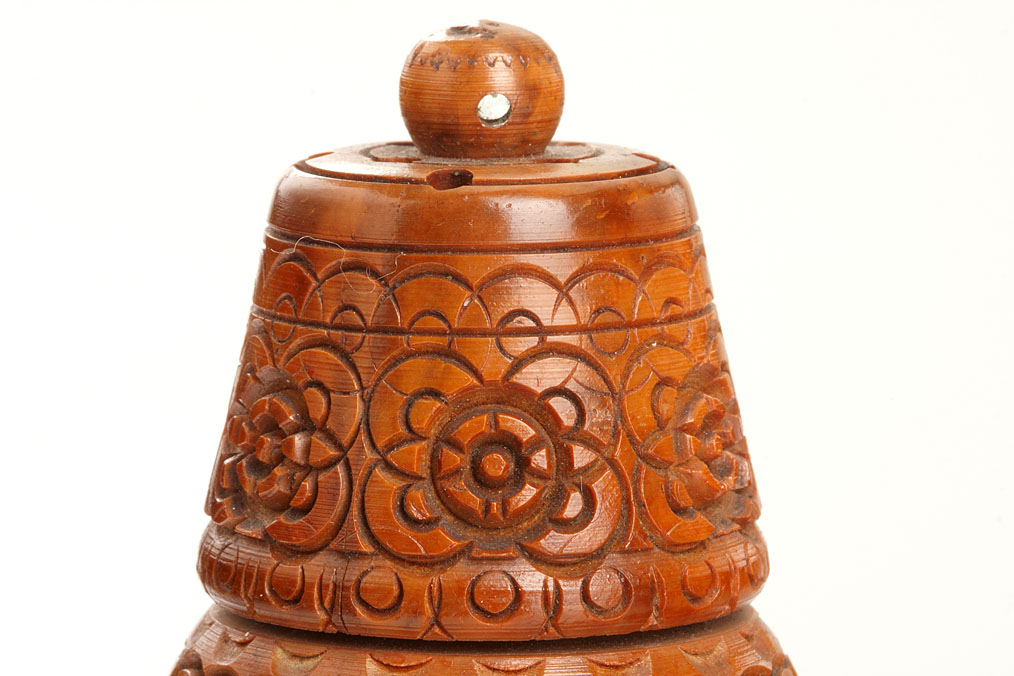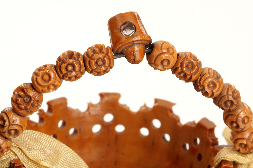compilation of 5 Stanhope viewers: (1) Coquilla nut basket with beaded handle, c.1900. Single view: La Roche Eponge/Fontainebleau, (2) wooden parasol needle case, c. 1890. 6 views of Exeter, (3) Coquilla shaker, c. 1880. Single view: St. Nazaire, (4) metal rhinestone pendant crucifix, c.1960. Single view: The Lord’s Prayer, (5) bone radish charm, c.1880. Image missing. Ex-Naylor Collection.