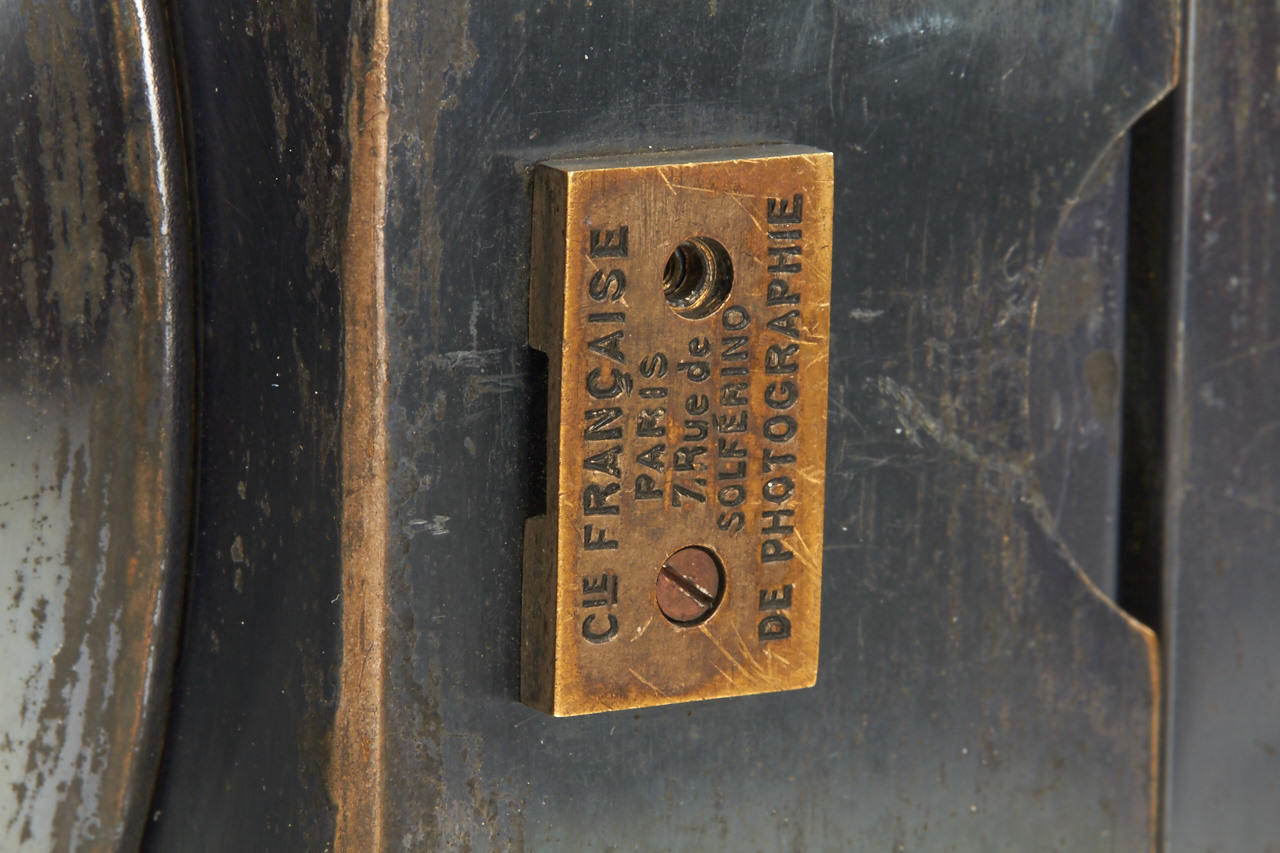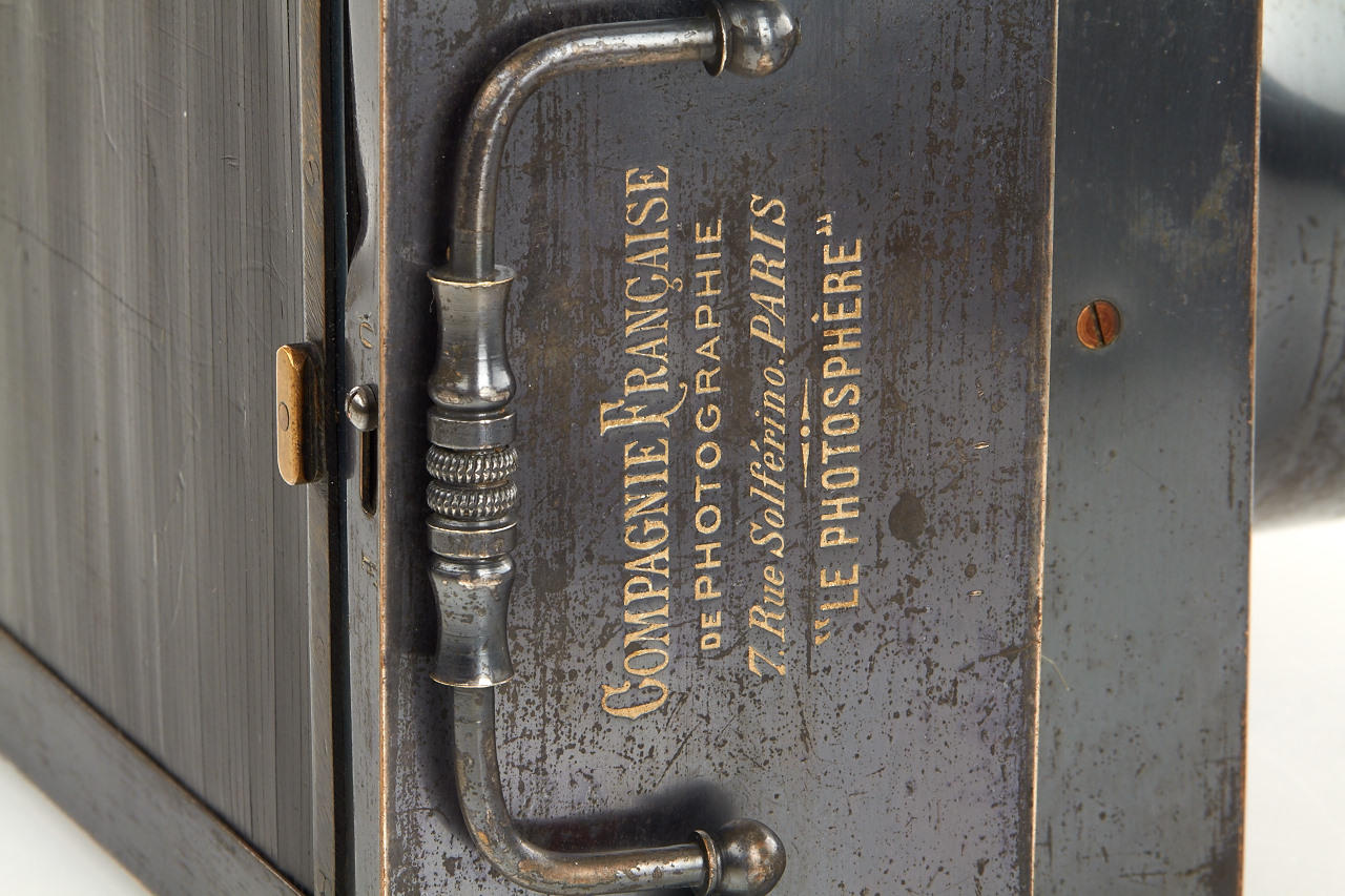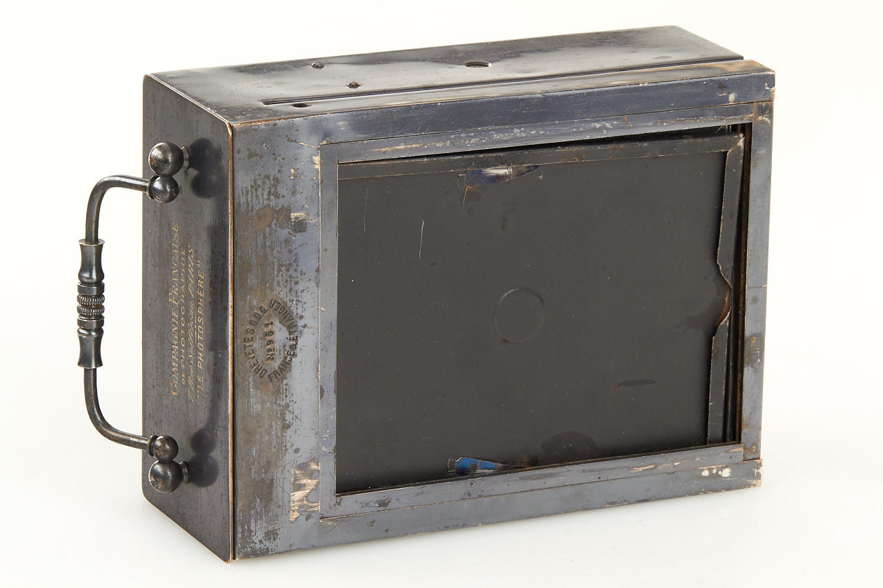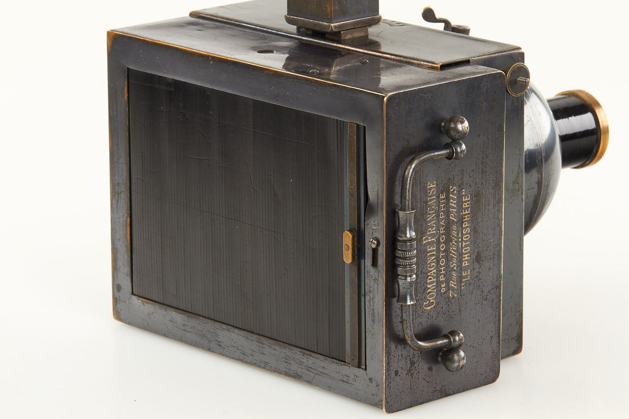 9x12cm, anodised metal body, hemispherical shutter, original lens, original finder, rare with plate magazine back no. 951 for 12 plates and handle engraved: COMPAGNIE FRANCAISE DE PHOTOGRAPHIE 7.Rue Solferino. PARIS "LE PHOTOSPHERE", camera and magazine in fine original condition