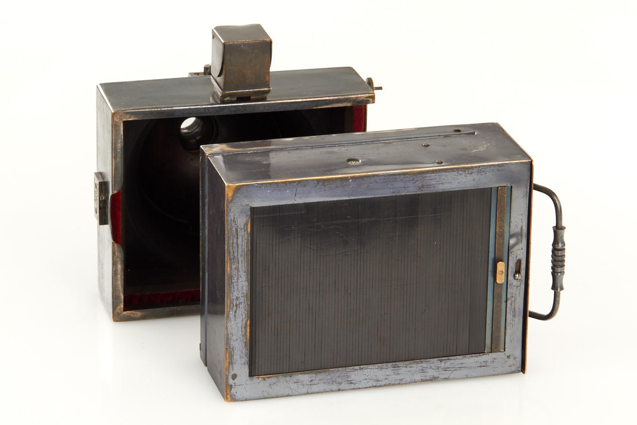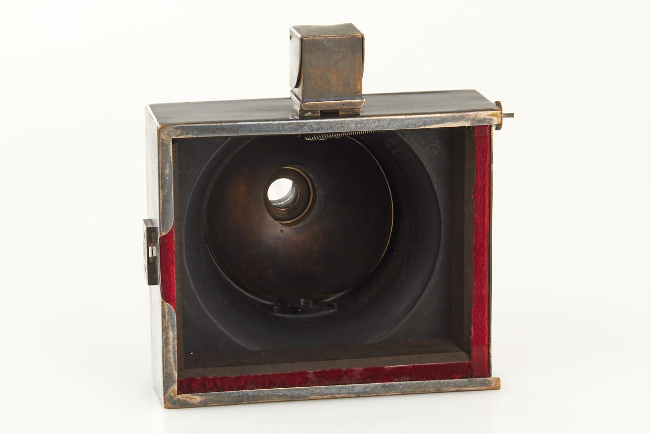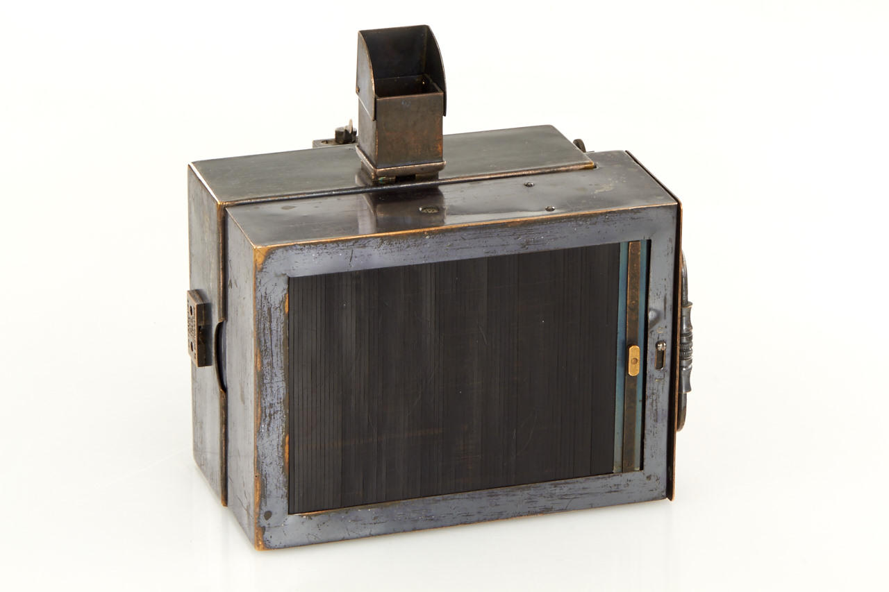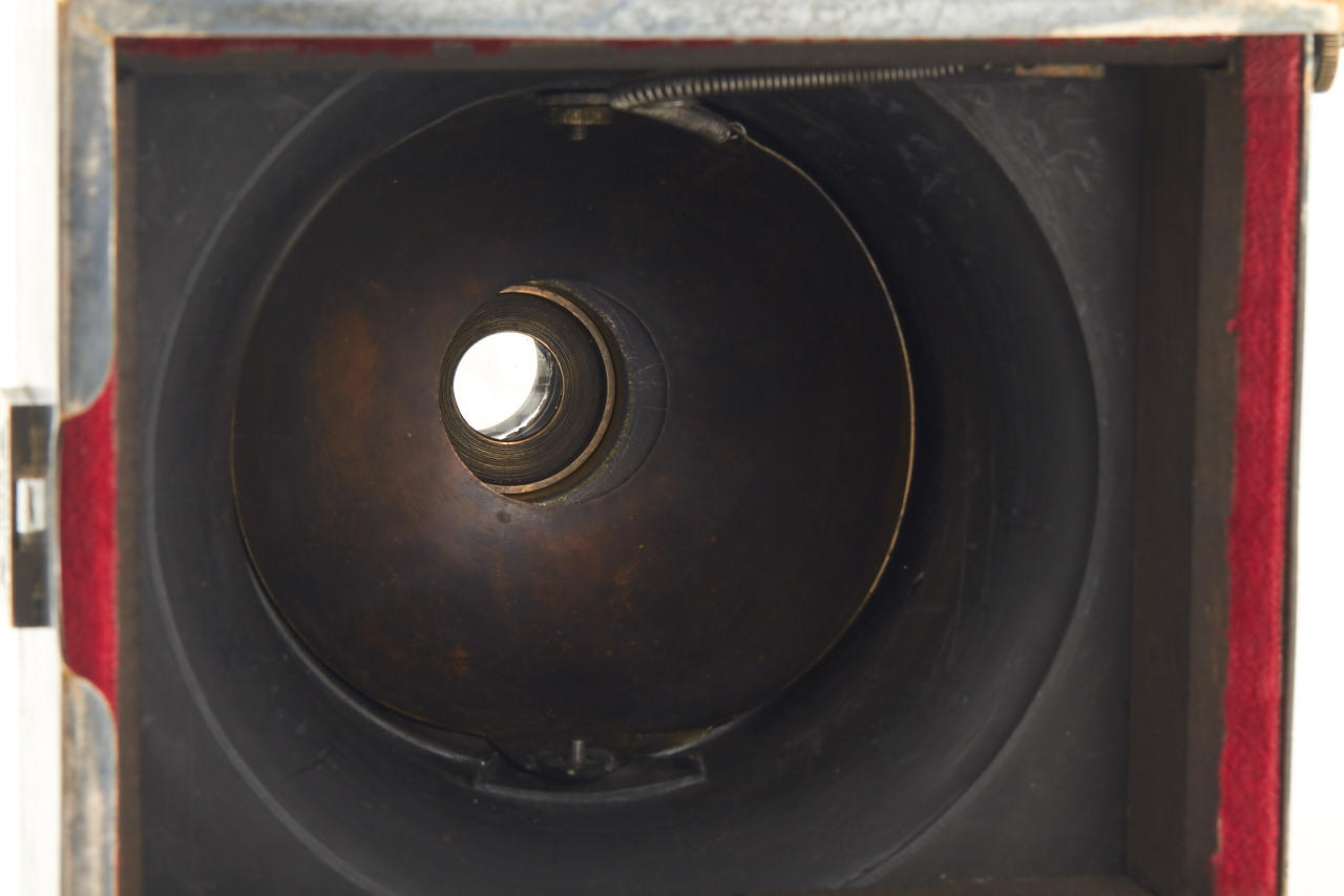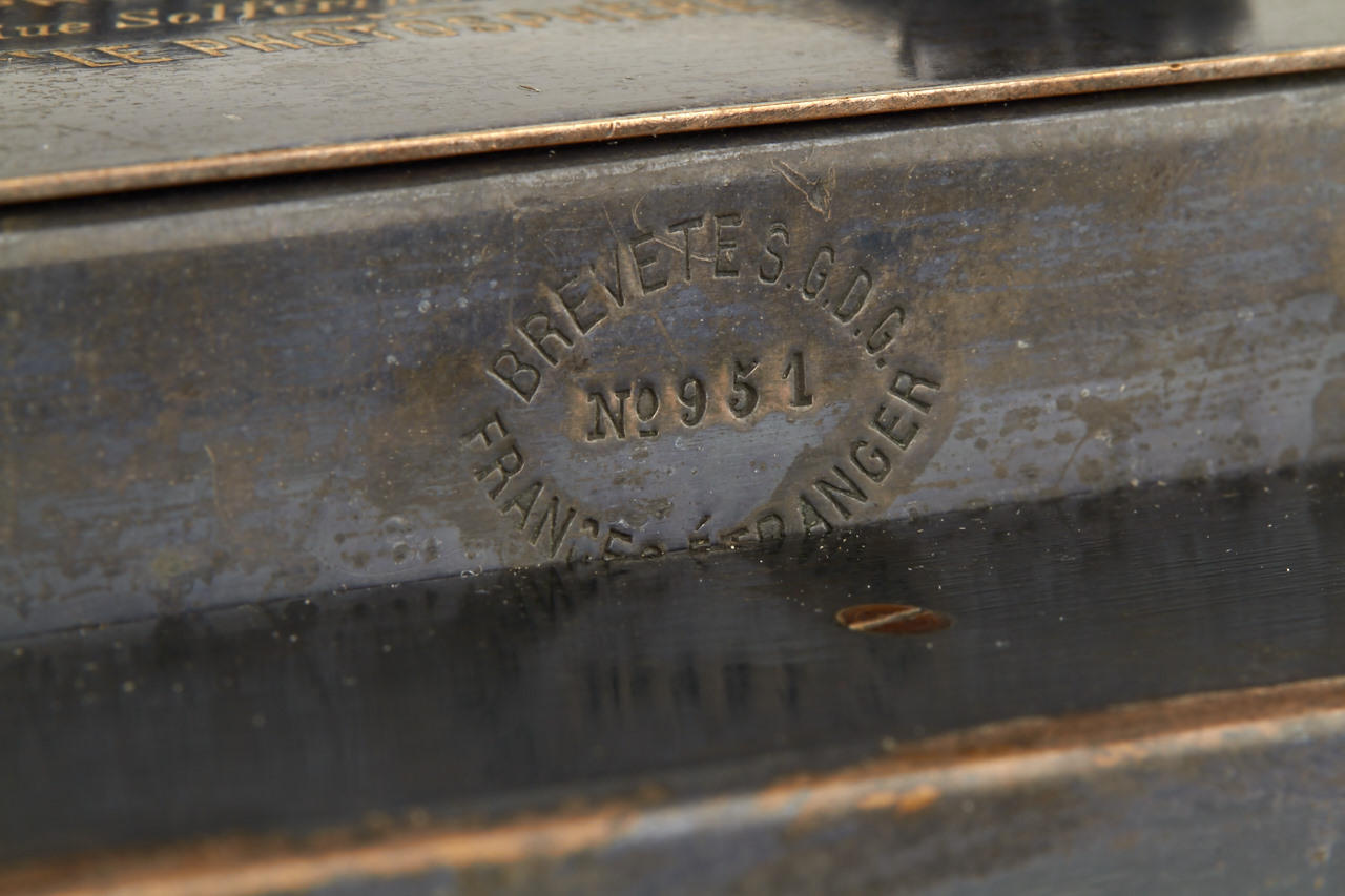 9x12cm, anodised metal body, hemispherical shutter, original lens, original finder, rare with plate magazine back no. 951 for 12 plates and handle engraved: COMPAGNIE FRANCAISE DE PHOTOGRAPHIE 7.Rue Solferino. PARIS "LE PHOTOSPHERE", camera and magazine in fine original condition