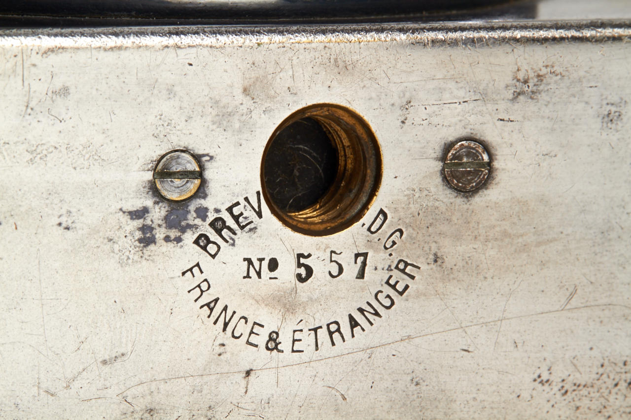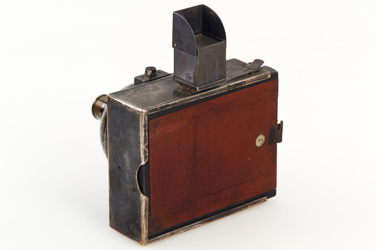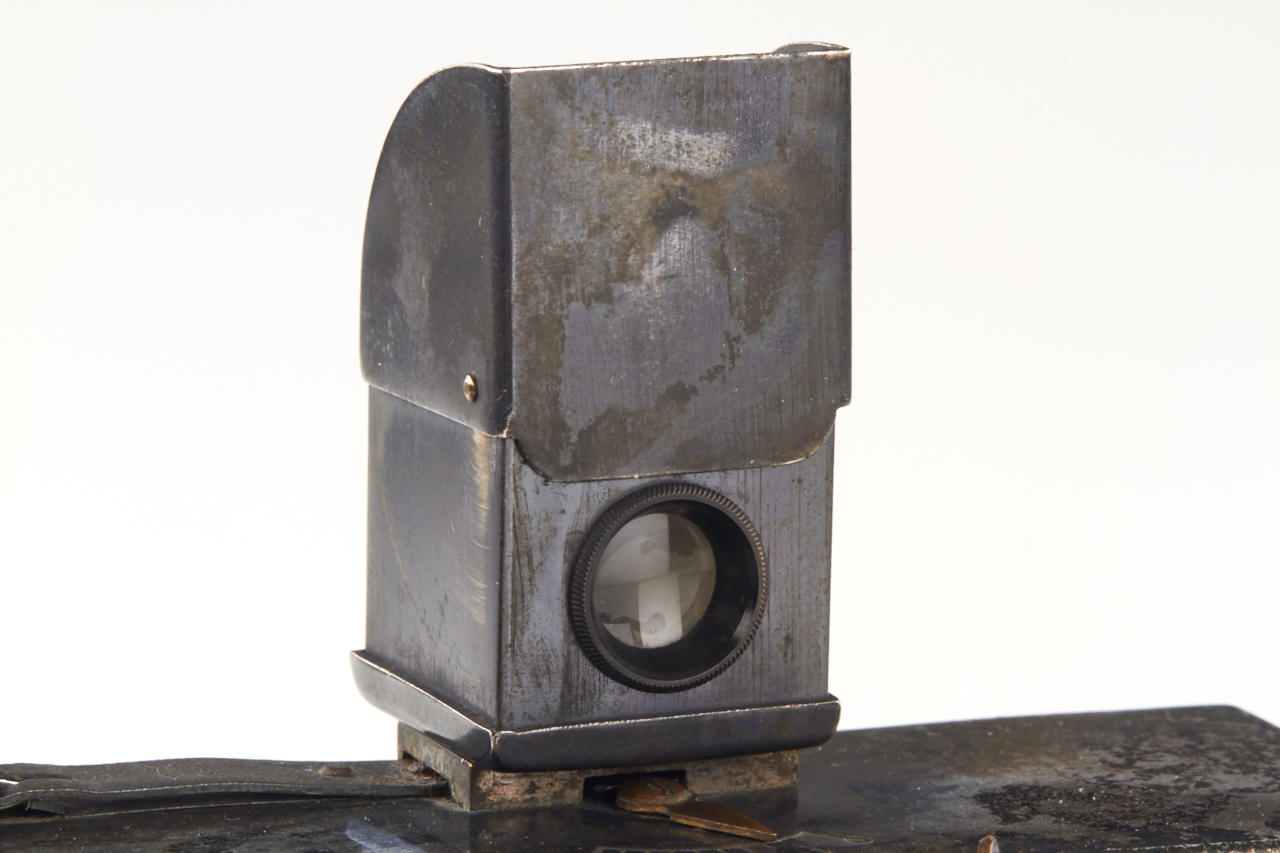 very rare small 8x9cm version, one of the first all-metal cameras in good original and working condition, original lens, attached original finder, with three matching film holder