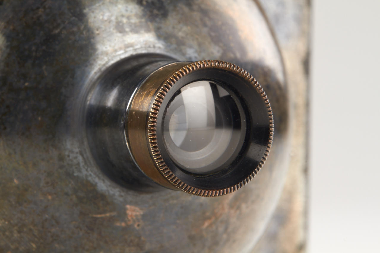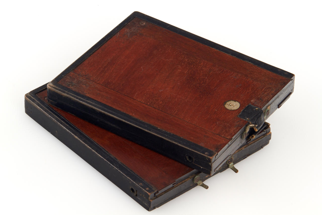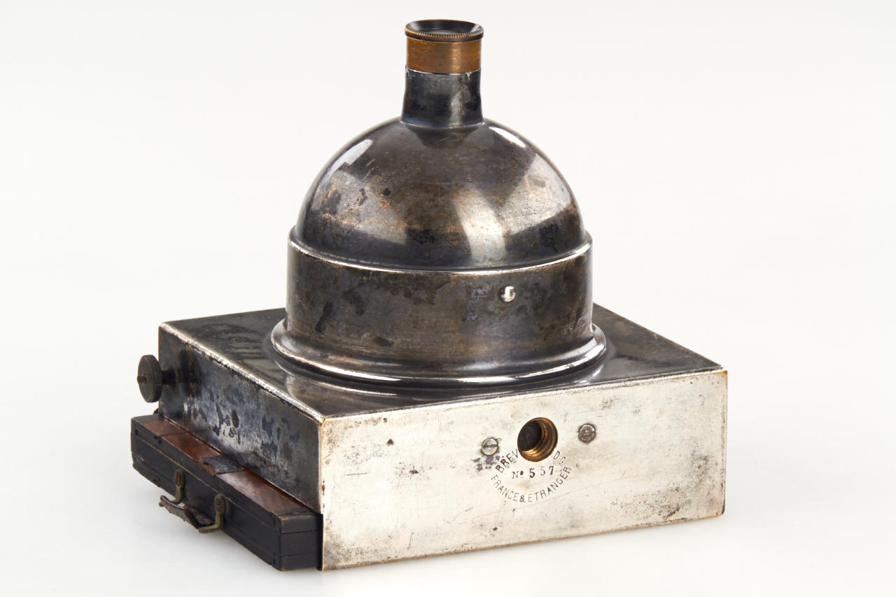 very rare small 8x9cm version, one of the first all-metal cameras in good original and working condition, original lens, attached original finder, with three matching film holder