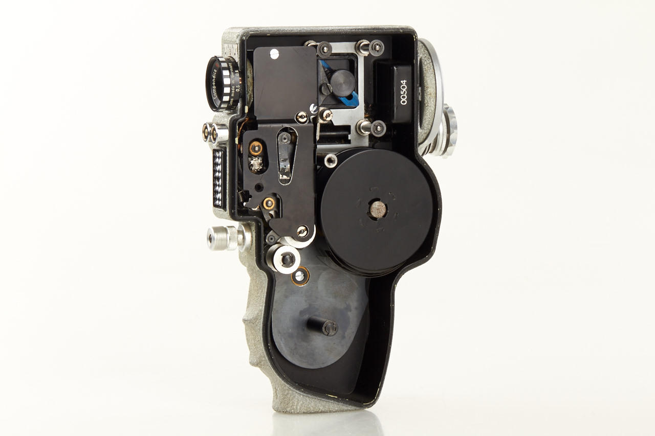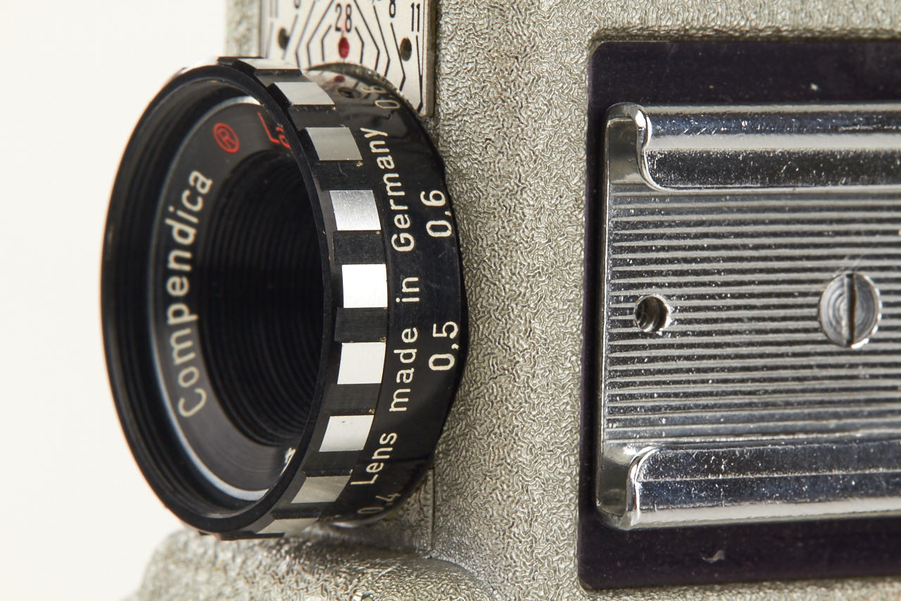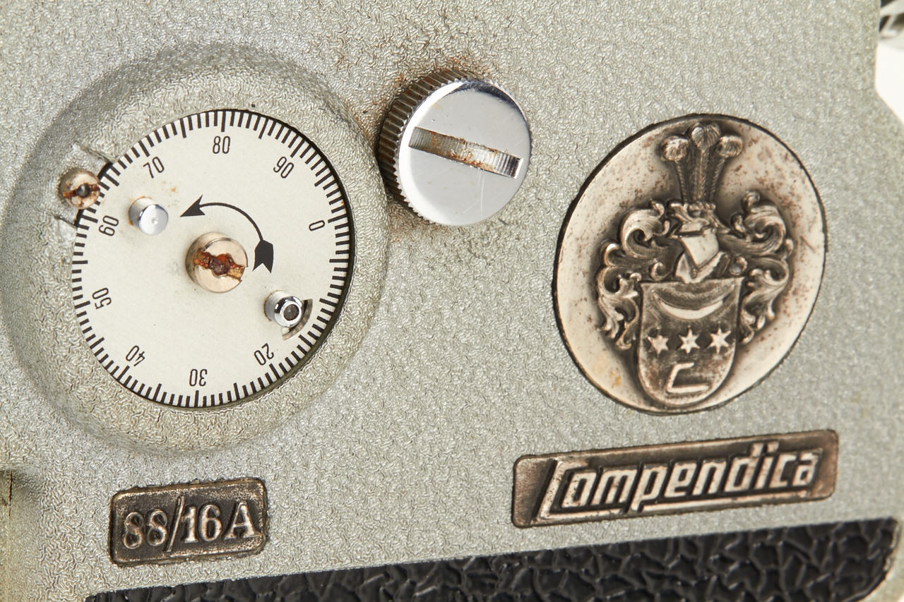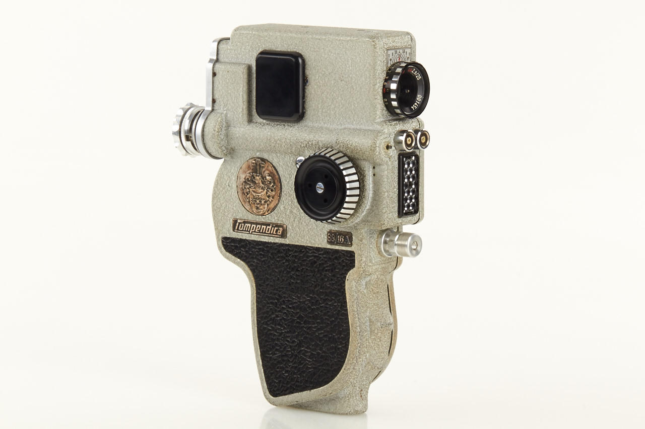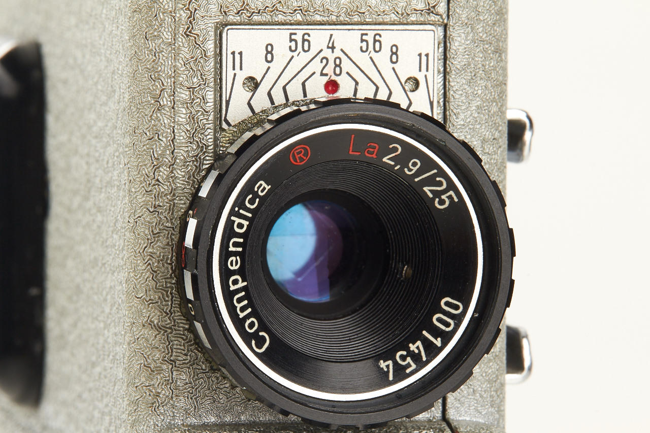 probably unique and the only camera ever made in Liechtenstein, for still and motion pictures, for 10x15mm on double 8mm film or 12x18mm exposures on 16mm film, provision for built-in microphone, so the photographer could comment his shots - an idea that came to life around 40 years later in professional press cameras, cast aluminium body in crinkle finish, serial number engraved inside, with Compendica La 2.9/25mm lens ('Lens made in Germany' printed on the side), built-in selenium meter, spring-driven film transport, ex Christies auction 'Spy, Subminiature and Detective Cameras' from December 1991, this camera is described in Michael Pritchard's "Spy Camera" on page 88 and 89